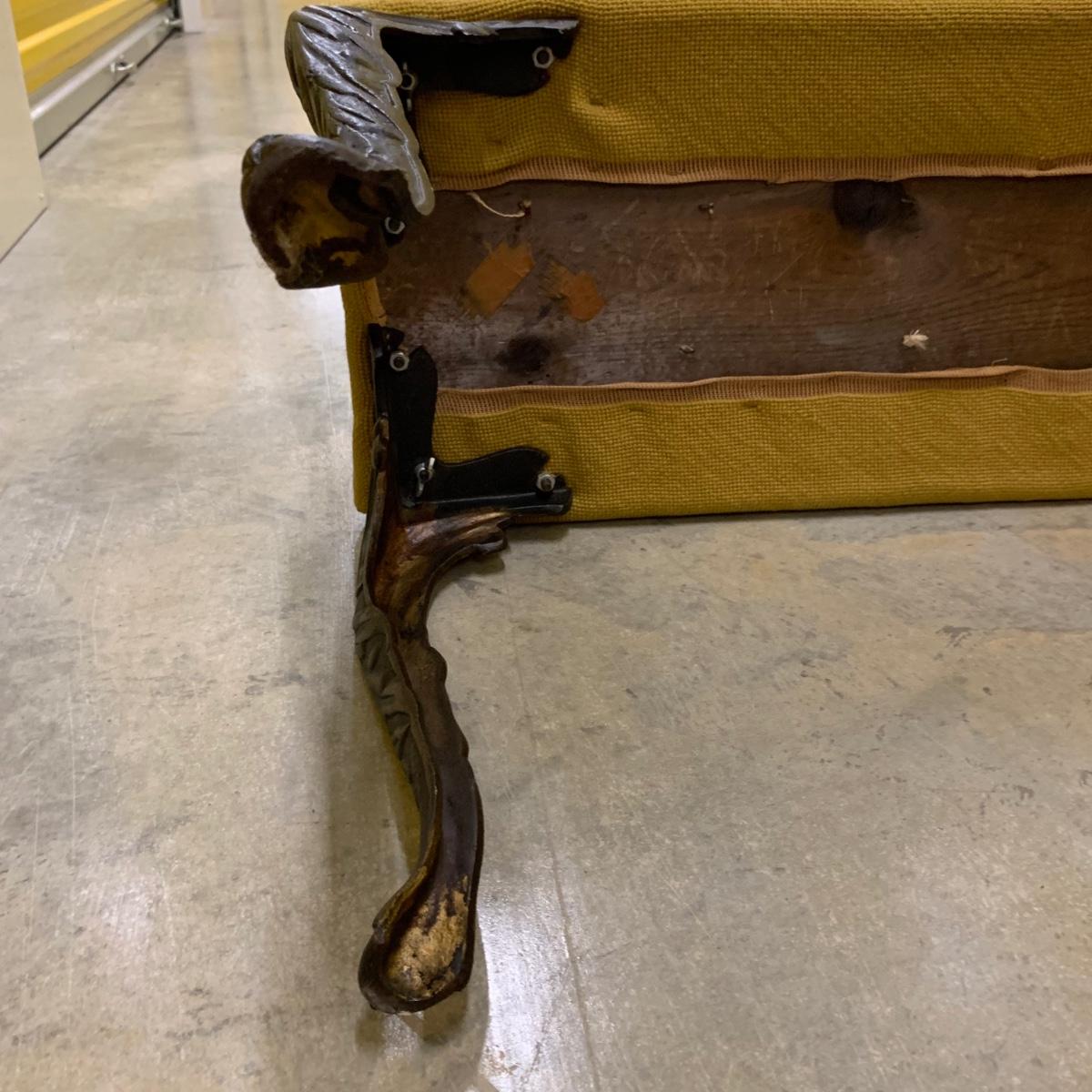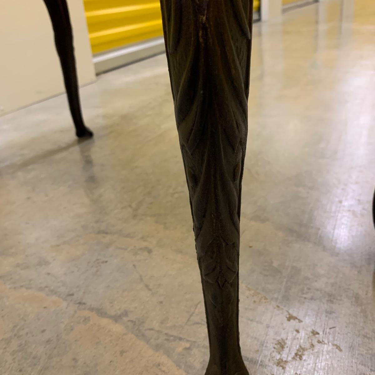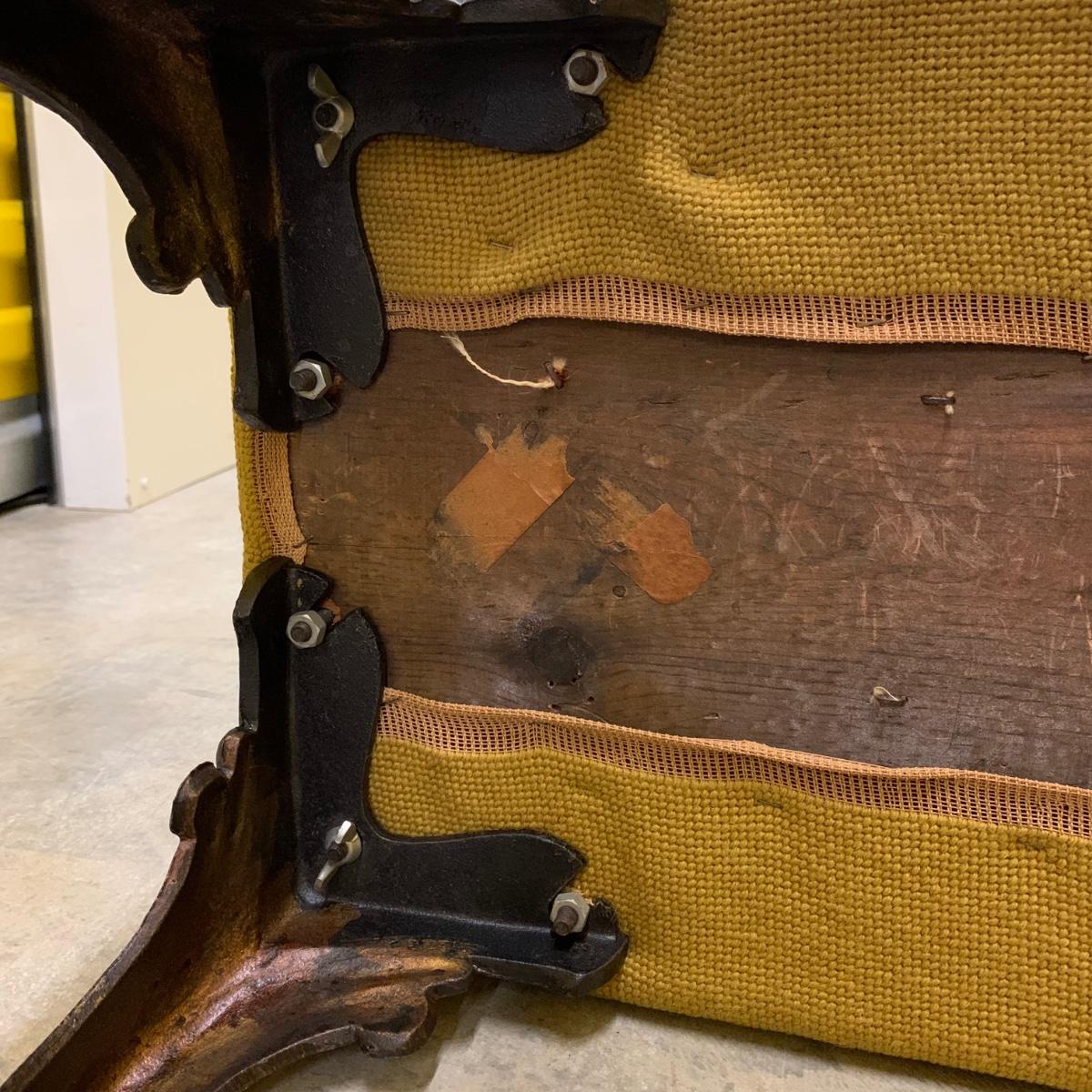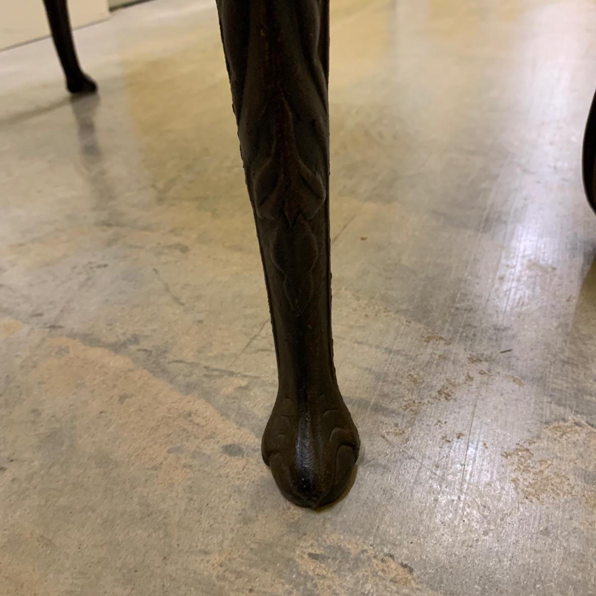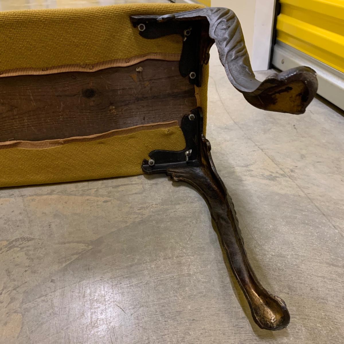 Bench seat is wood topped with a cushion and a needlepoint cover. The main color of the cover is a dark tan/camel color. The ornate legs are a sturdy metal that feels like iron. The bench measures 31”L x 13”W x 18” H. It is in good condition and fully intact. The legs are slightly wobbly. Local pickup only.