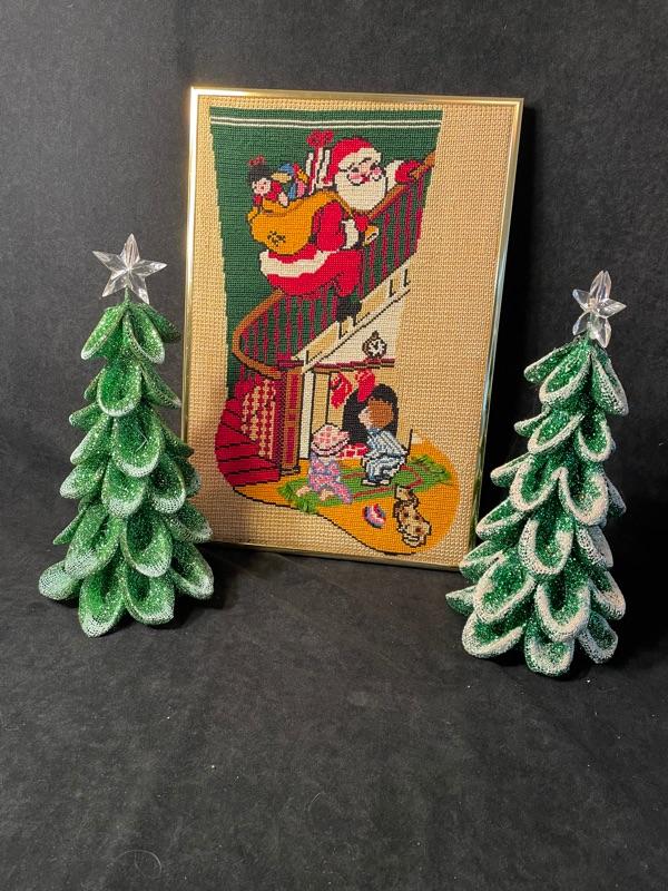 Framed needlepoint picture (10'X16"?) and a pair of plastic Christmas tree decorations