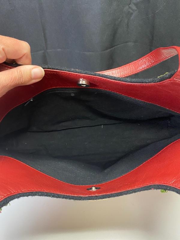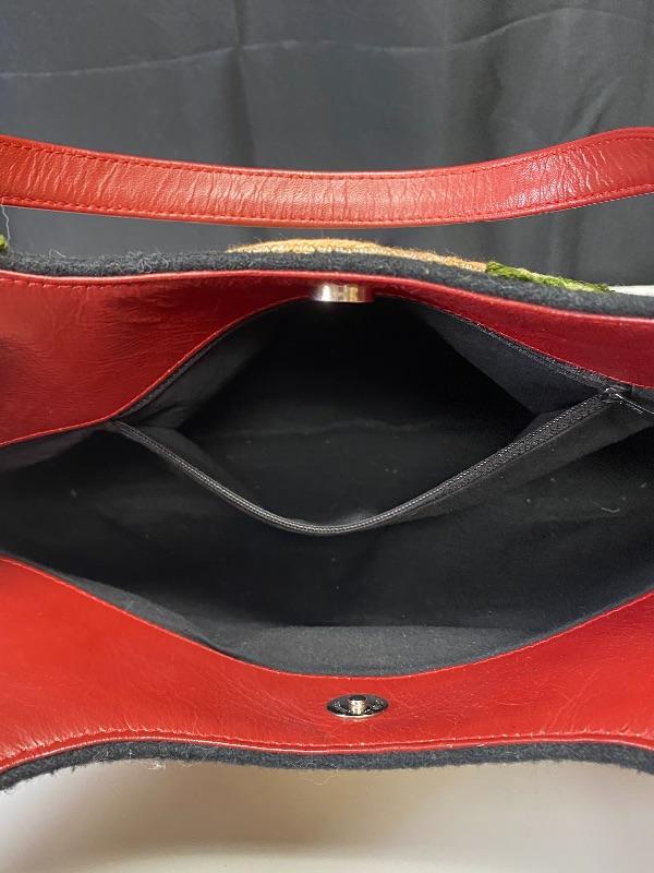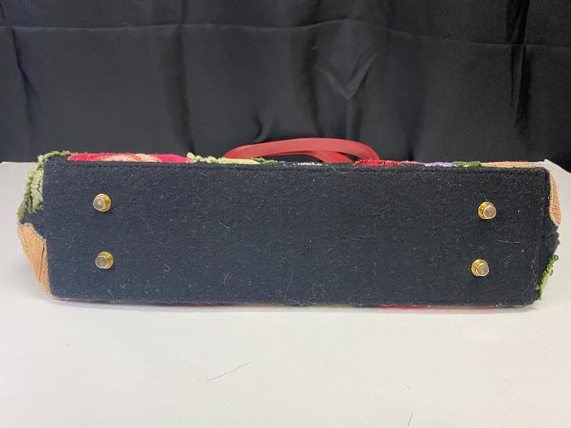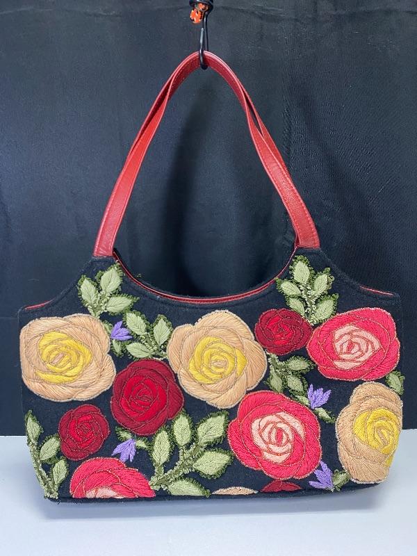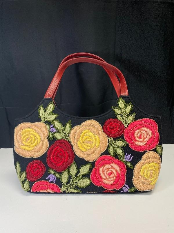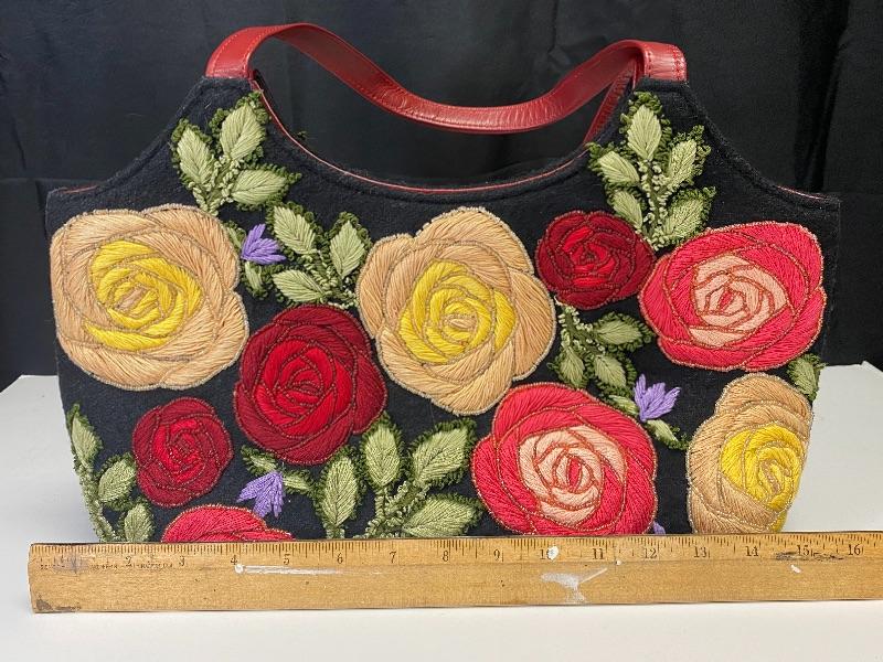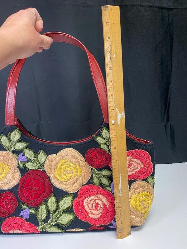 Needle Point embroidered Rose embellished hand bag. Red faux leather handles. Magnetic snap close, one zipper pocket inside. Maker unknown, no tags. Good previously owned condition.