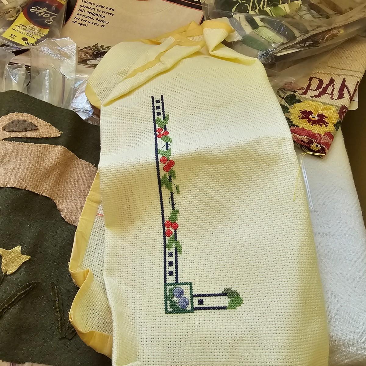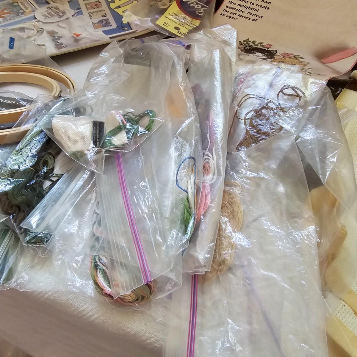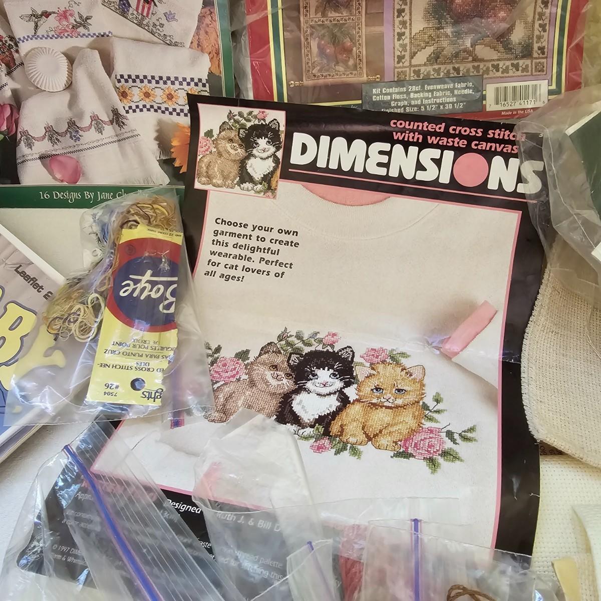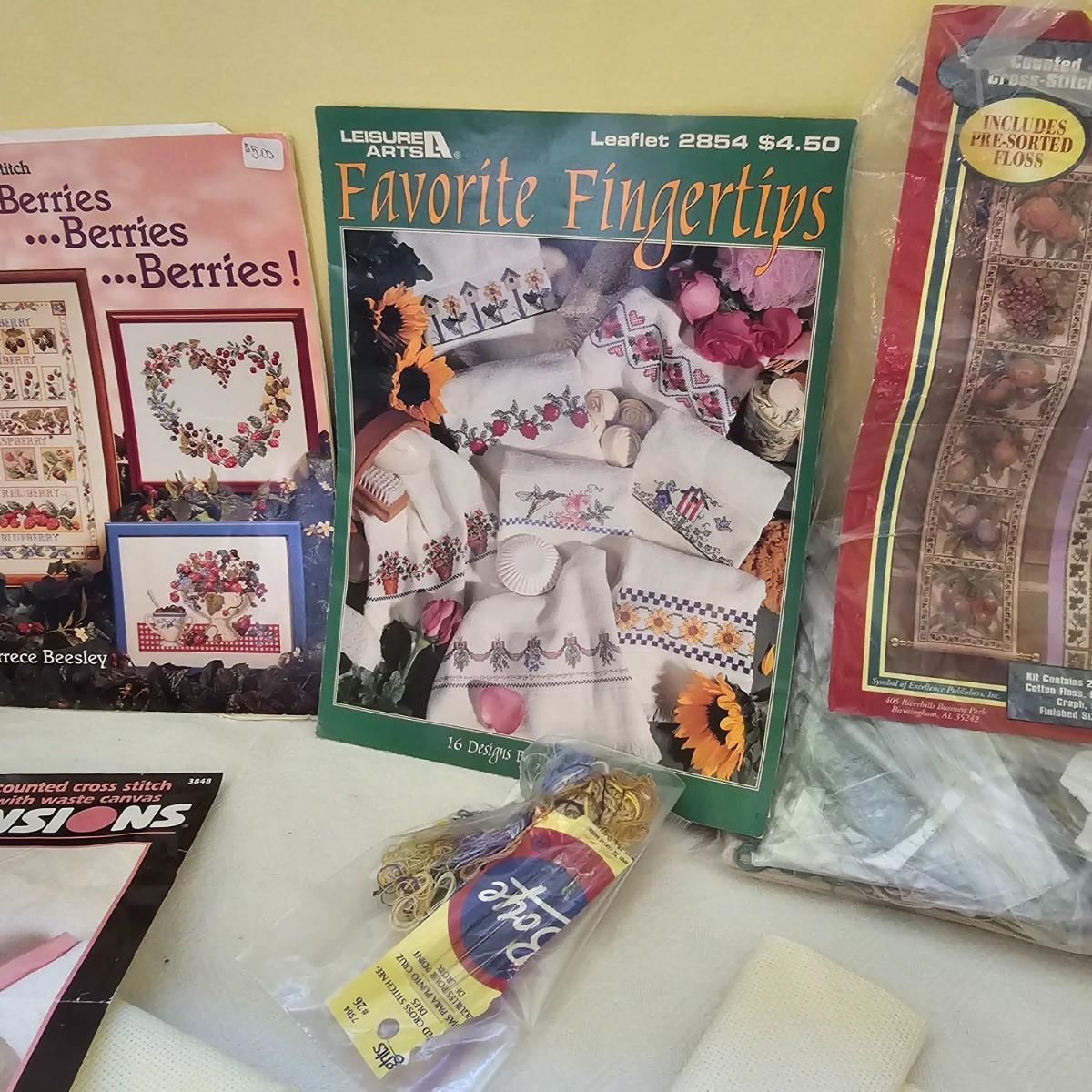 Needlepoint items, kits, thread, books, patterns, material, buttons, more. Lots of different styles to choose from. Container included, see photos for details. Shipping available.