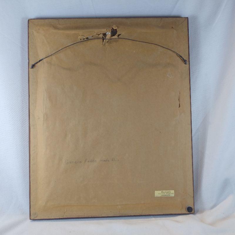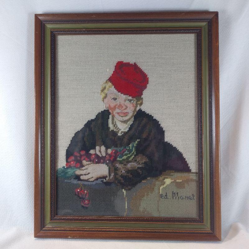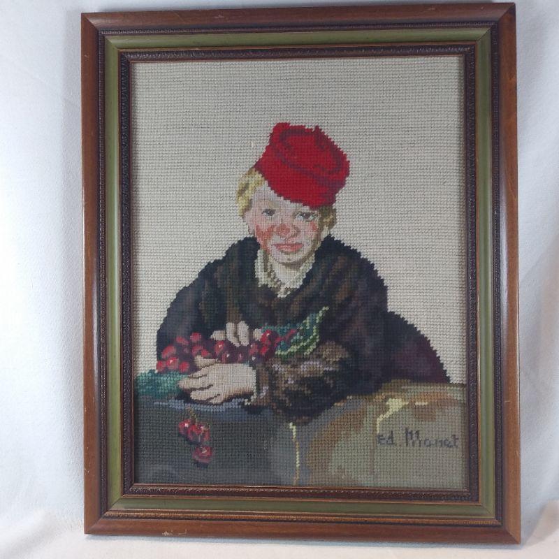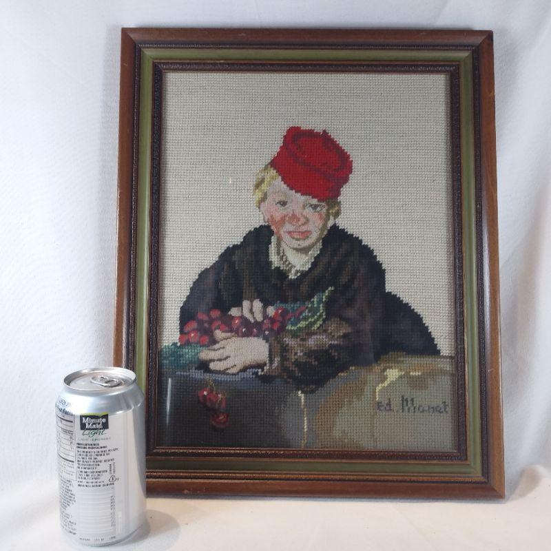 Geneva Fedde, a talented stitcher, worked very hard on this nicely done needlepoint of Ed Monet's "Cherry Picker." It is framed and ready to hang. Overall size is 13 1/2-inches wide X 16 1/2-inches tall. Very good condition and would be a great addition to the right wall - is it yours?
