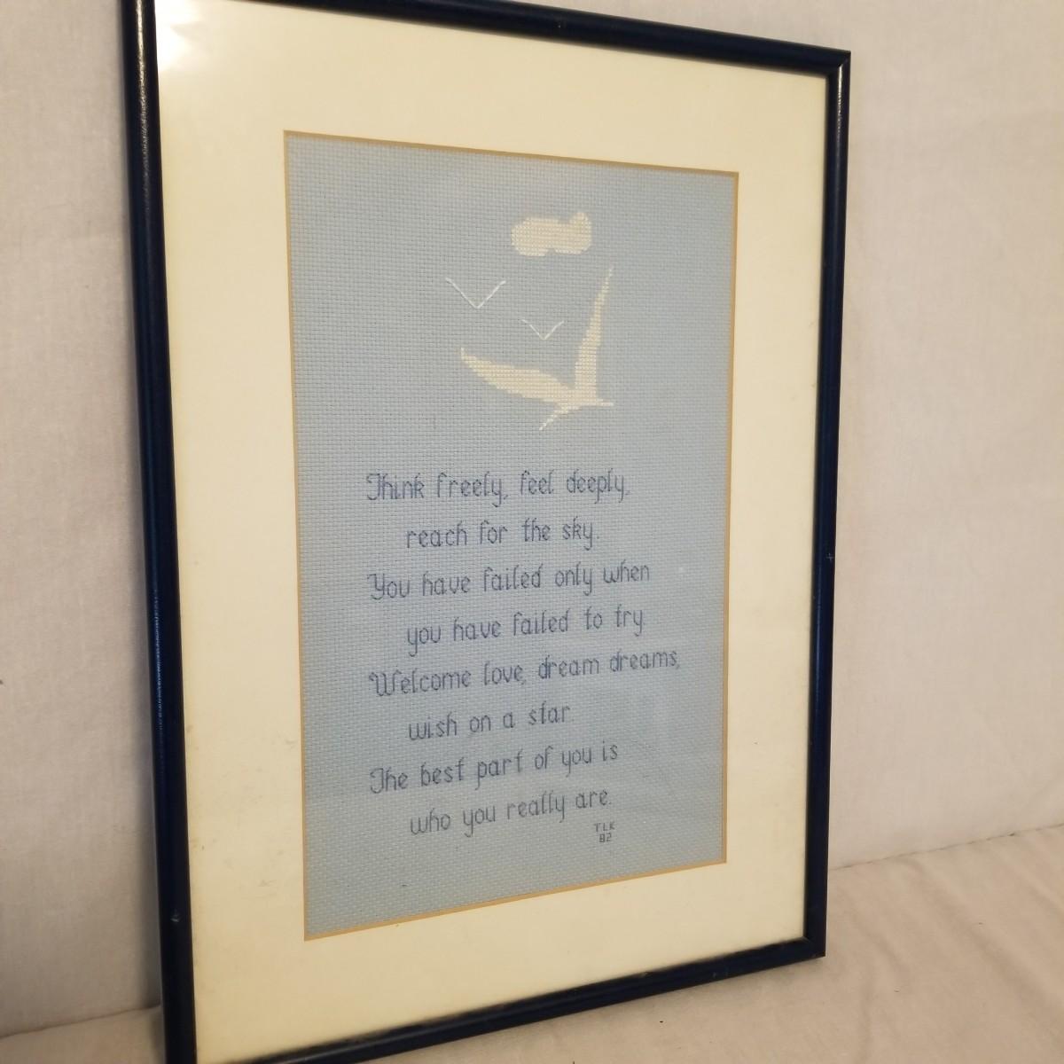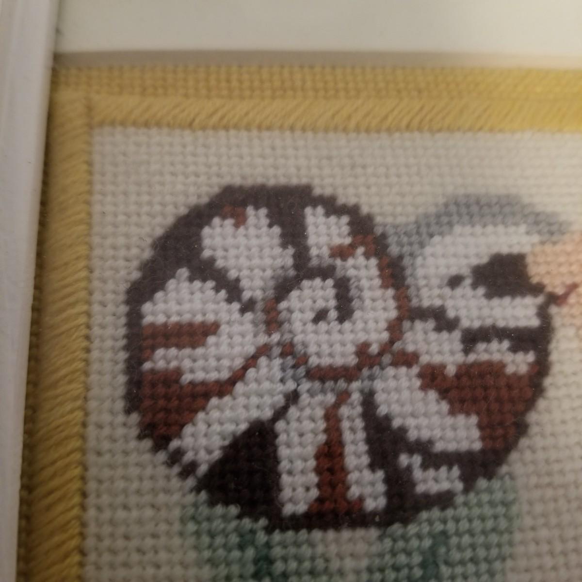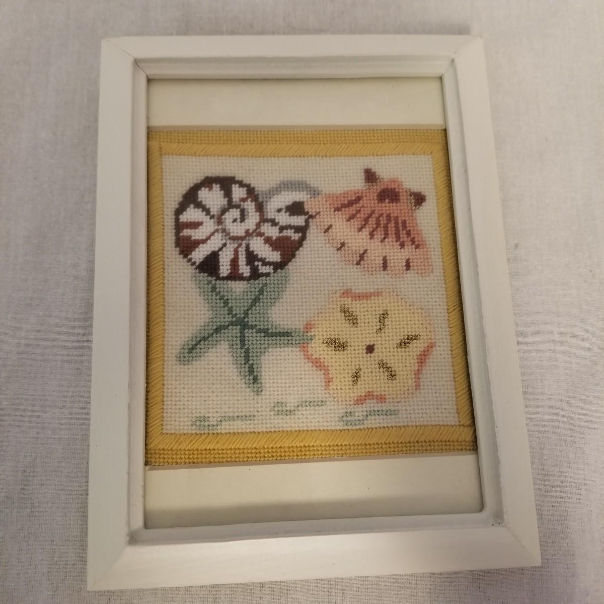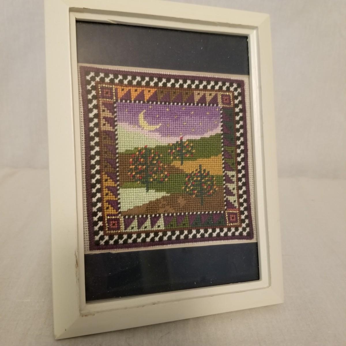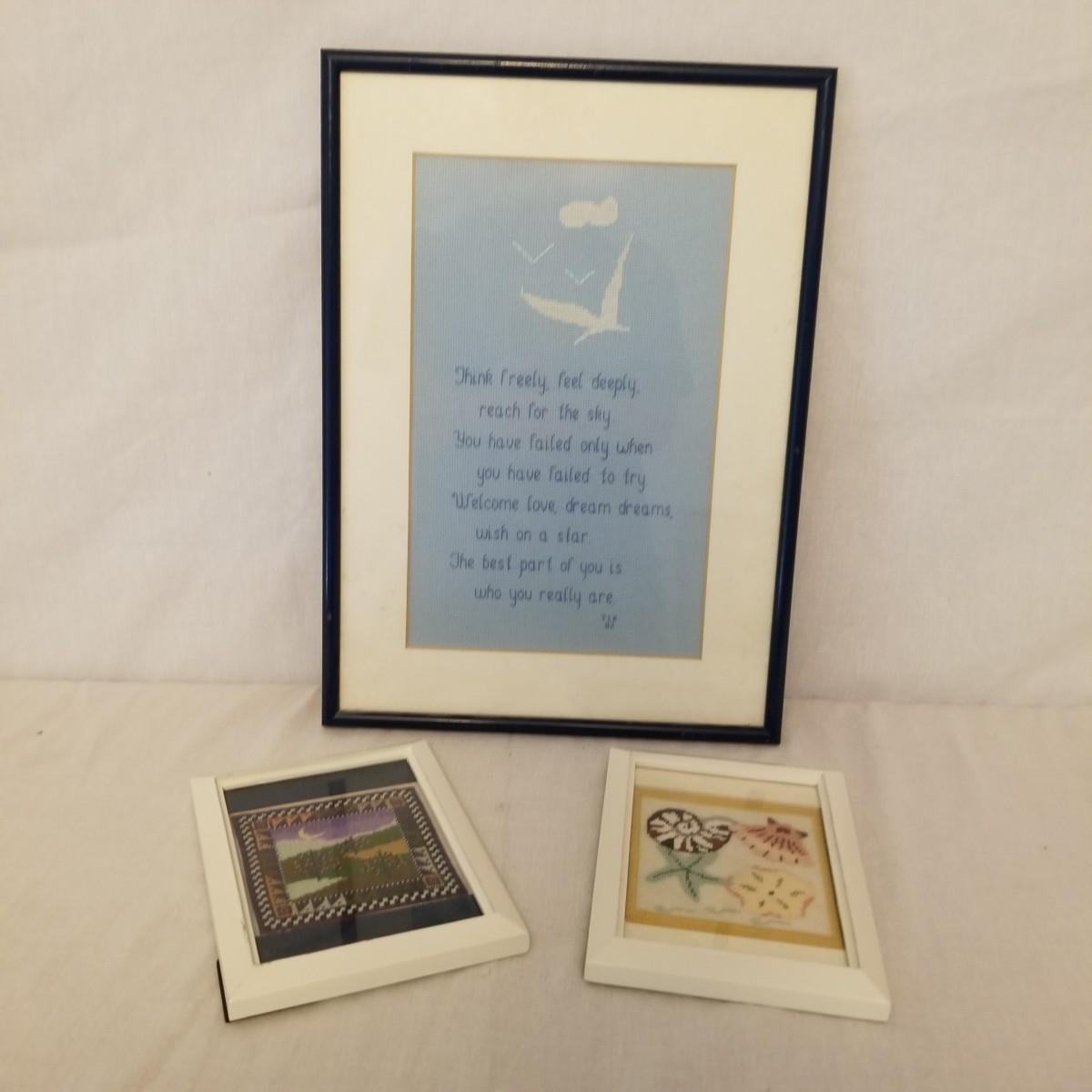 Three framed pieces of woven or needlepoint style art. Seagull piece appears to be woven, is 12.5" x17.5". Moon landscape is needlepoint as well as the shell piece, both are 6" x8". All wood frames, see photos for details. Shipping available. Shipping Art can be costly please call UPS store at 828-252-6930 for quote.