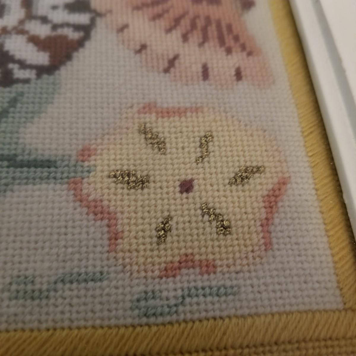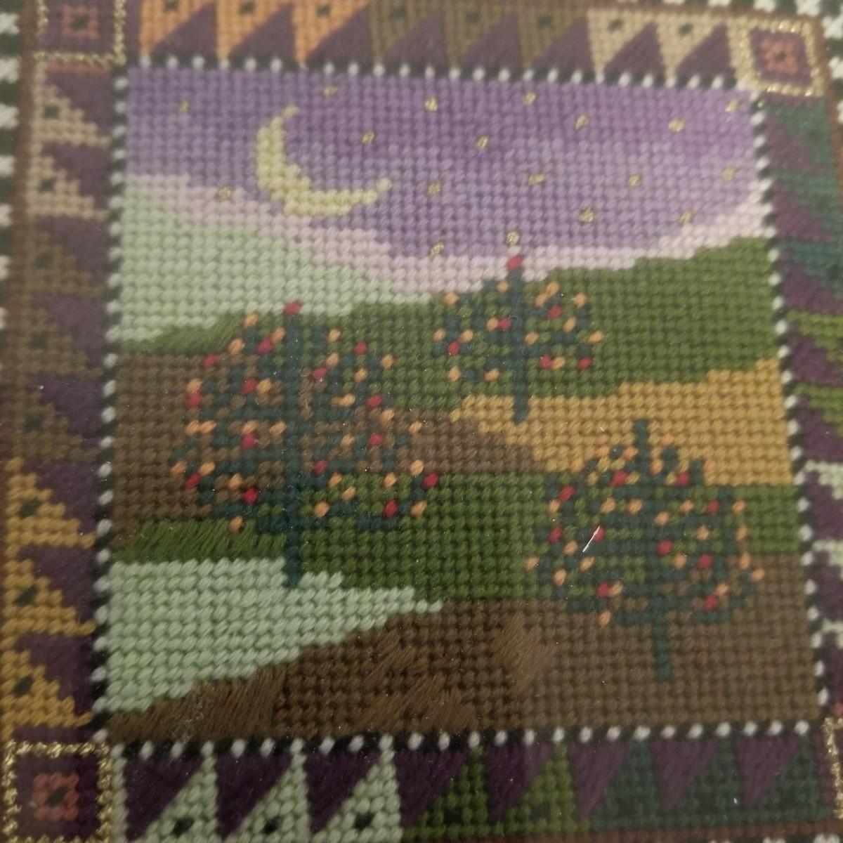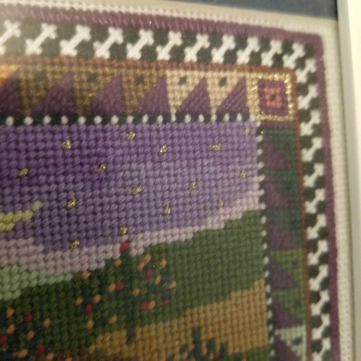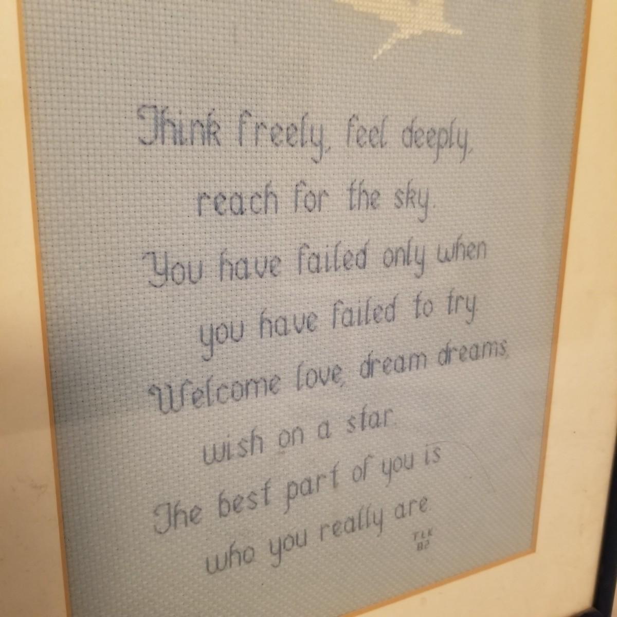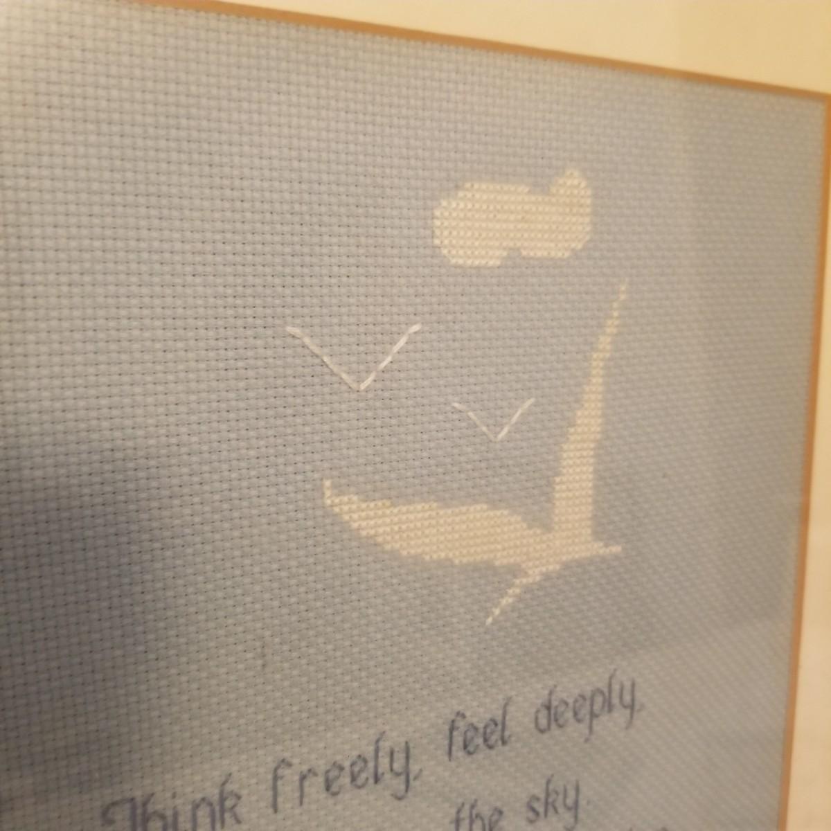 Three framed pieces of woven or needlepoint style art. Seagull piece appears to be woven, is 12.5" x17.5". Moon landscape is needlepoint as well as the shell piece, both are 6" x8". All wood frames, see photos for details. Shipping available. Shipping Art can be costly please call UPS store at 828-252-6930 for quote.