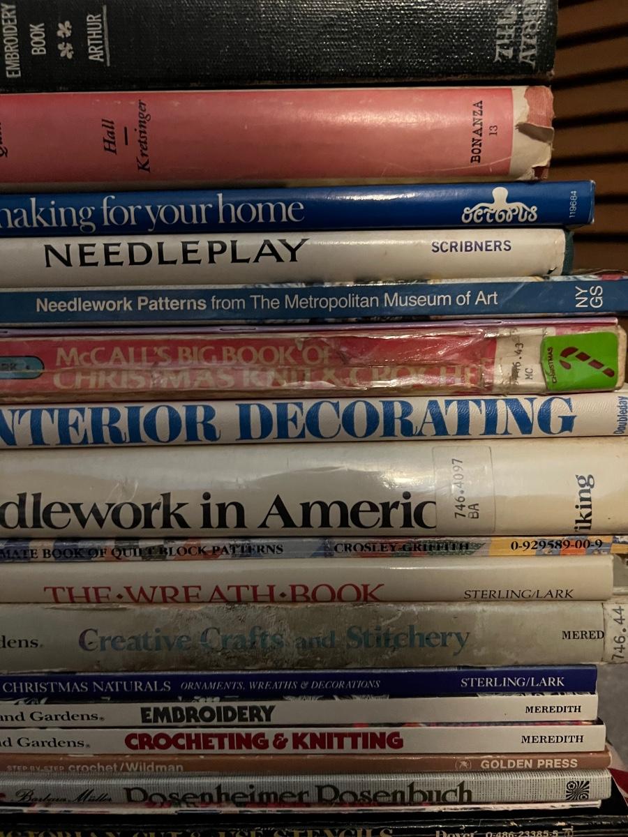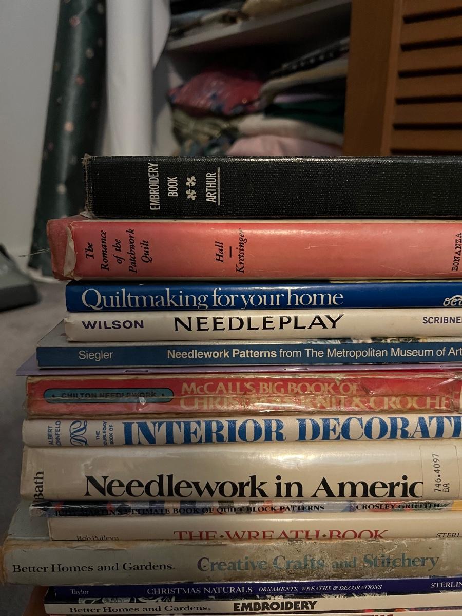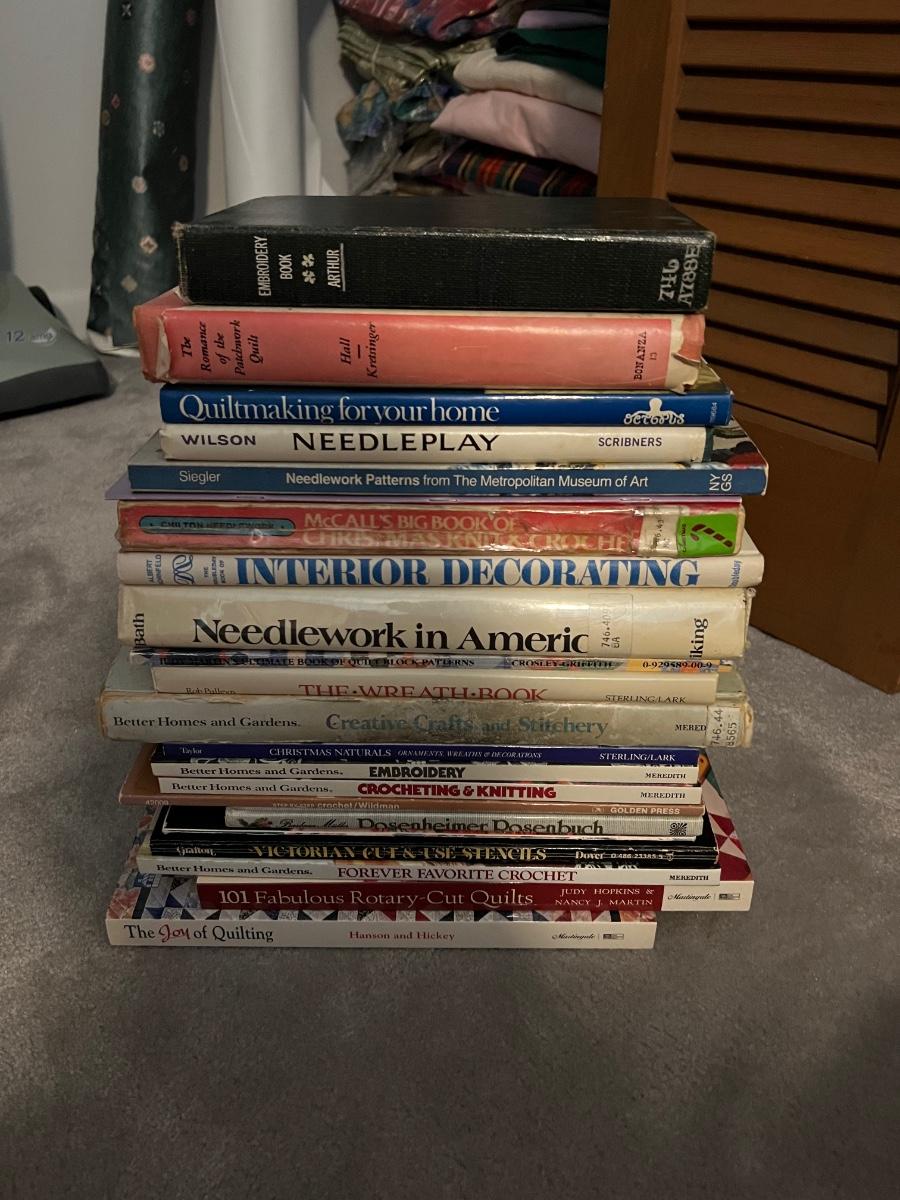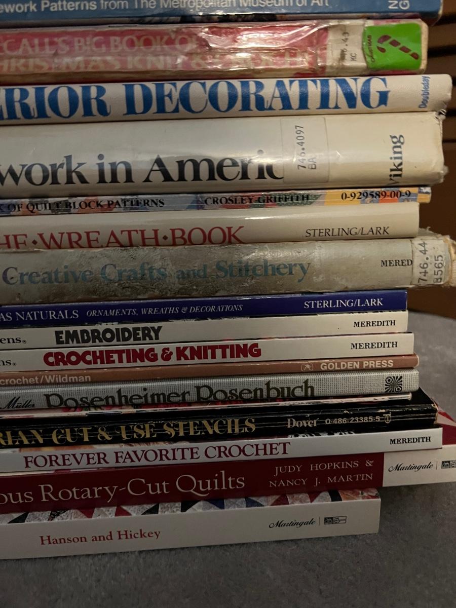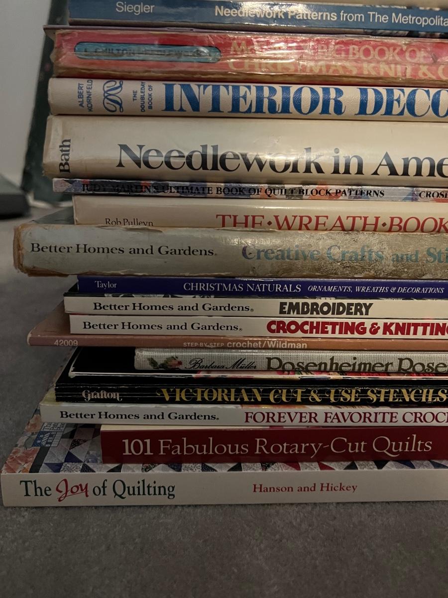 This lot includes 22 books on quilt making, needle work, stitching, and crocheting. Most books are in good condition, some are just a little dusty.