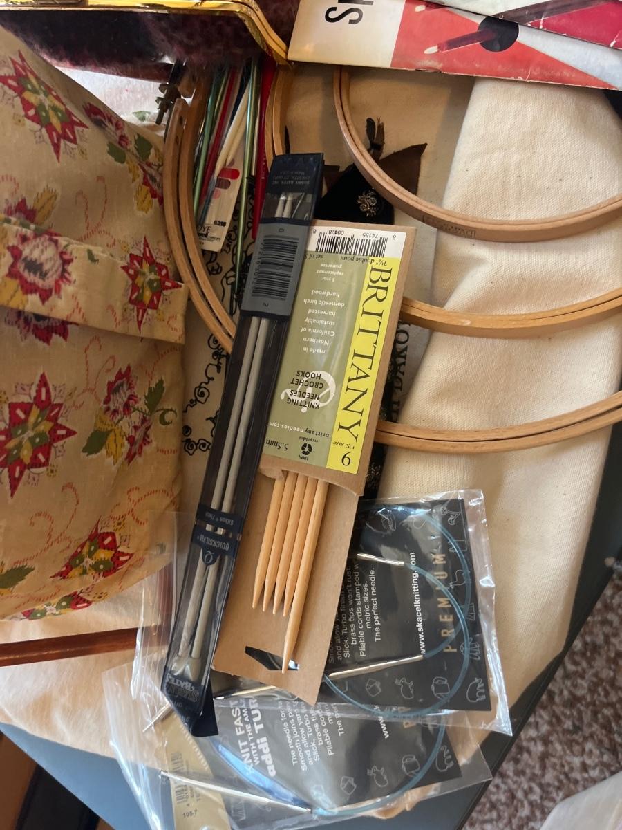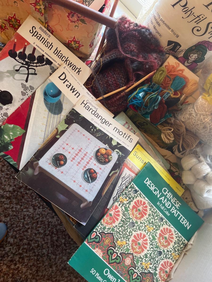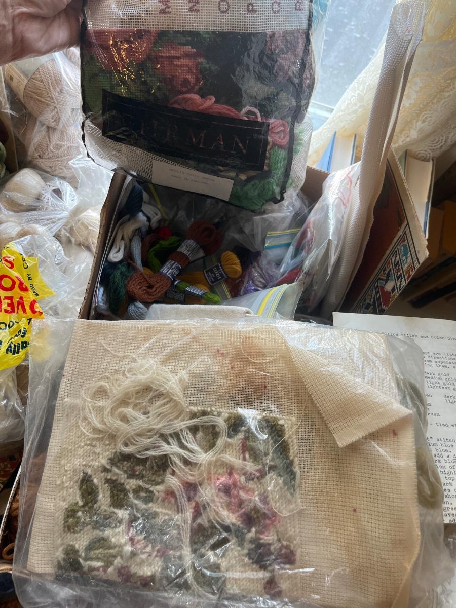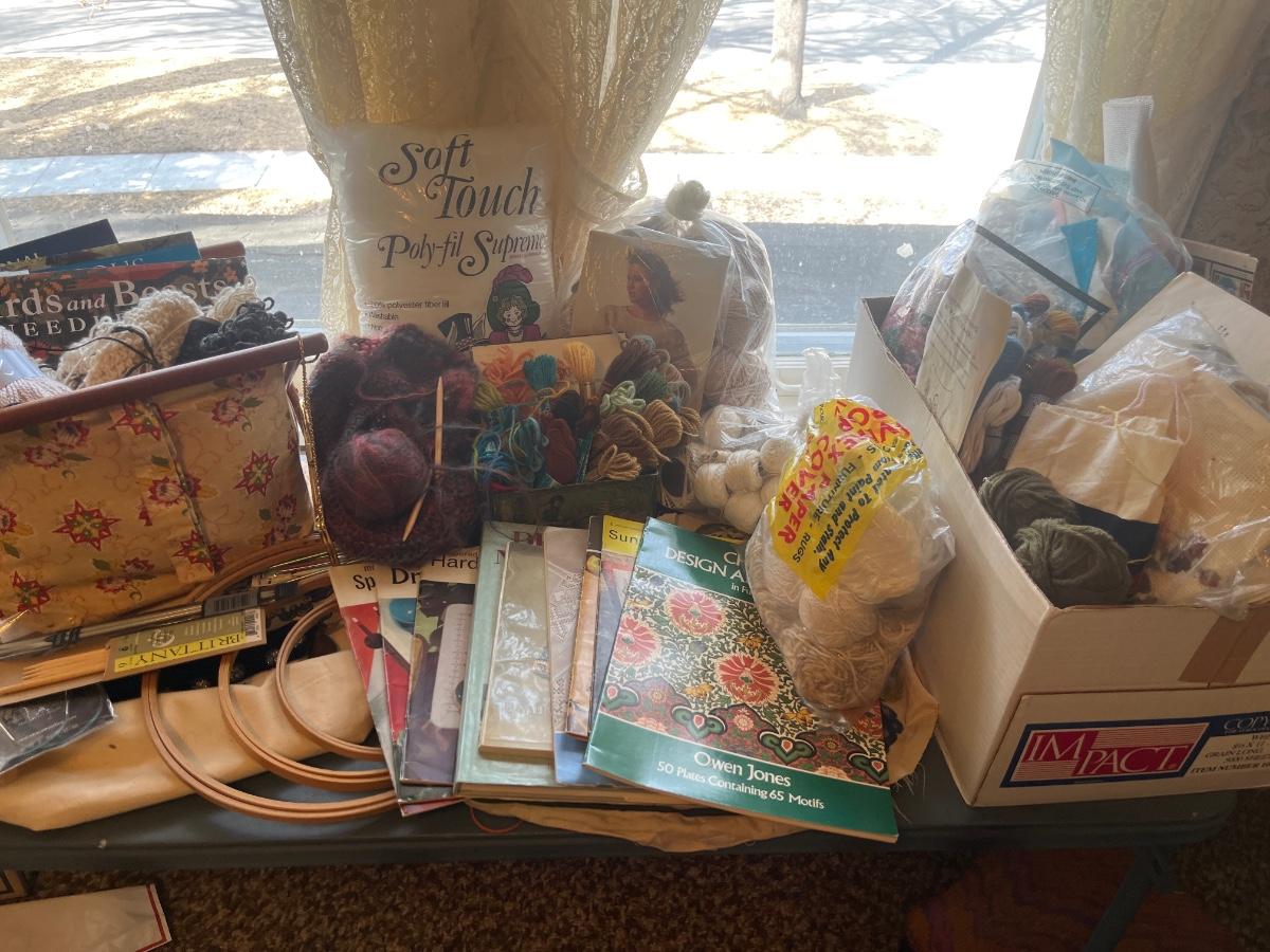 Needlework books, hoops, knitting, needles, yarn, and box of needlepoint kits some finished some are half done