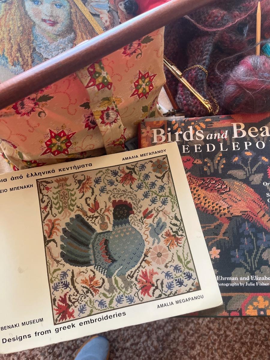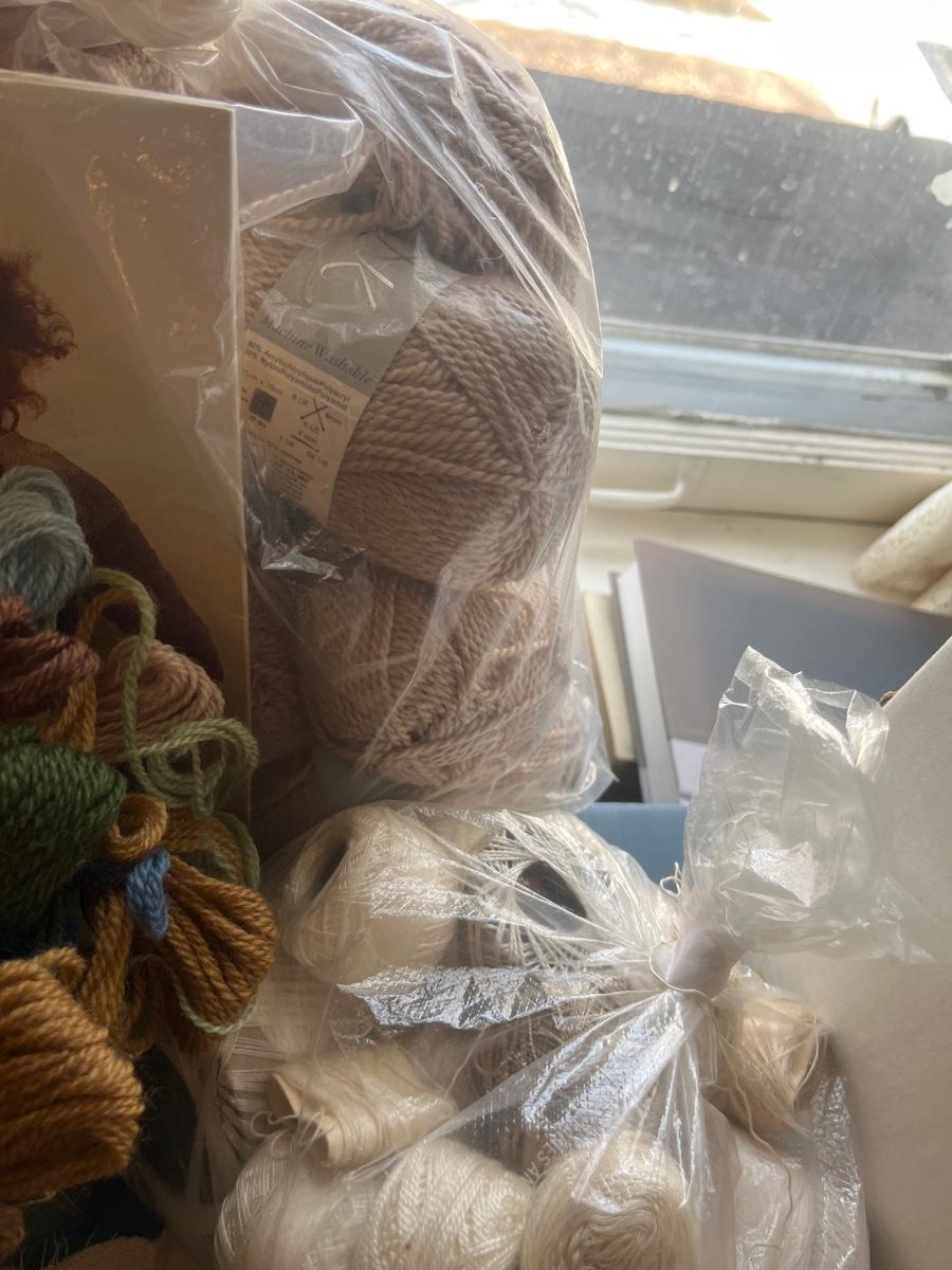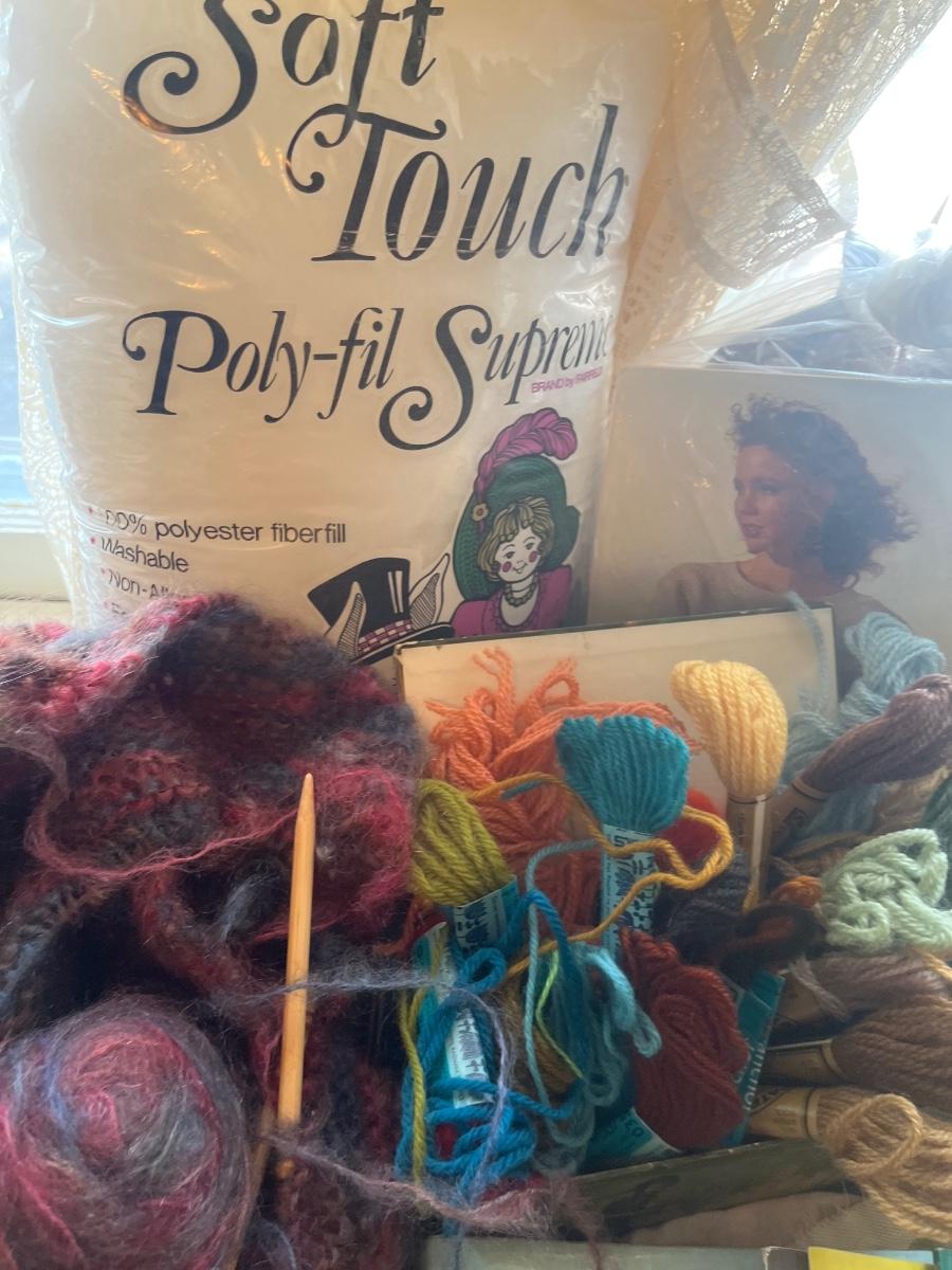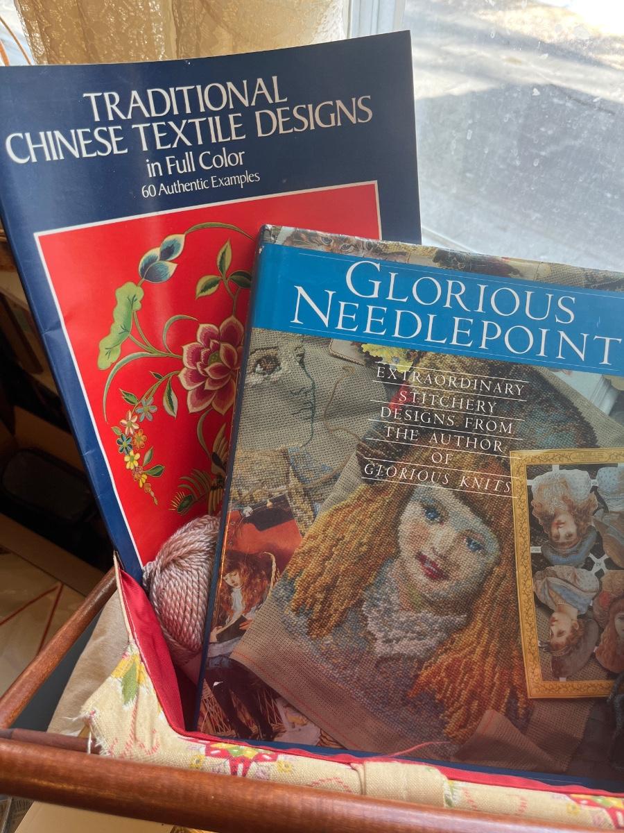 Needlework books, hoops, knitting, needles, yarn, and box of needlepoint kits some finished some are half done