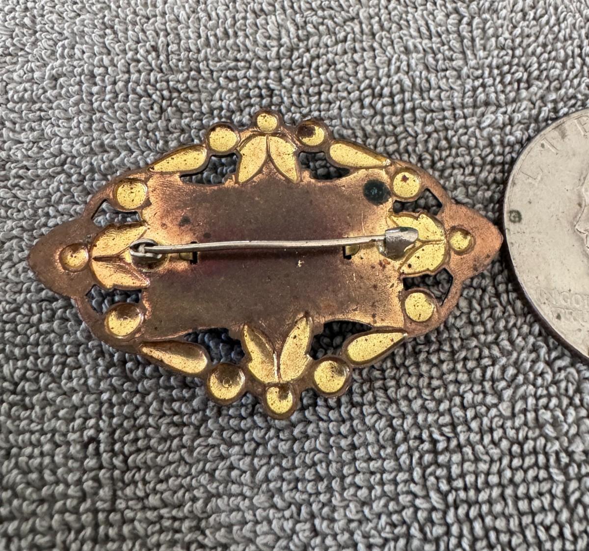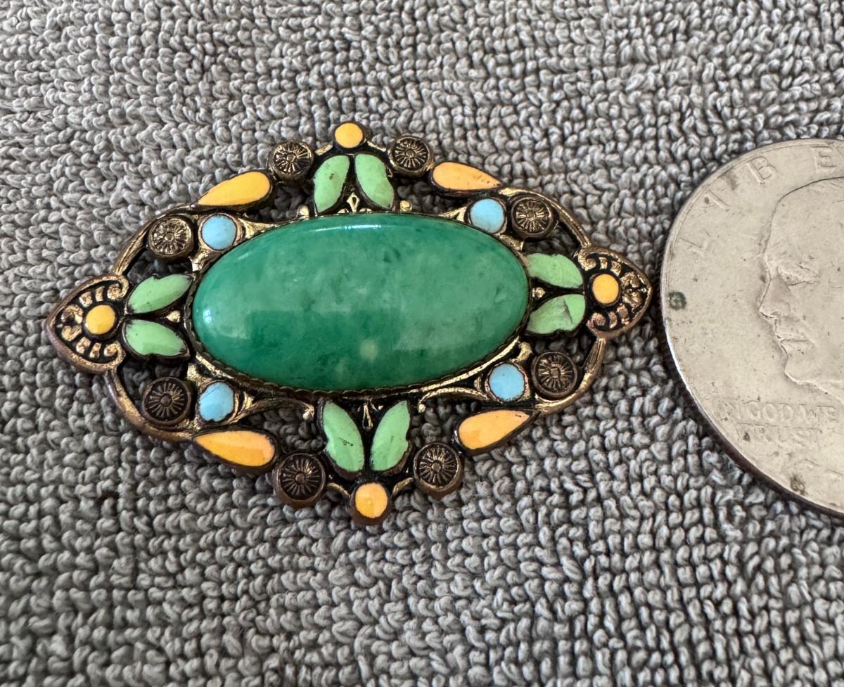 Materials: The central green stone is a cabochon, often made of glass or celluloid in vintage pieces, sometimes simulating more precious stones like jade. The surrounding decorative elements appear to be enamel in shades of green, yellow, and blue, set in a gold-tone metal, likely brass.