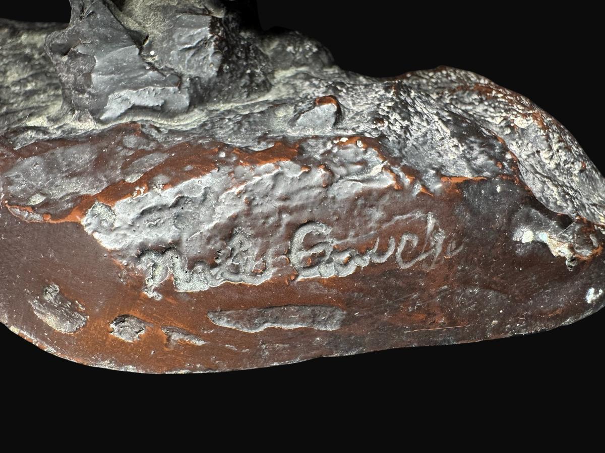 Signed. On a marble base. The statue needs to be reattached to the base. Measurement: 12”L (bronze); 14.25” x 9.25” (base). [DR]