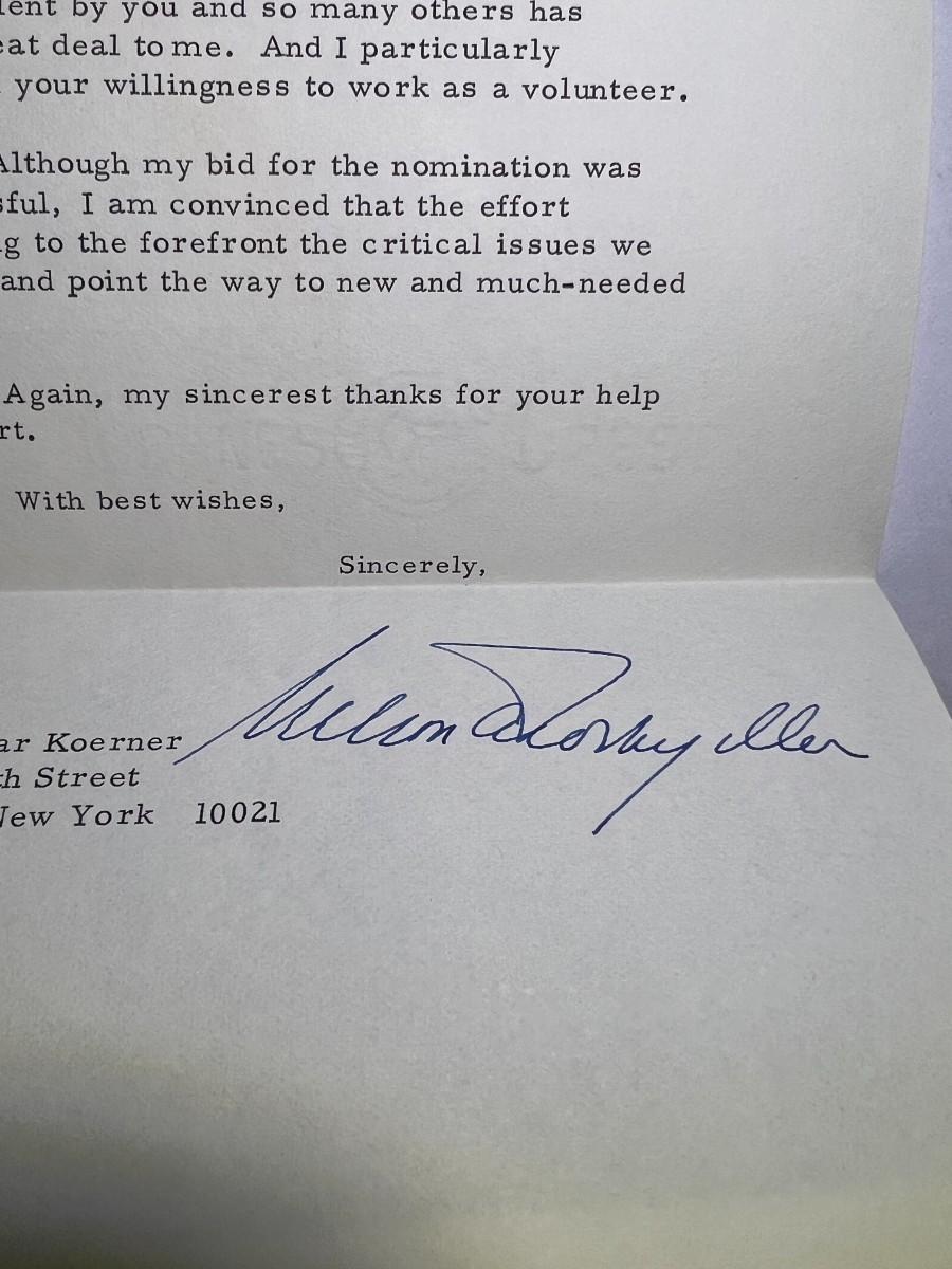 Nelson Rockefeller Hand Signed Letter Dated 1968 in Very Good Preowned Condition.