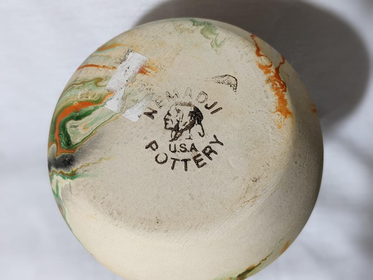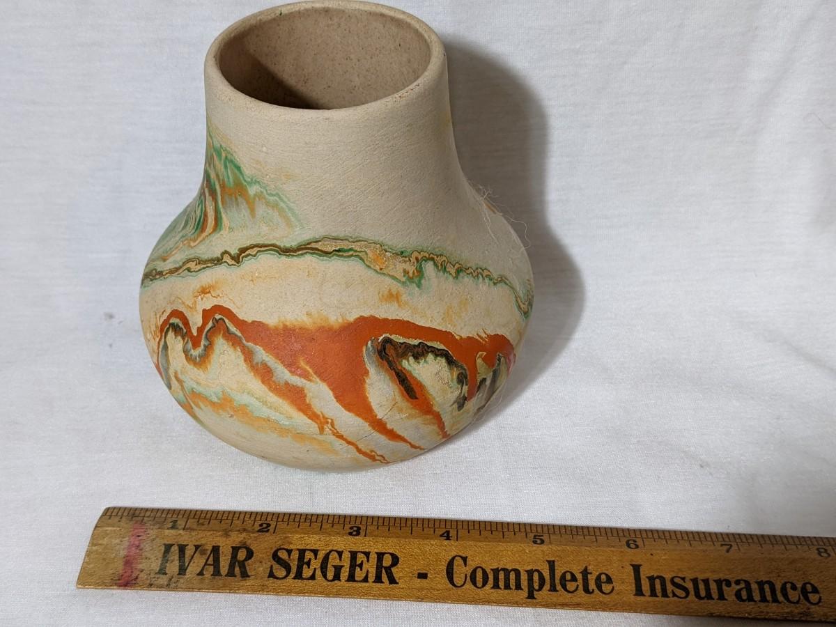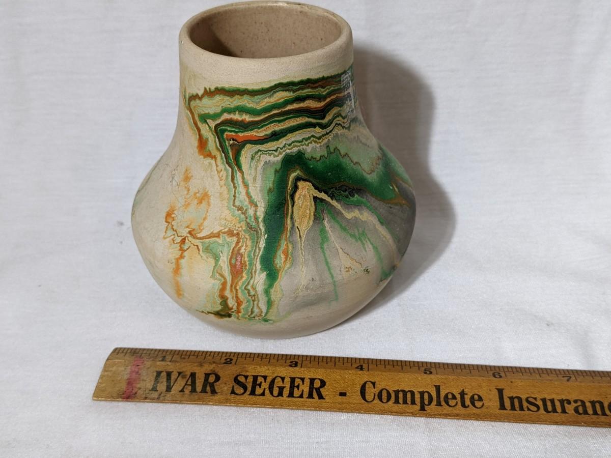 Nemadji Pottery Vase Green Brown Orange Swirls