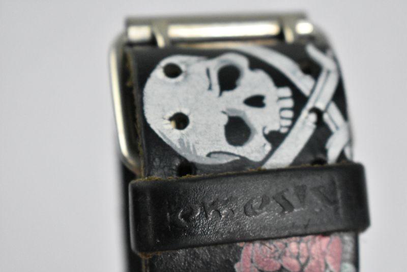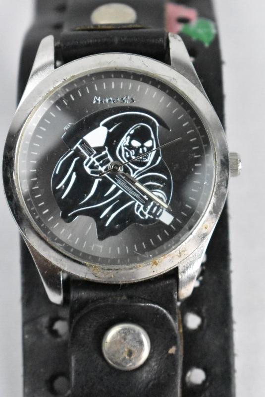 Nemesis Watch: Grim Reaper with Leather Band: Skulls/Crossbones/Roses. Needs repairs/battery