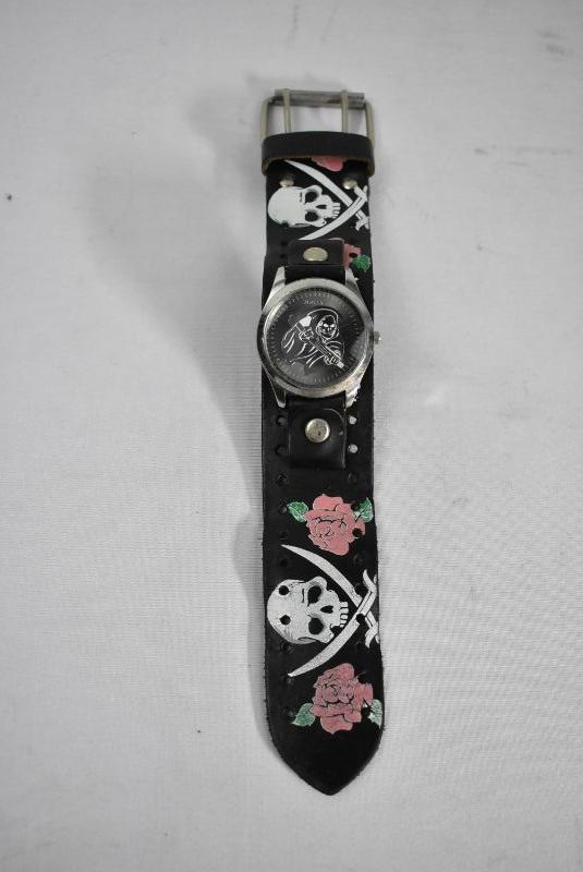 Nemesis Watch: Grim Reaper w/ Leather Band: Skull/Crossbone/Rose. Needs Battery