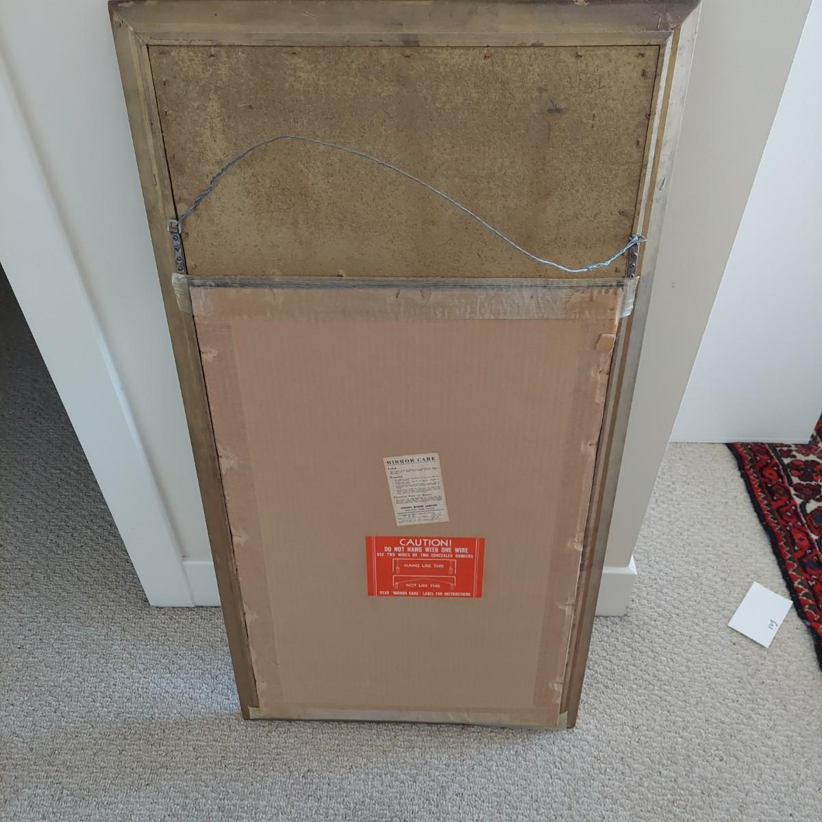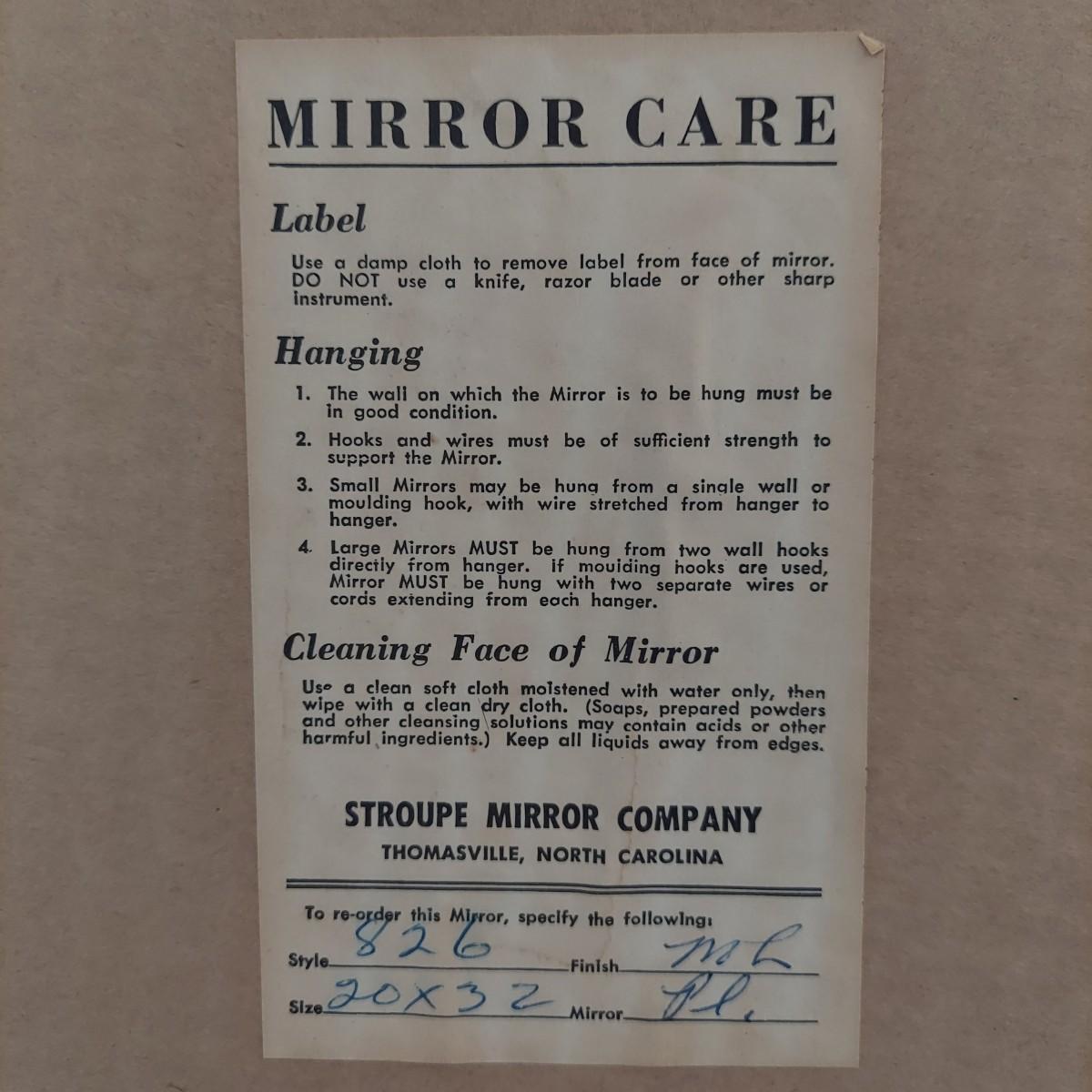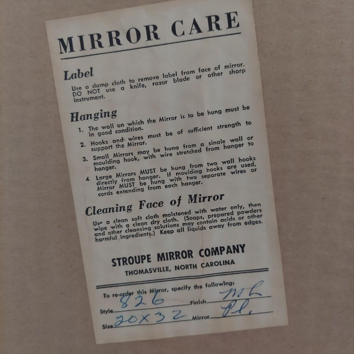 Large mirror that appears to be vintage in a neoclassical style with a Stroupe Mirror Company label on the back. Has a wooden frame with a gilded finish. Measures 23” x 45"H. Please see photos for details.