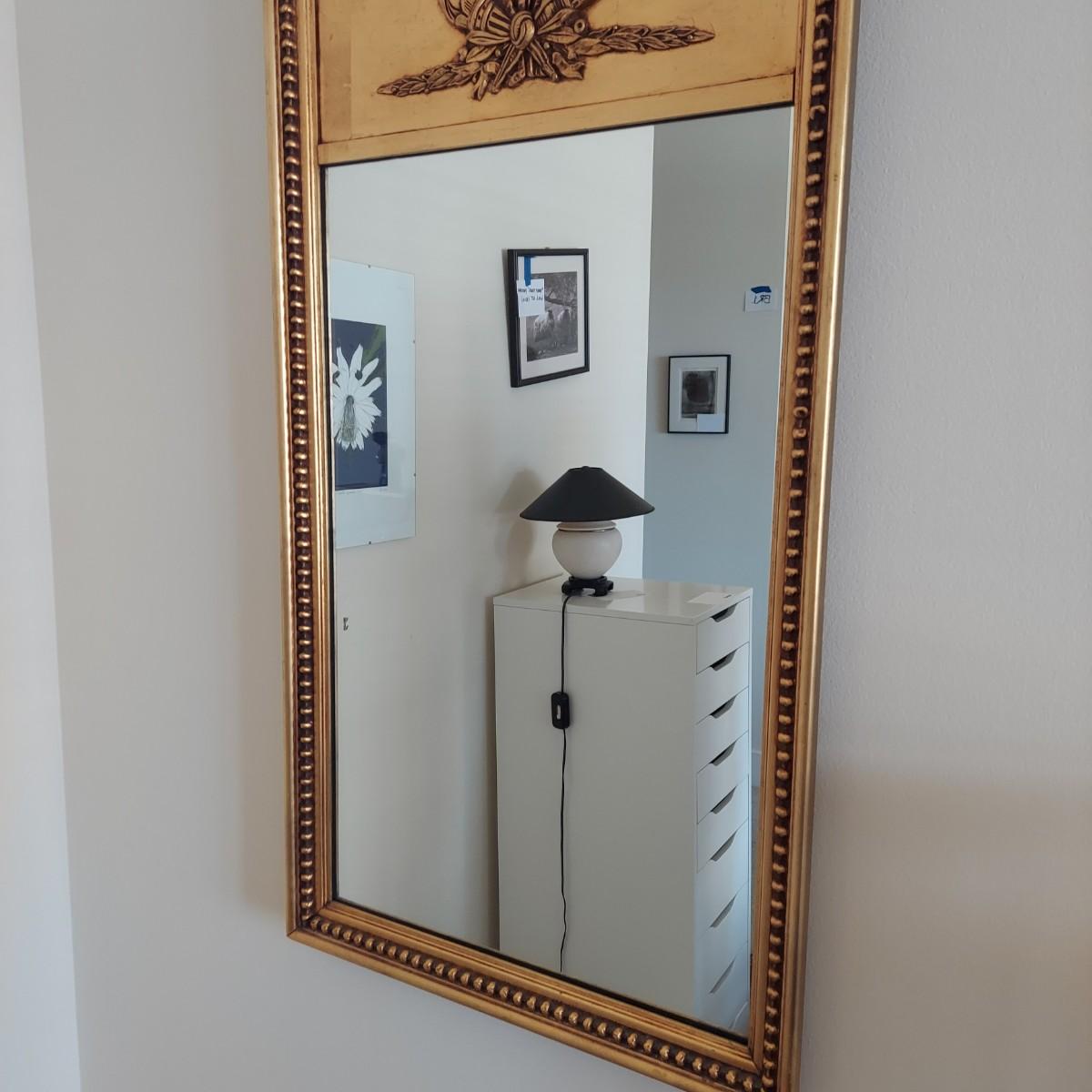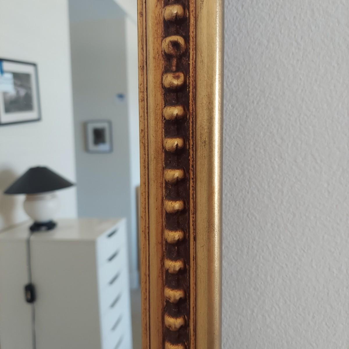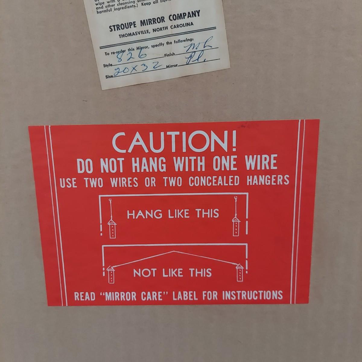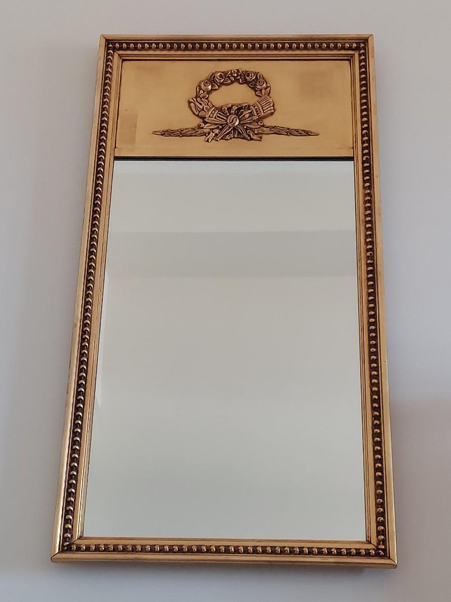 Large mirror that appears to be vintage in a neoclassical style with a Stroupe Mirror Company label on the back. Has a wooden frame with a gilded finish. Measures 23” x 45"H. Please see photos for details.