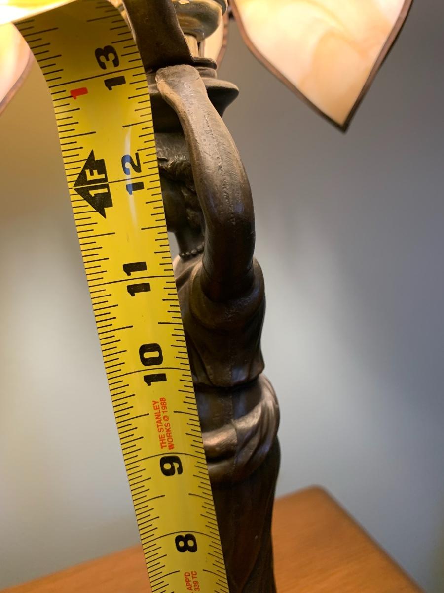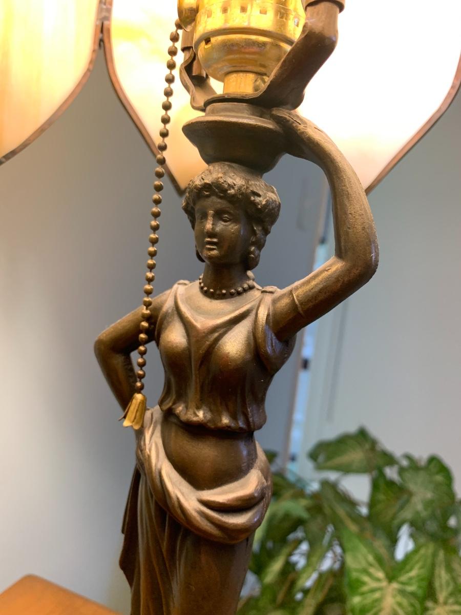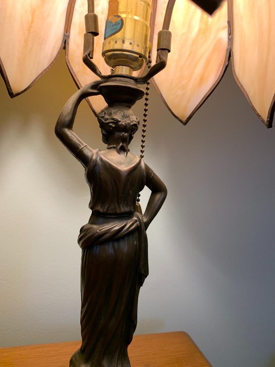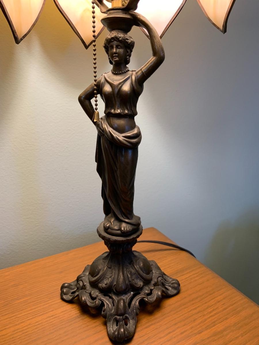 Glass tulip style lampshade with brass figure of woman with arm raised to her head.