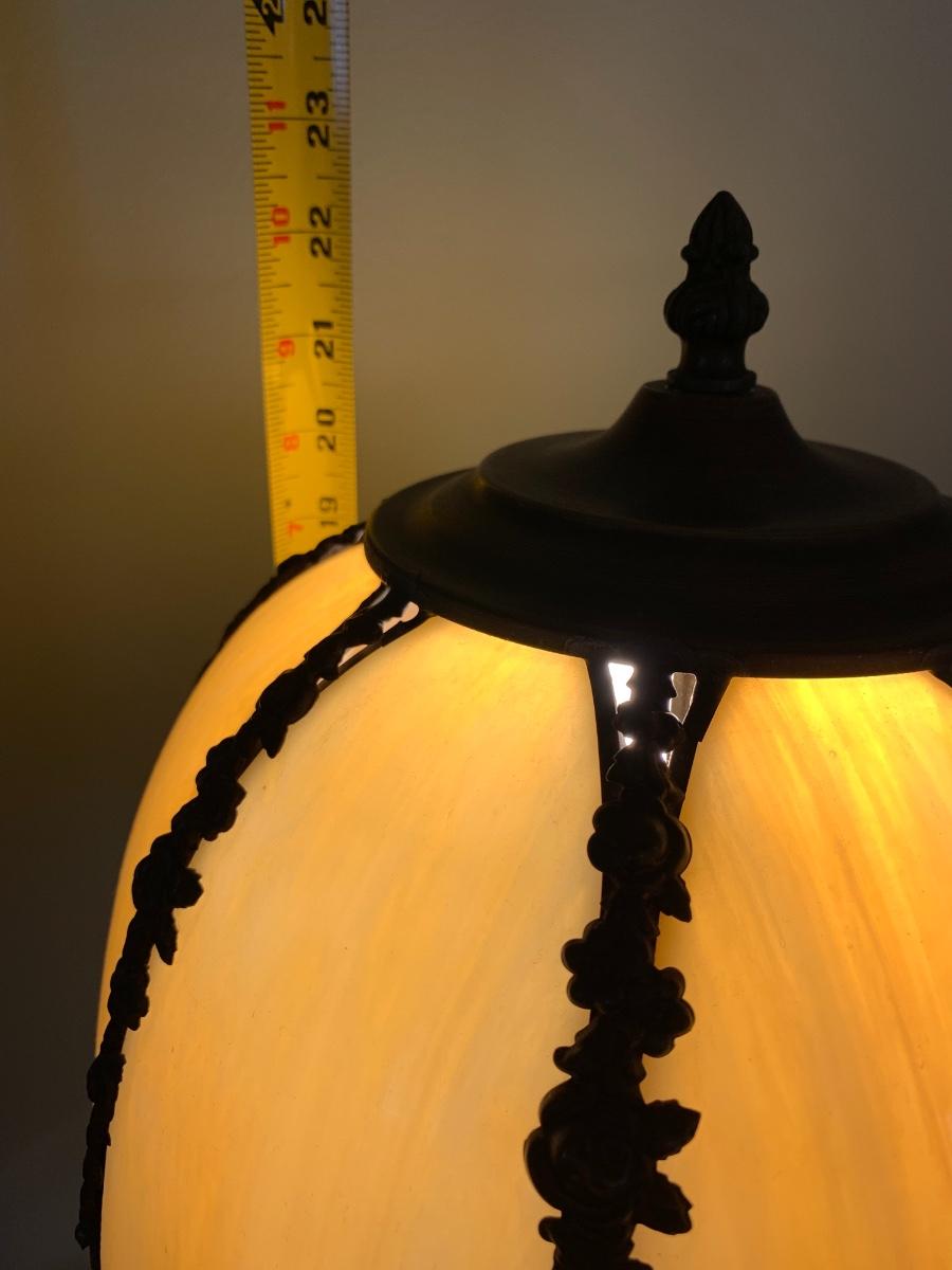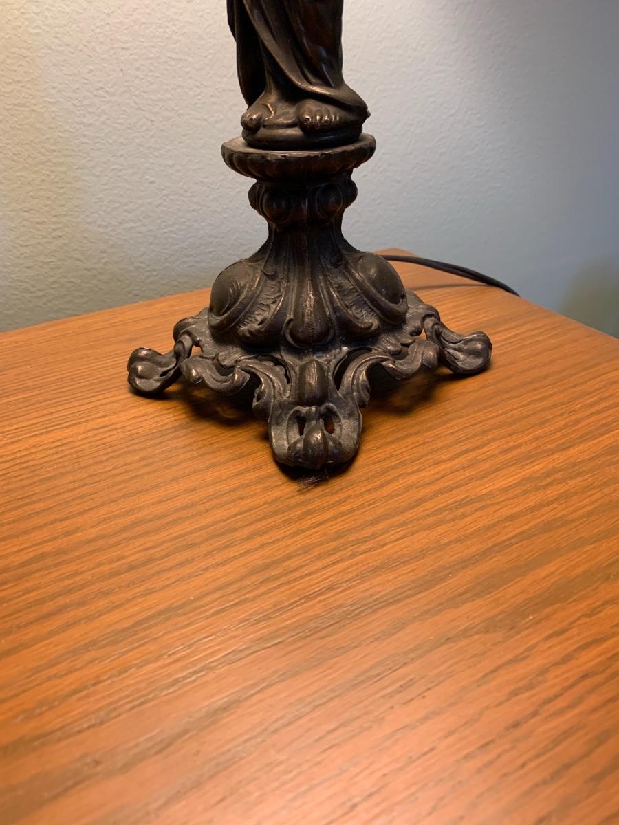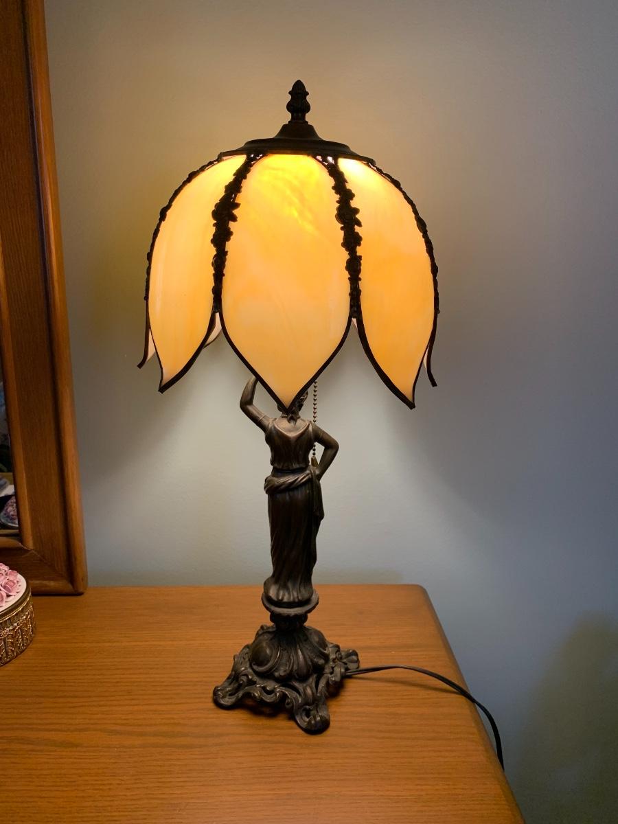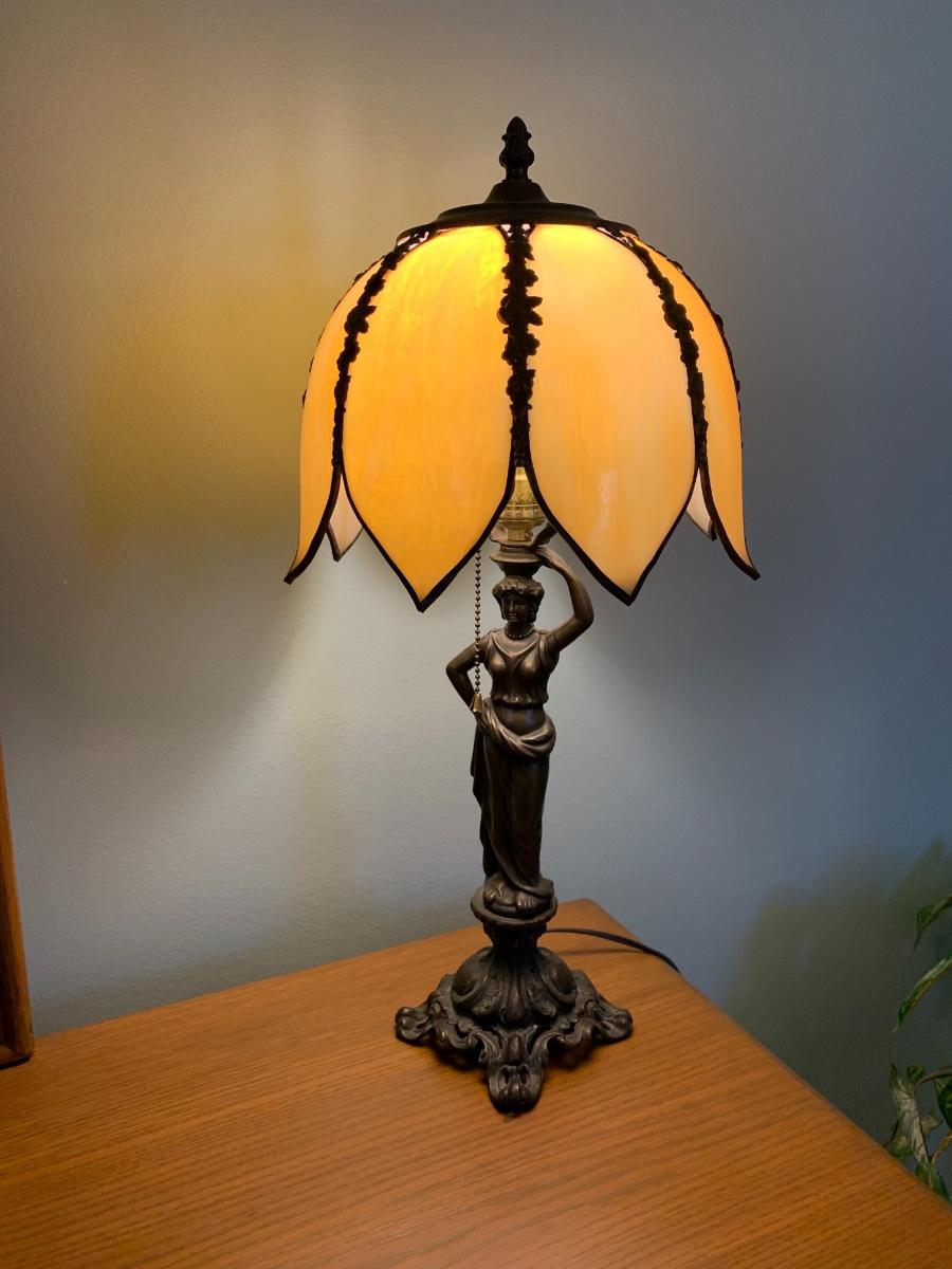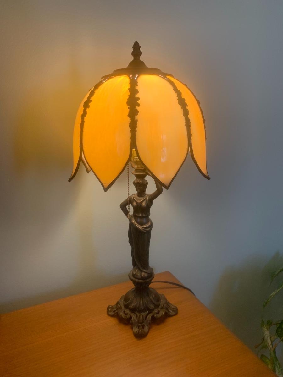 Glass tulip style lampshade with brass figure of woman with arm raised to her head.