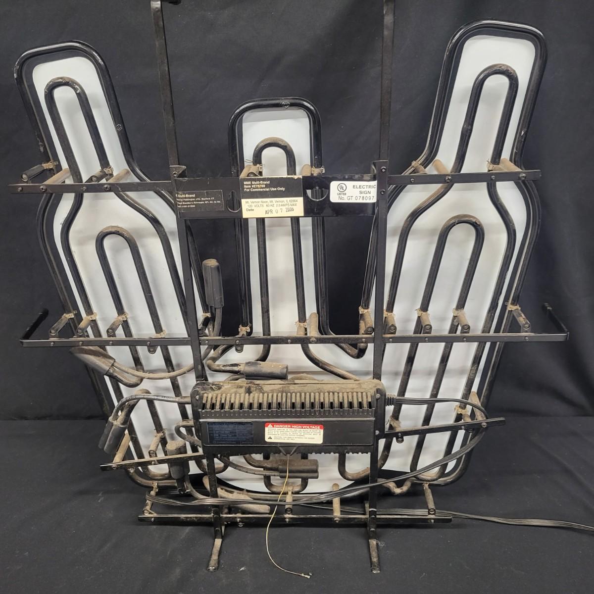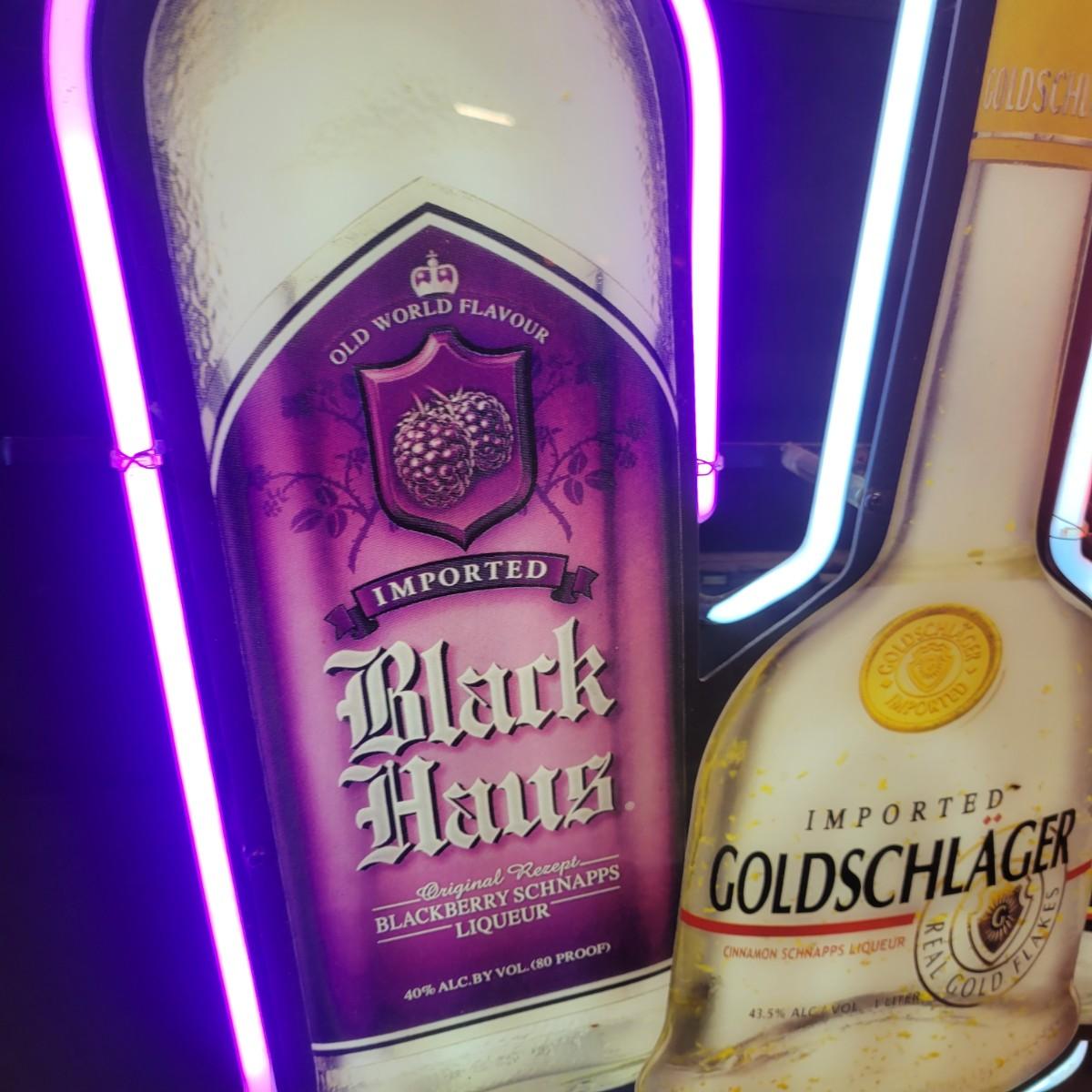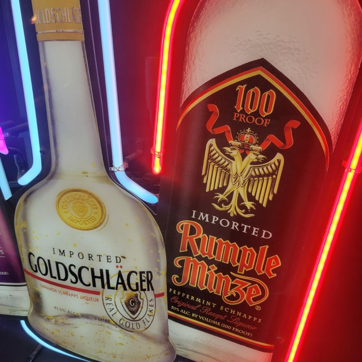 Neon Goldschlager, Black Haus and Rumple Minze bottles. Tested and works. Measures approximately 24.5" x 25.5" x 5" Shipping available. Shipping Art can be costly please call UPS store at 828-252-6930 for quote.