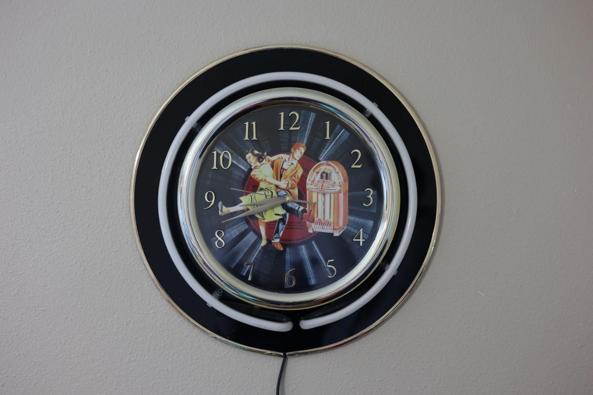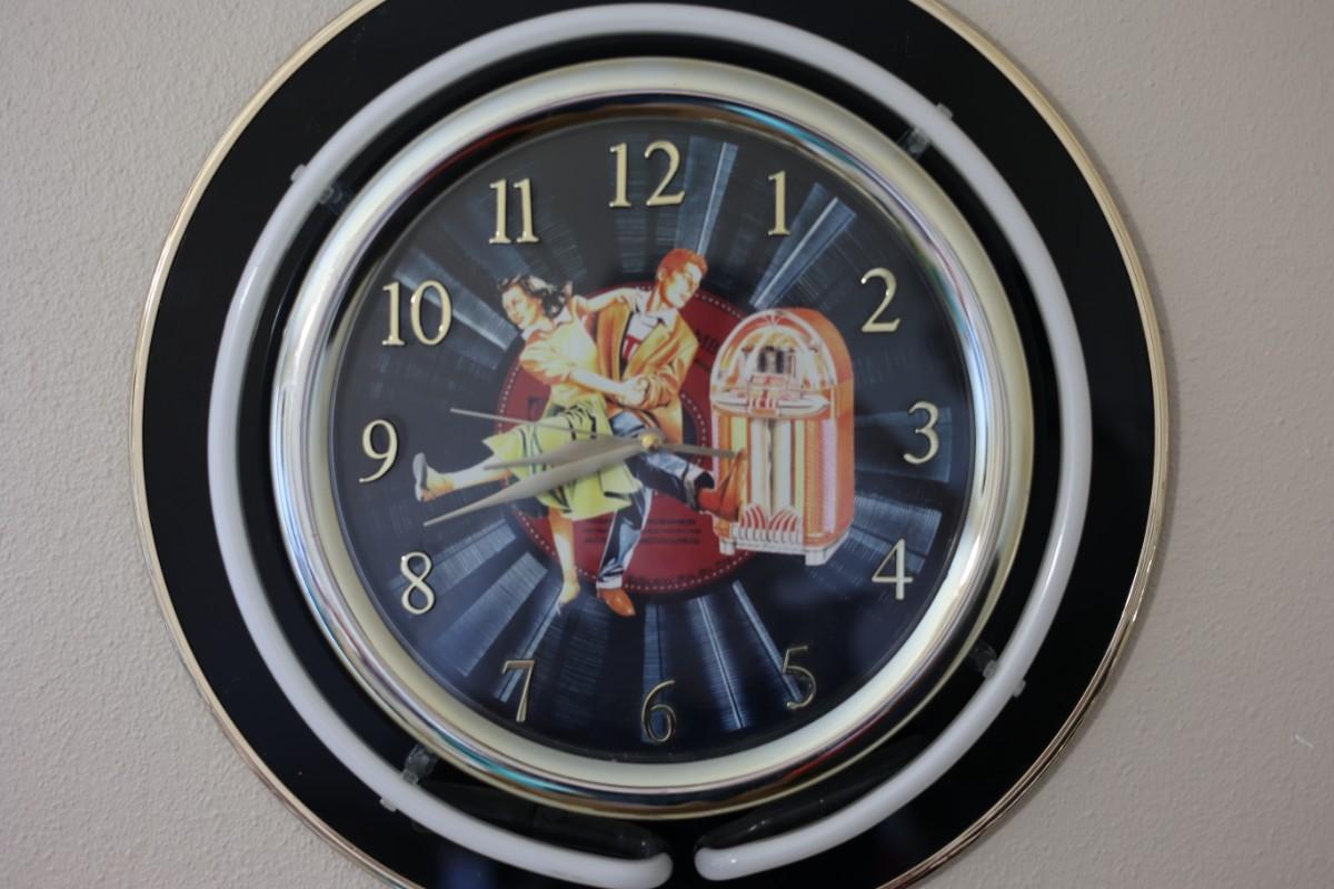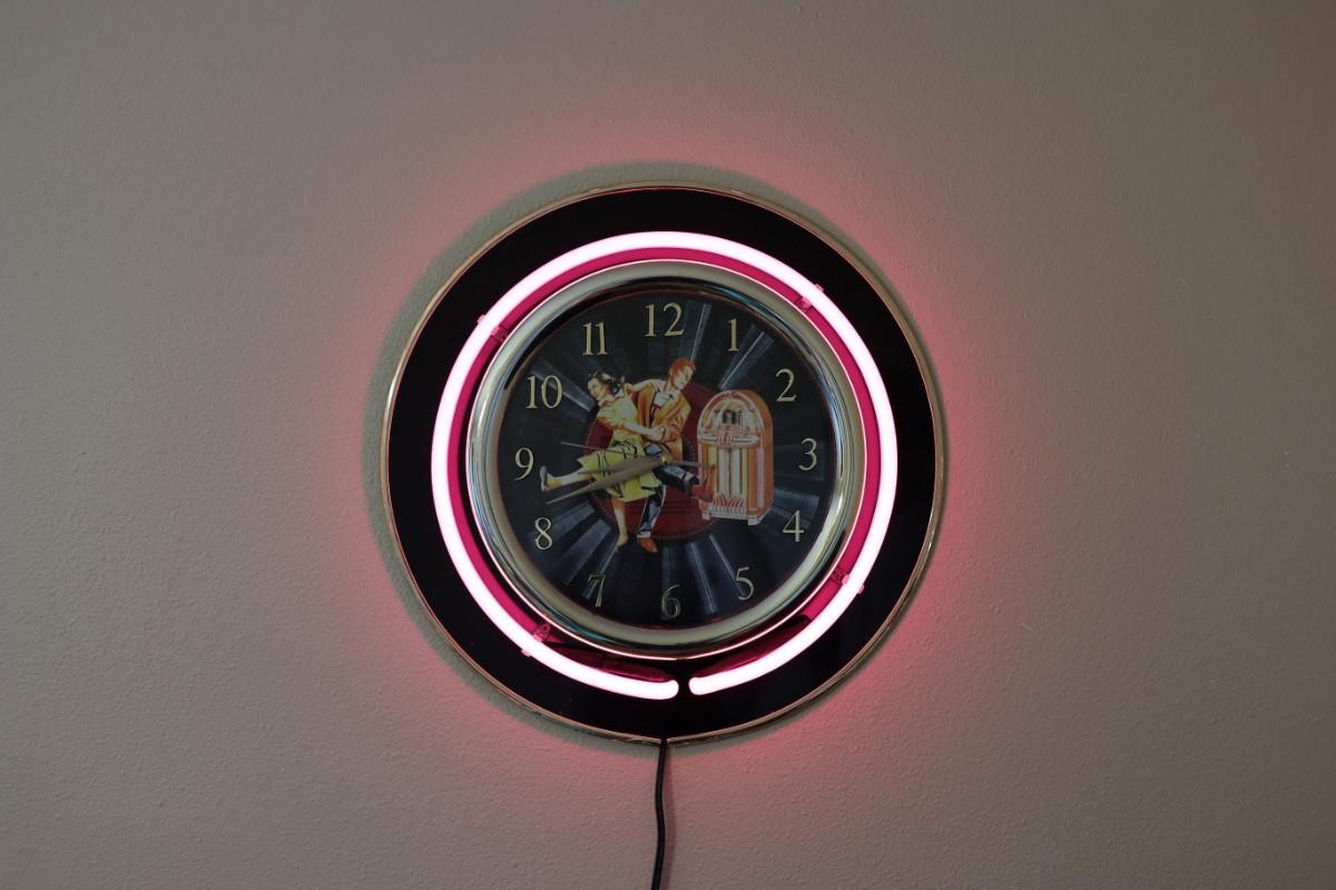 Round neon wall clock with retro jukebox and dancing couple design. Plug-in neon lights illuminate as shown. Paper label on back reads “Big Boys Toys” (store information). Please review photos for details and condition. Clock movement not tested; may require a battery. Neon lights power on as shown.