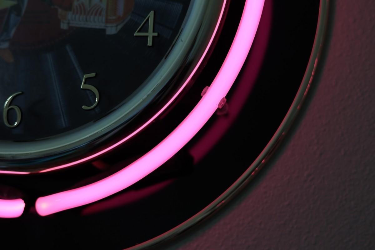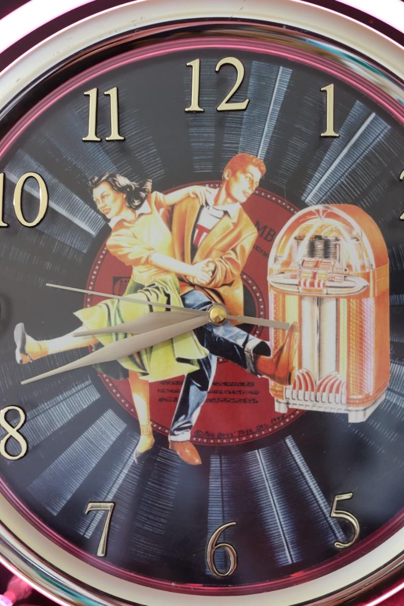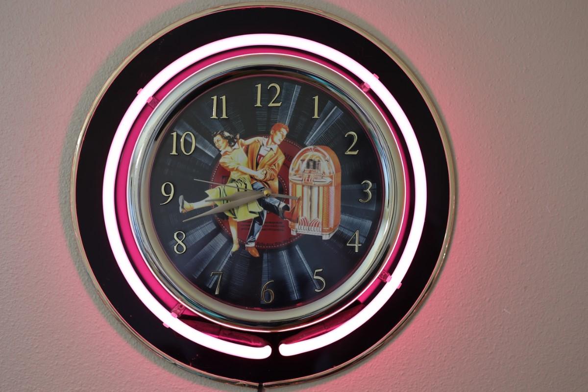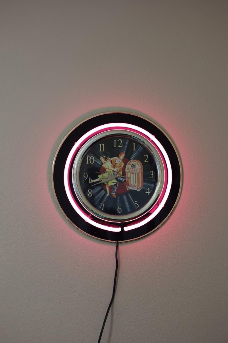 Round neon wall clock with retro jukebox and dancing couple design. Plug-in neon lights illuminate as shown. Paper label on back reads “Big Boys Toys” (store information). Please review photos for details and condition. Clock movement not tested; may require a battery. Neon lights power on as shown.