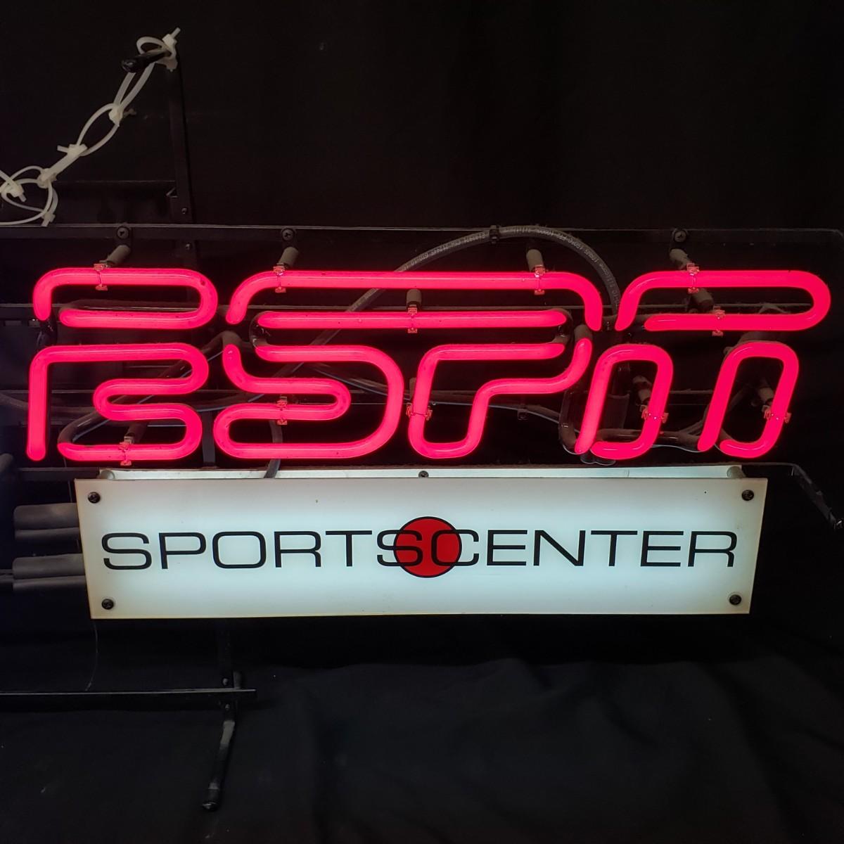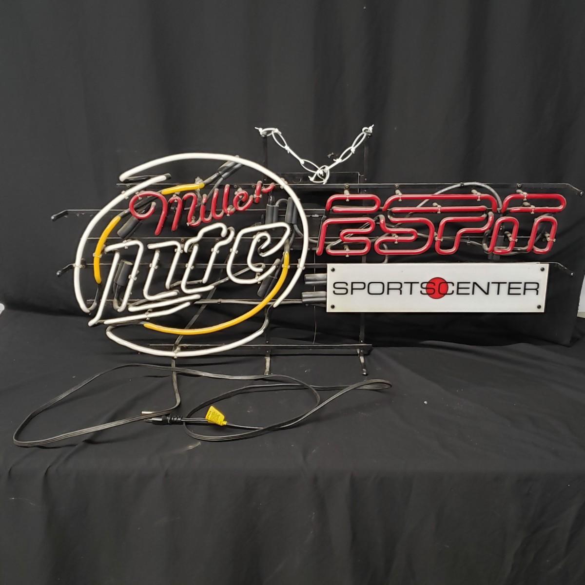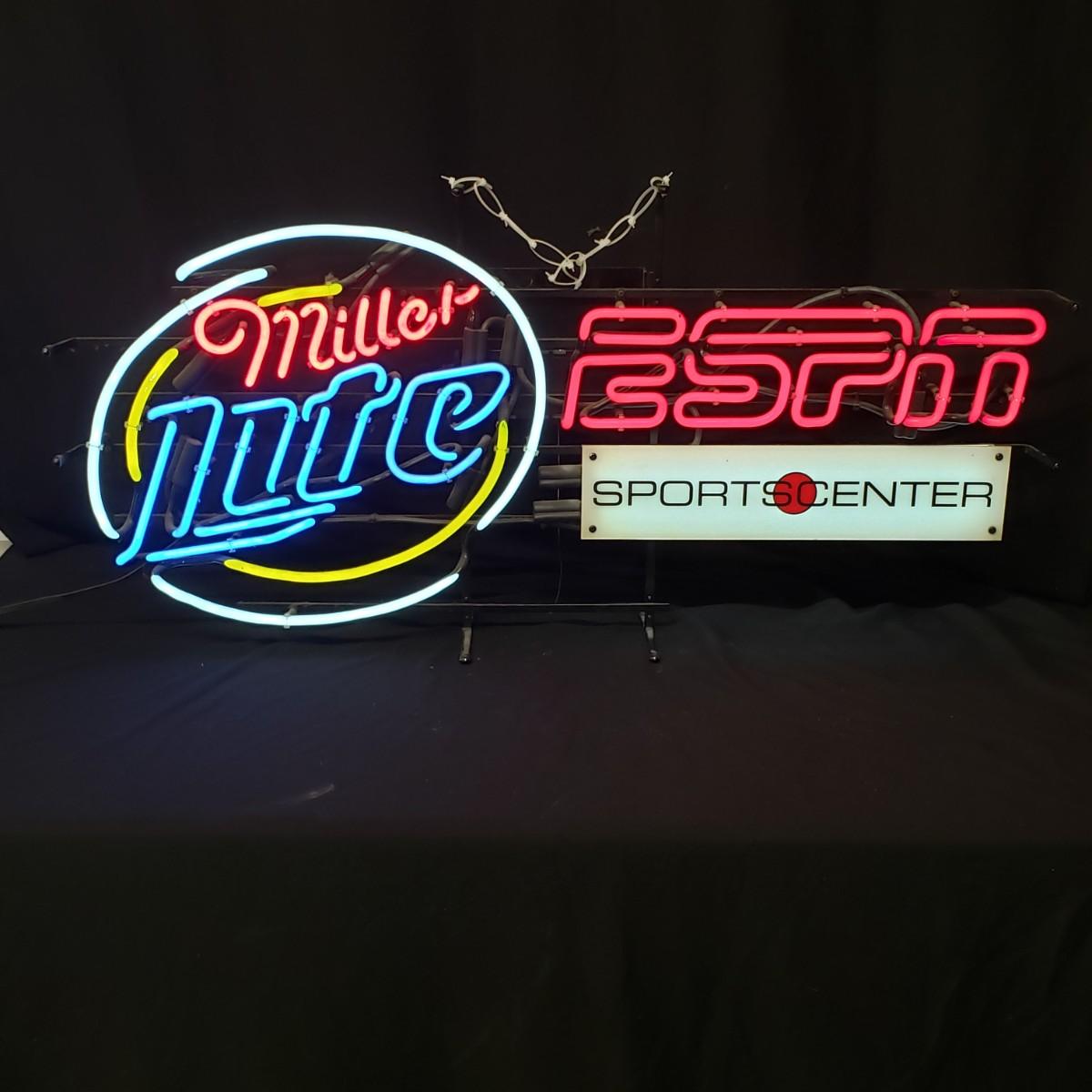 This multicolored Miller Lite ESPN Sports Center neon light measures 3.5"x19"x40". It has an easy pull cord to turn on as shown in the pictures. Shipping available. Shipping Art can be costly please call UPS store at 828-252-6930 for quote.