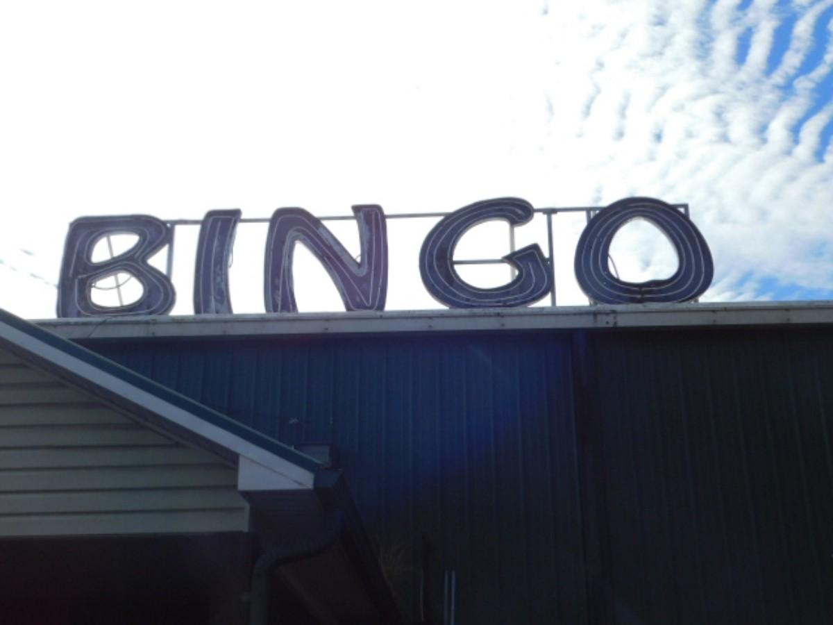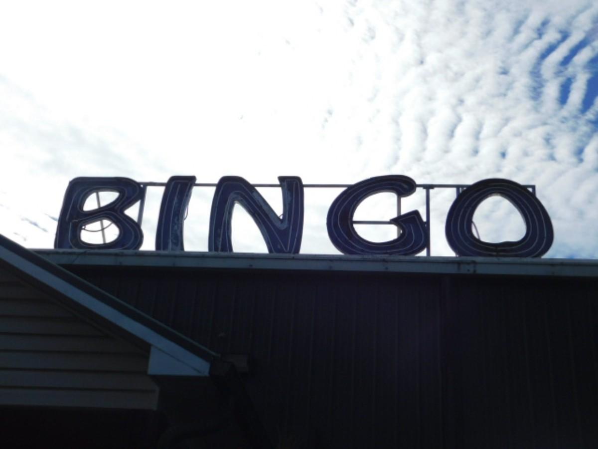 Neon Sign 'BINGO' Attached to Welded Metal Support Rack on Building Roof.