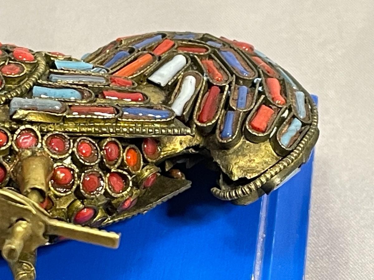 This little rooster looks to be in excellent condition. He is on a removable base and the rooster alone is about 2.5" tall. He is made of copper with small colored stones as embellishments.