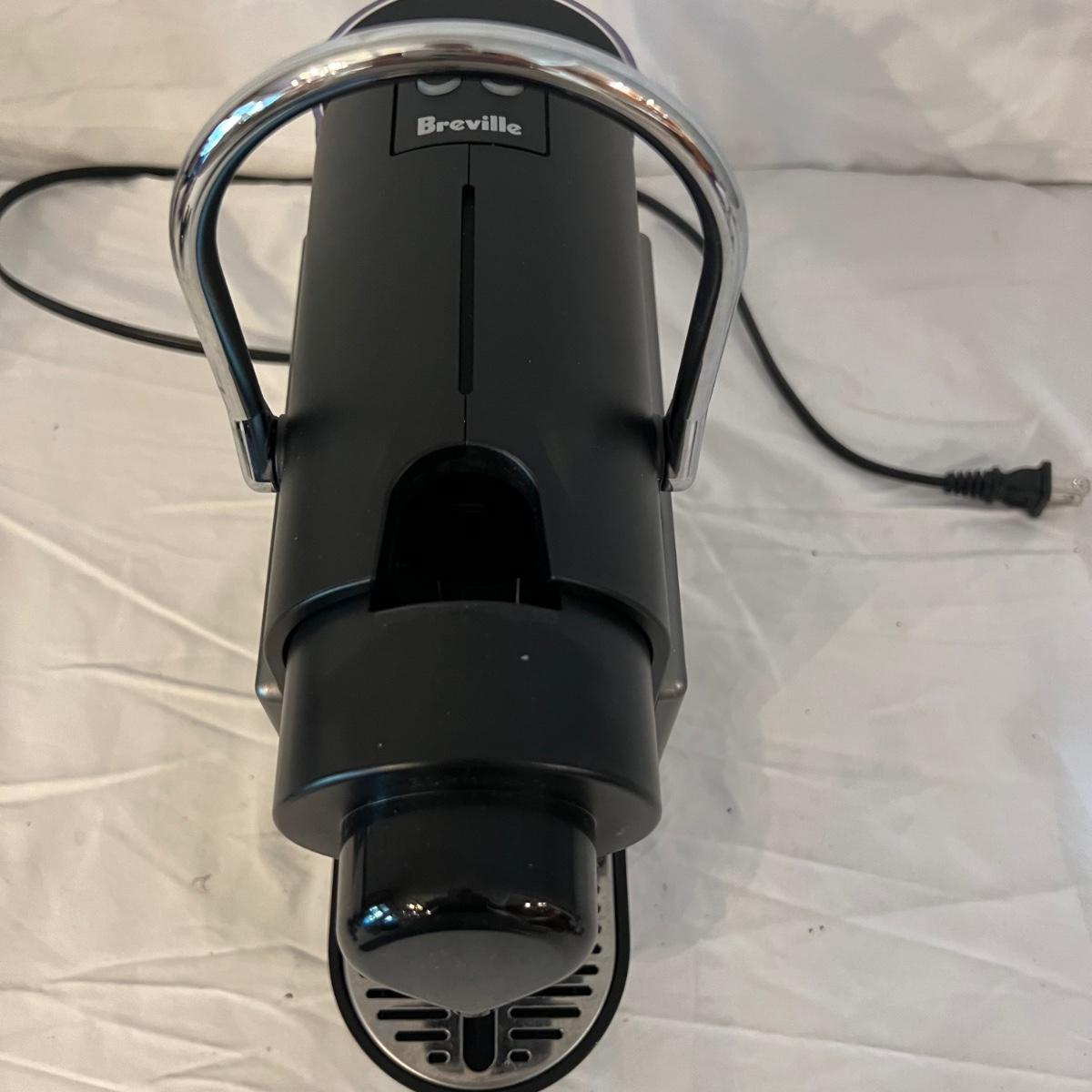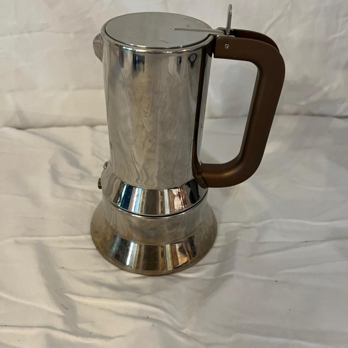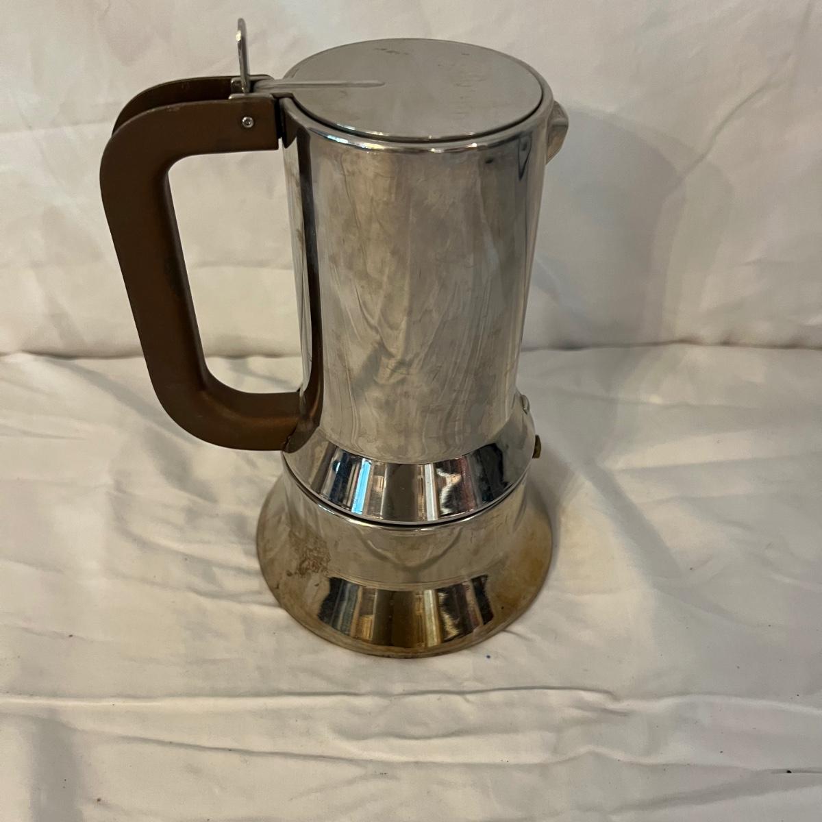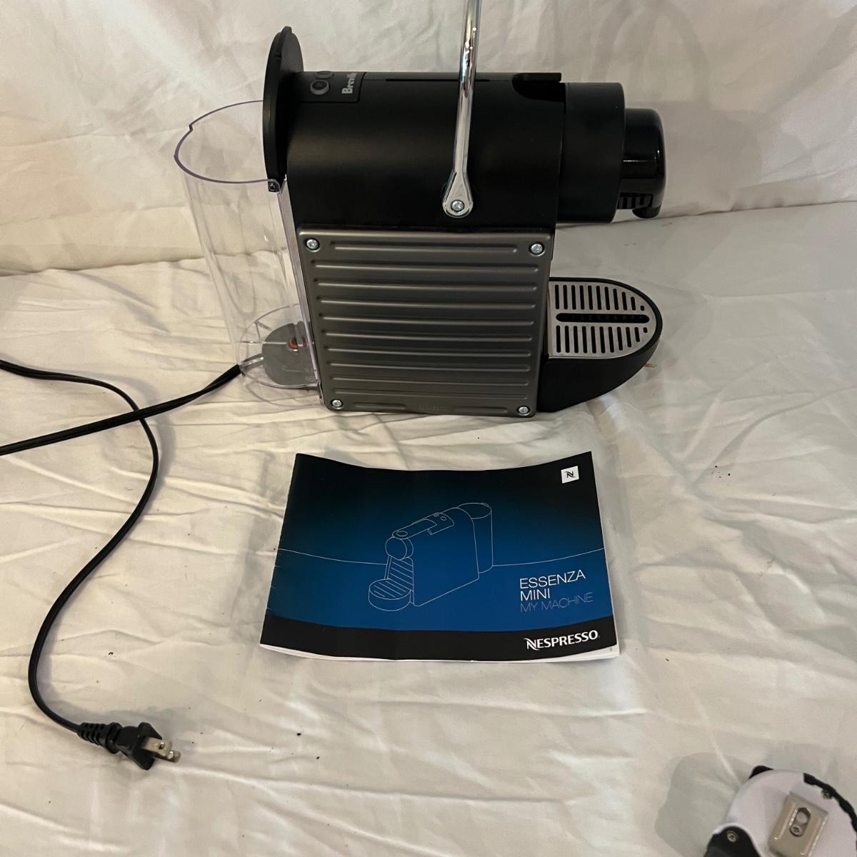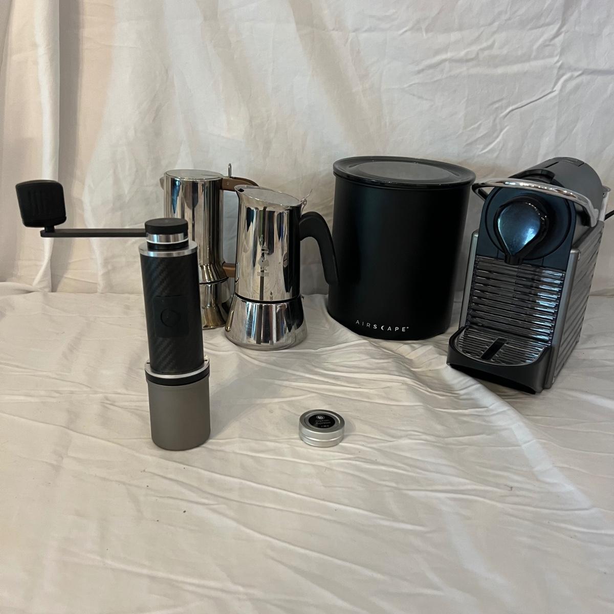 Breville Nepresso Essenza Mini appears to have never been used. It powers on when plugged in. Airscape coffee canister measures 7"D x 8"H. Bialetti stovetop espresso maker and Alessi stovetop espresso maker. Also a Fixie manual coffee grinder and a carafe.