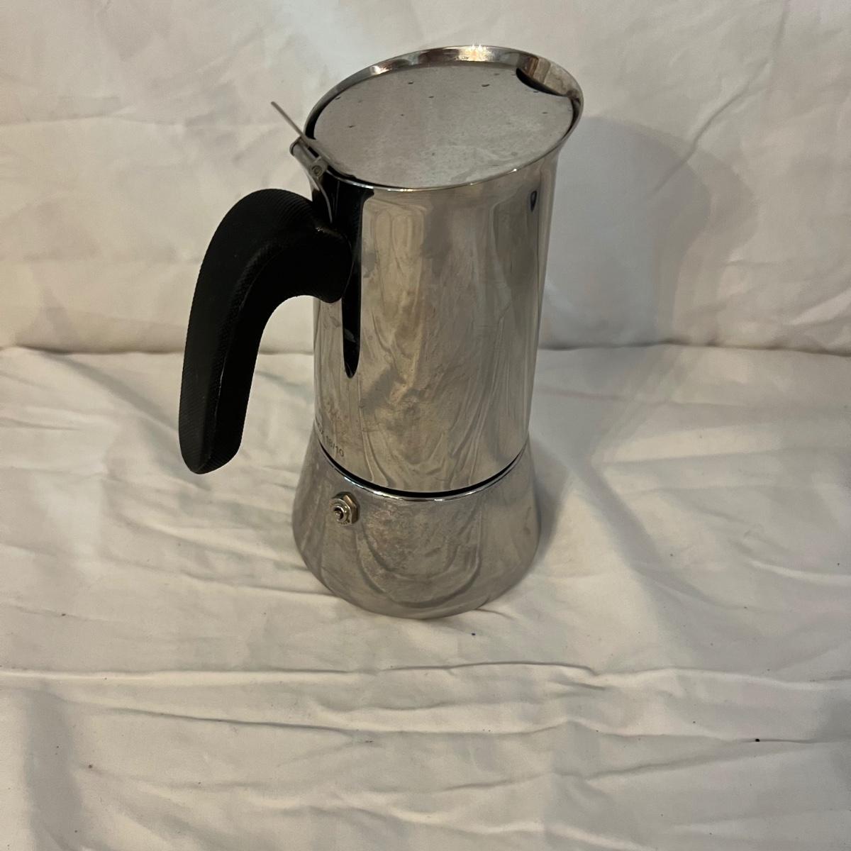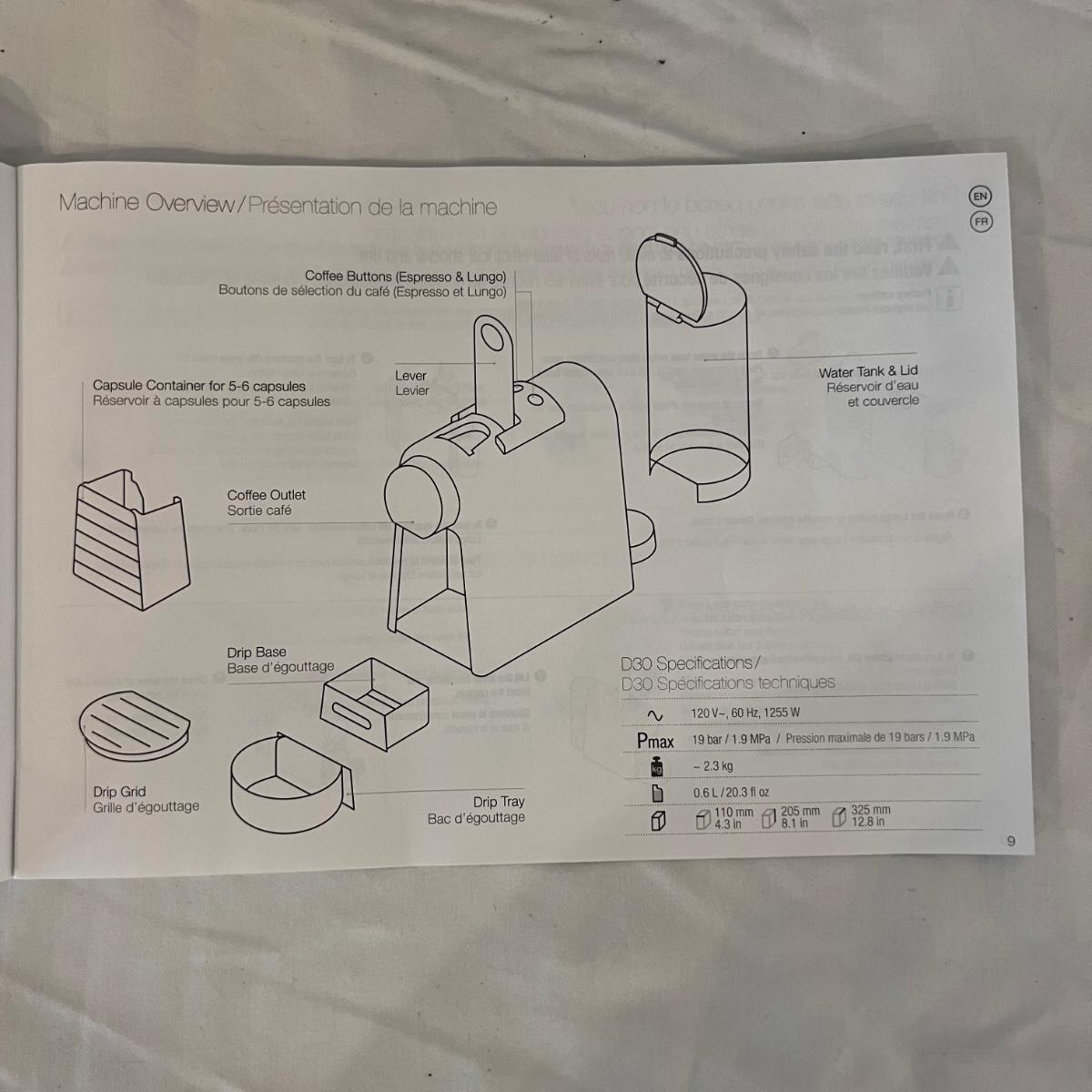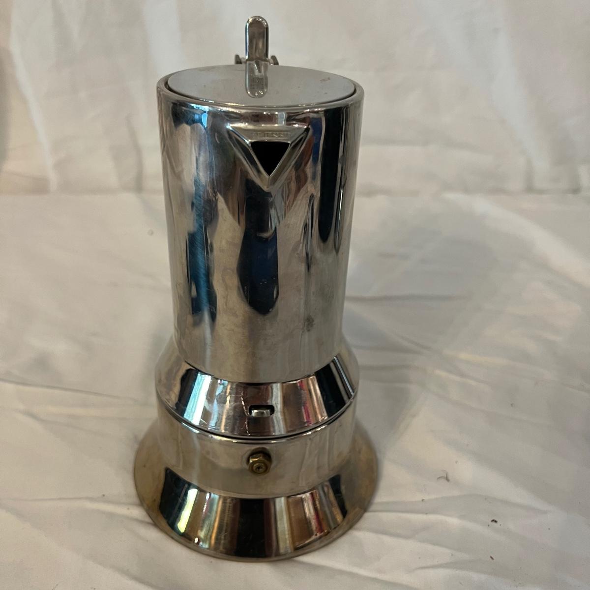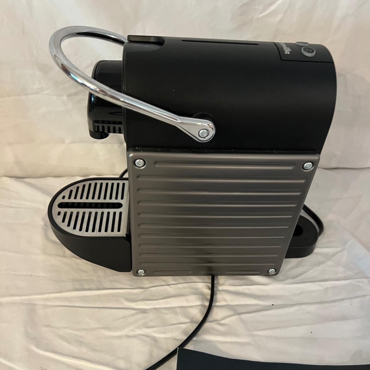 Breville Nepresso Essenza Mini appears to have never been used. It powers on when plugged in. Airscape coffee canister measures 7"D x 8"H. Bialetti stovetop espresso maker and Alessi stovetop espresso maker. Also a Fixie manual coffee grinder and a carafe.