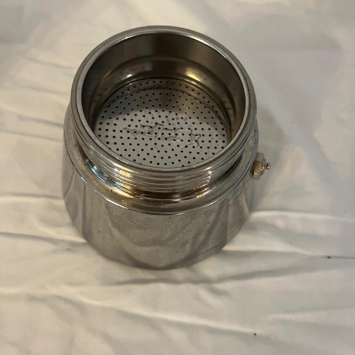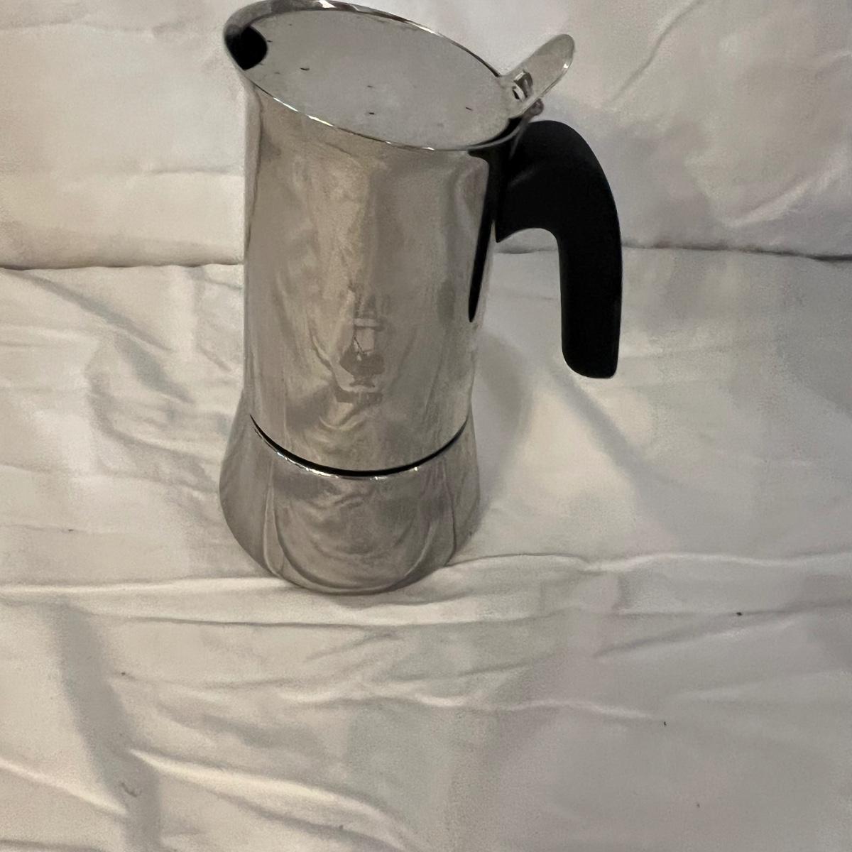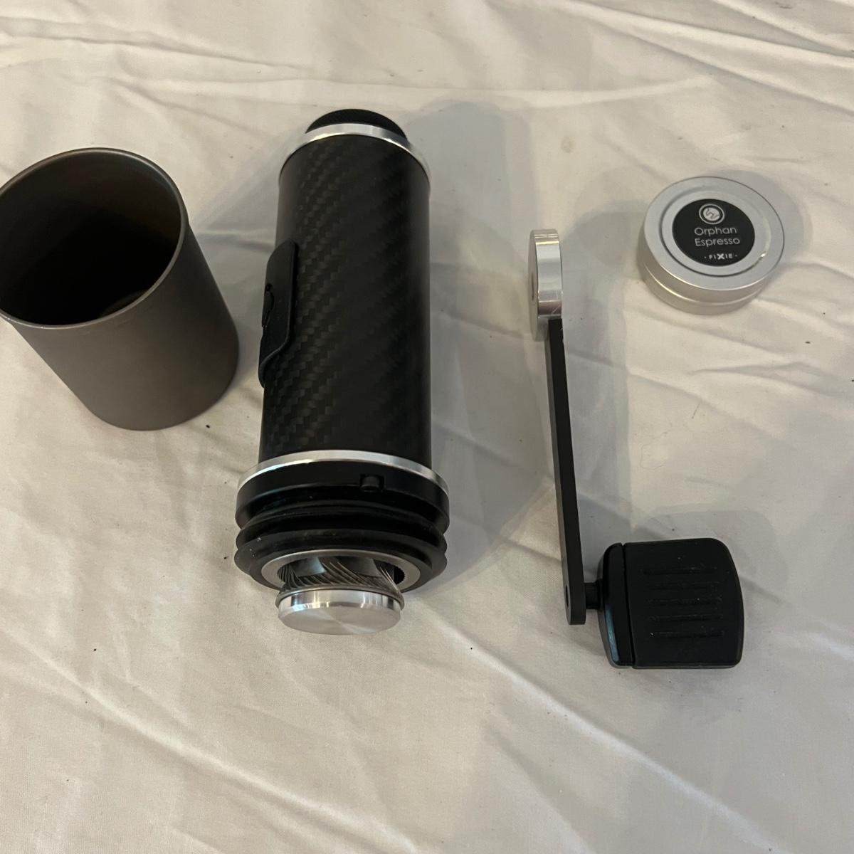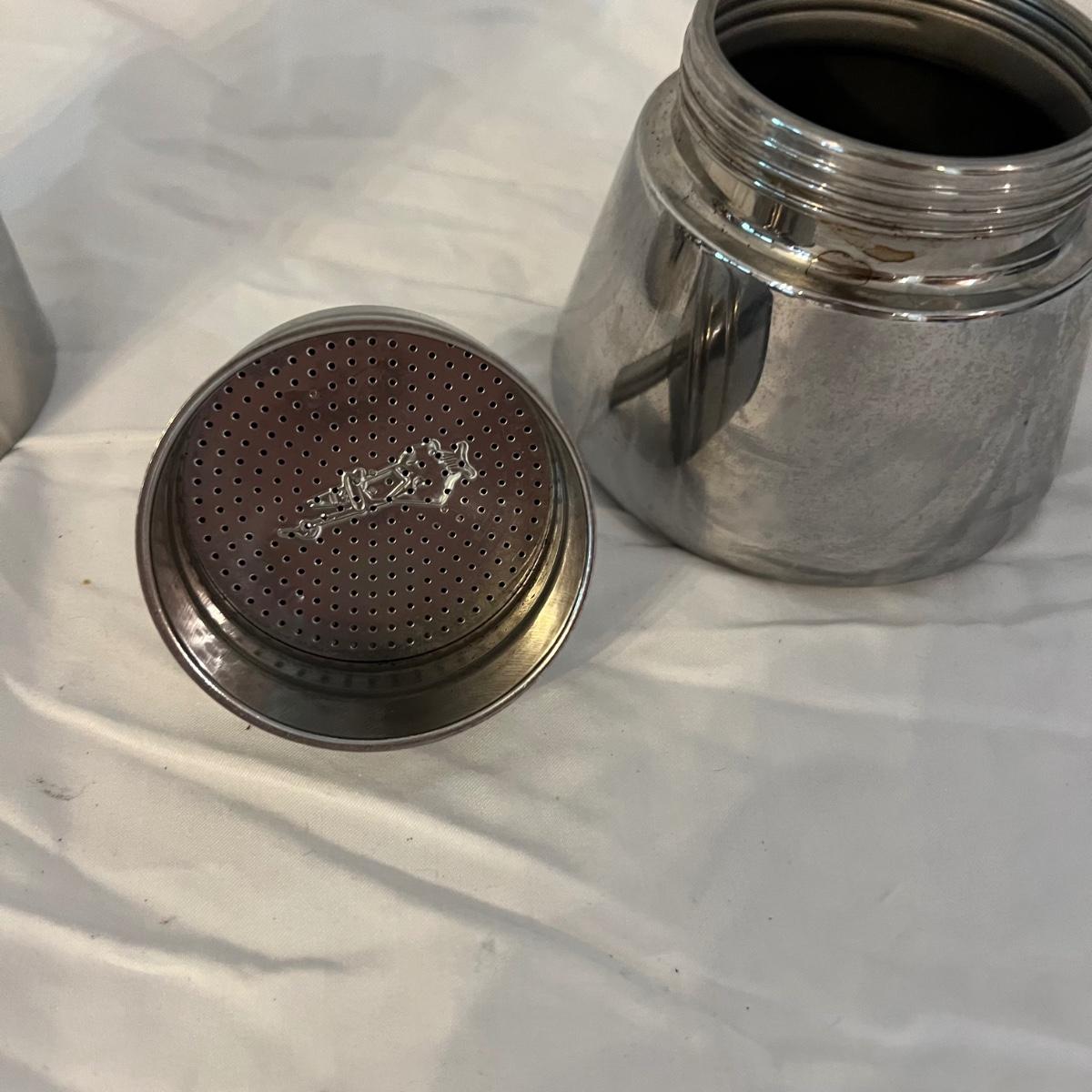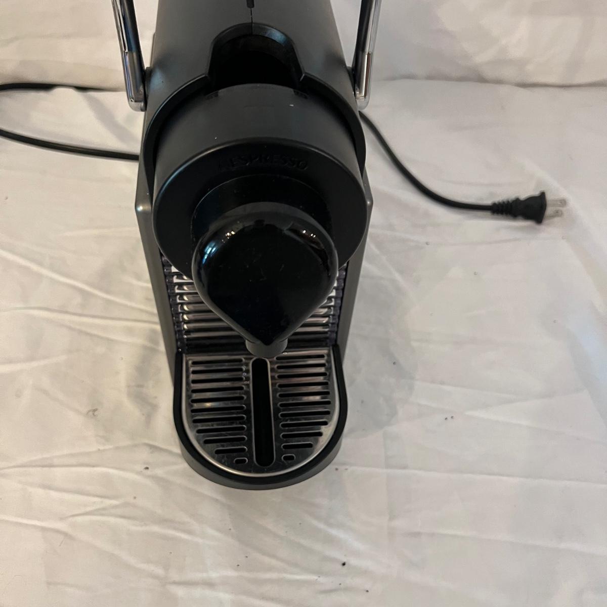 Breville Nepresso Essenza Mini appears to have never been used. It powers on when plugged in. Airscape coffee canister measures 7"D x 8"H. Bialetti stovetop espresso maker and Alessi stovetop espresso maker. Also a Fixie manual coffee grinder and a carafe.