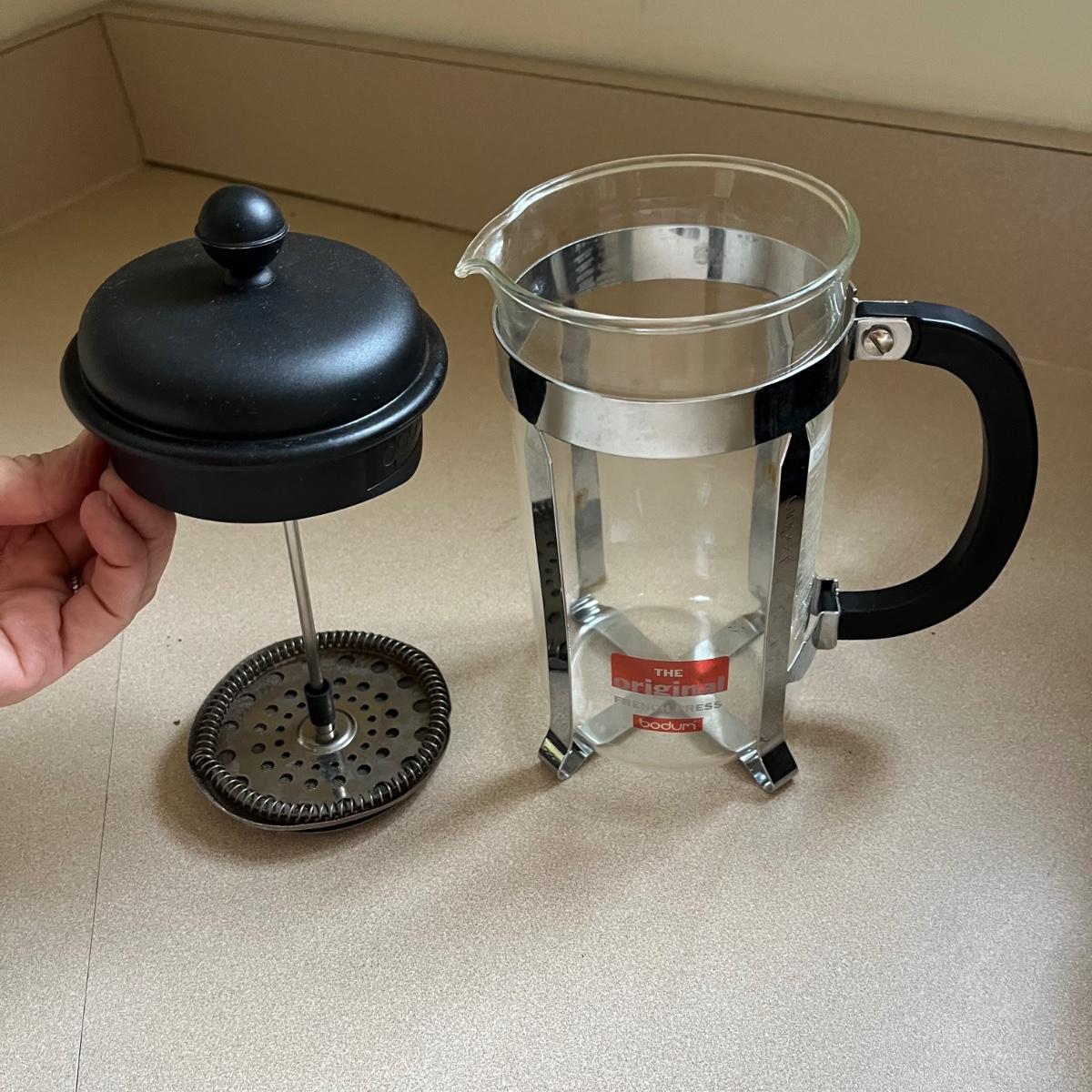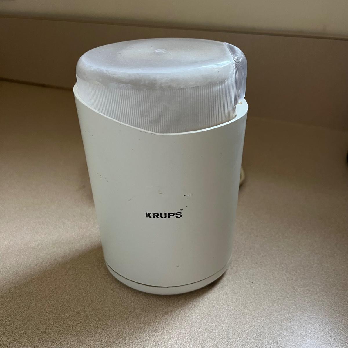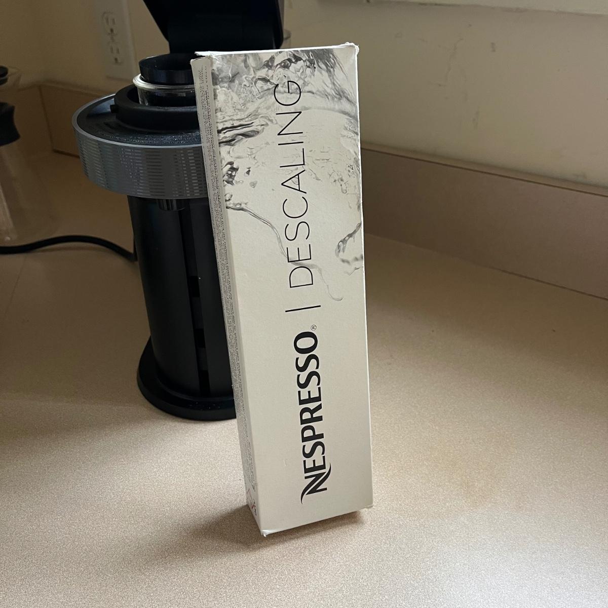 A Nespresso coffee and espresso maker with descaling cleaner, an Original french press by Bodum, a Nespresso glass carafe and a Krups whole bean coffee grinder. See picture for details.