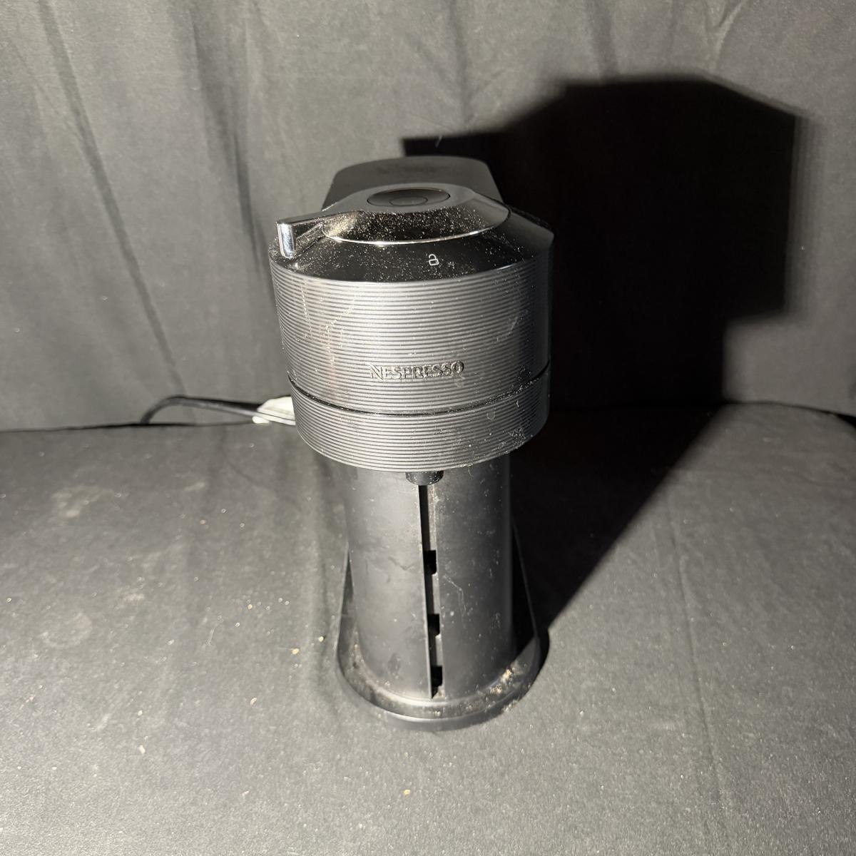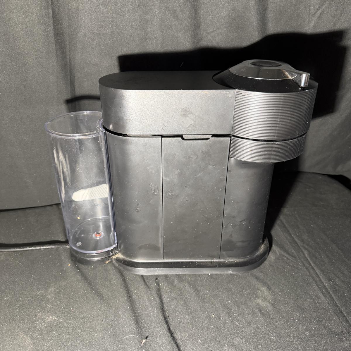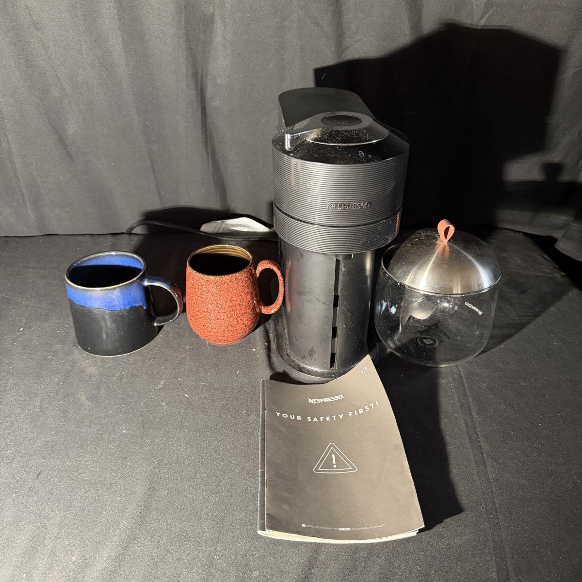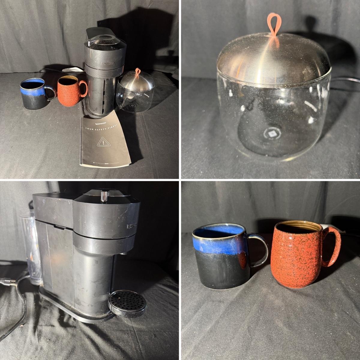 Lot includes a Nespresso Vertuo Next coffee machine with a glass Nespresso pod jar and two ceramic coffee mugs. Machine powered on when plugged in and measures 6” x 16” x 13”H.