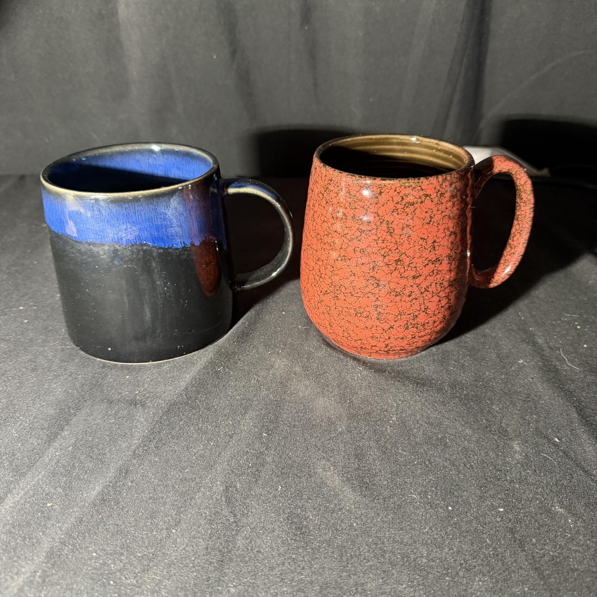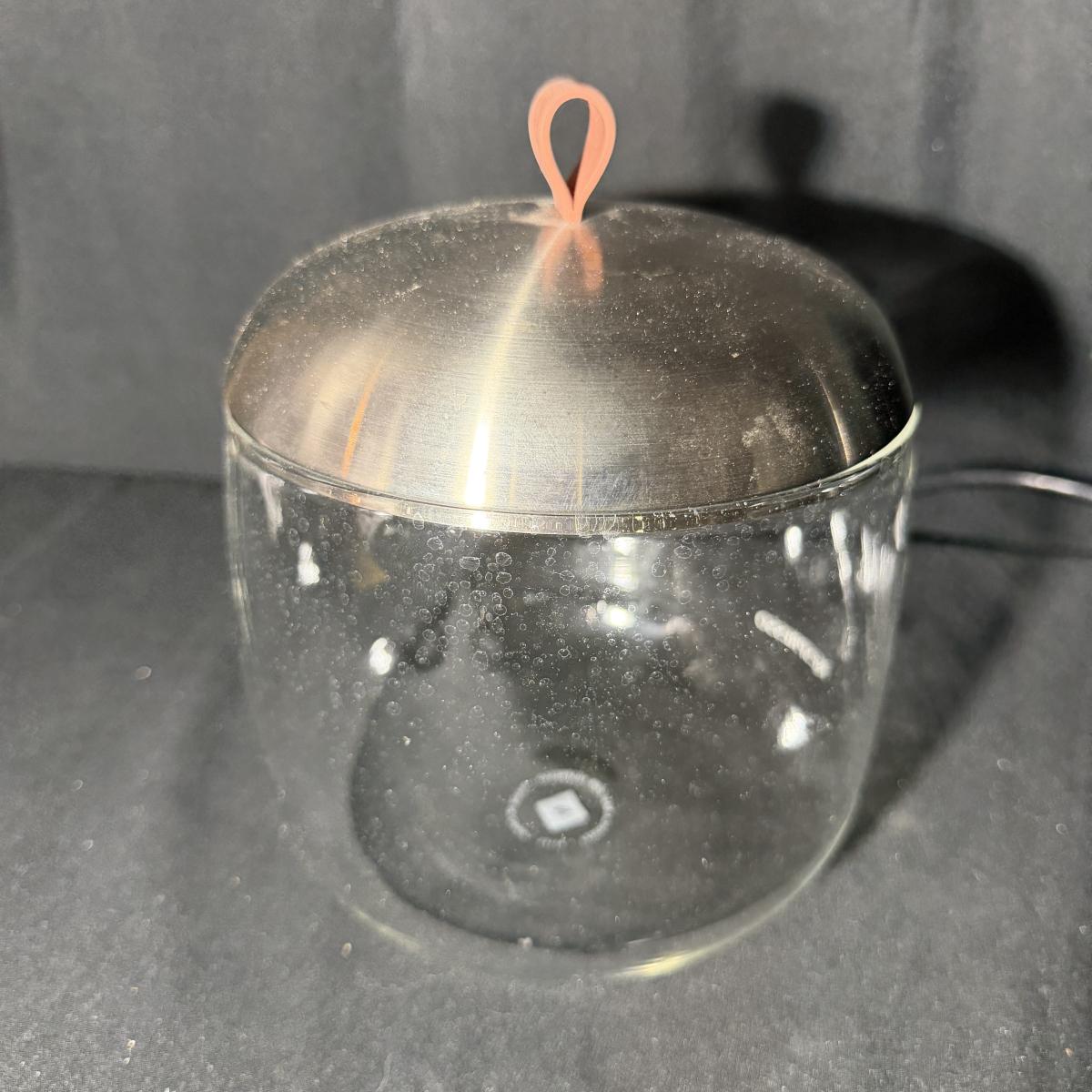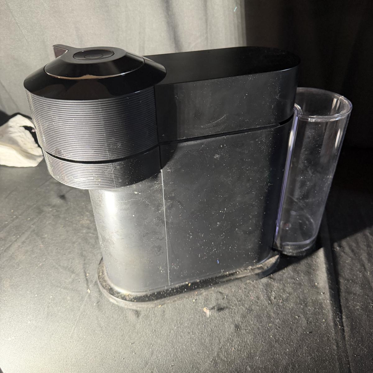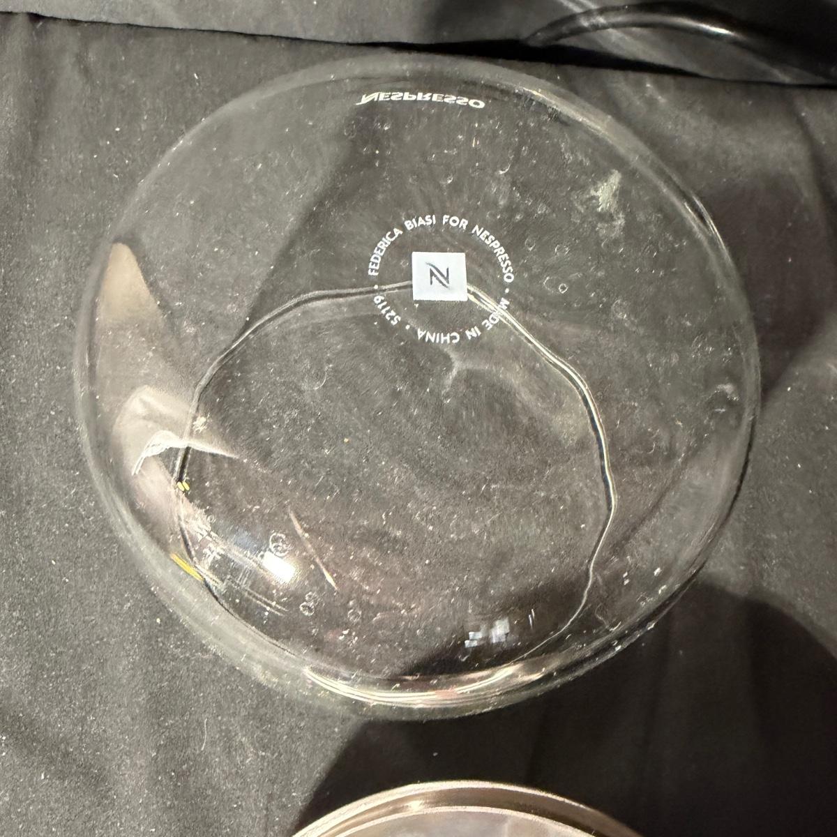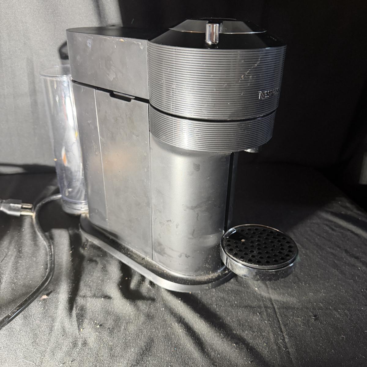 Lot includes a Nespresso Vertuo Next coffee machine with a glass Nespresso pod jar and two ceramic coffee mugs. Machine powered on when plugged in and measures 6” x 16” x 13”H.