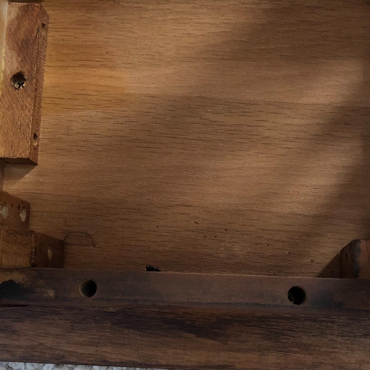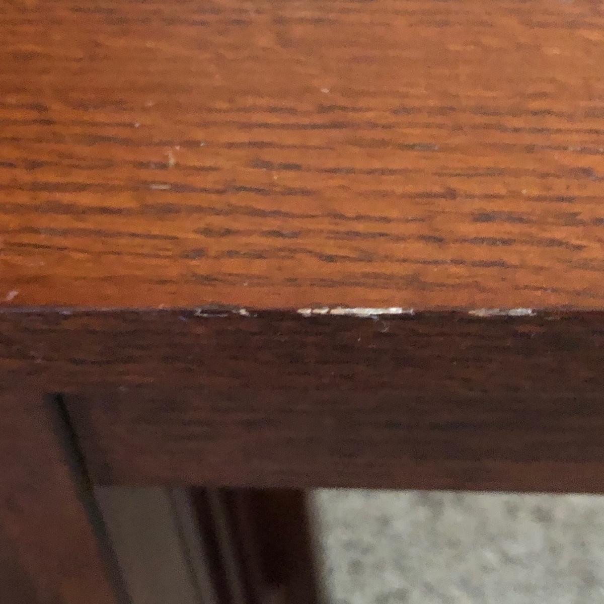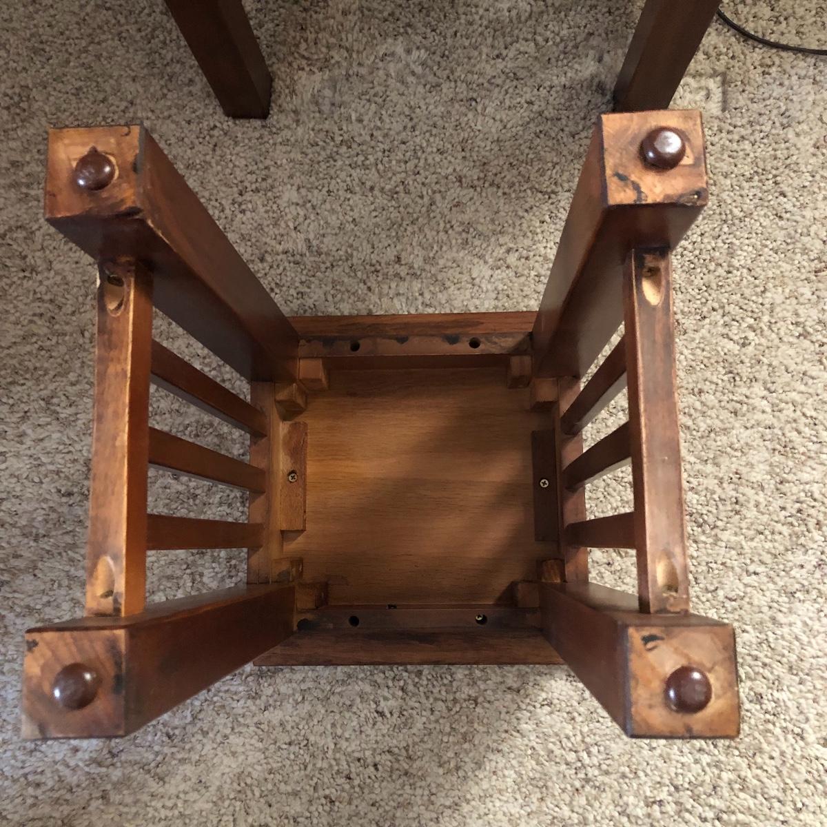 There are two tables with the smaller one fitting inside of the larger one. The largest one measures 22” x 14” x 24”. Notice the bow tie craftsmanship. The tables are a mix of pressed wood and wood. Local pick up only.