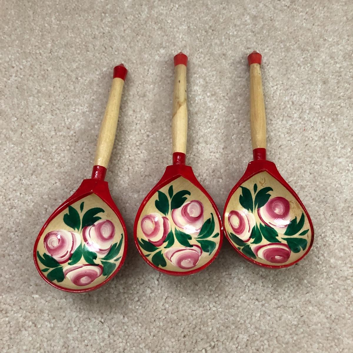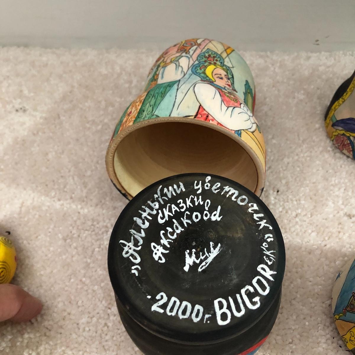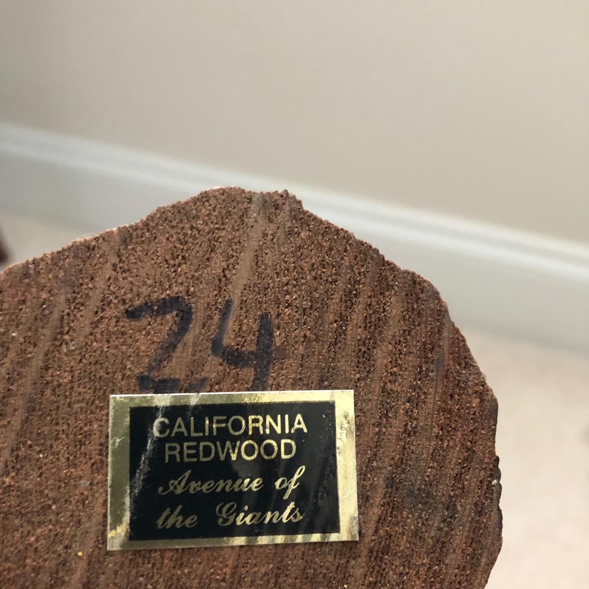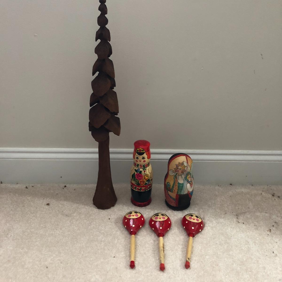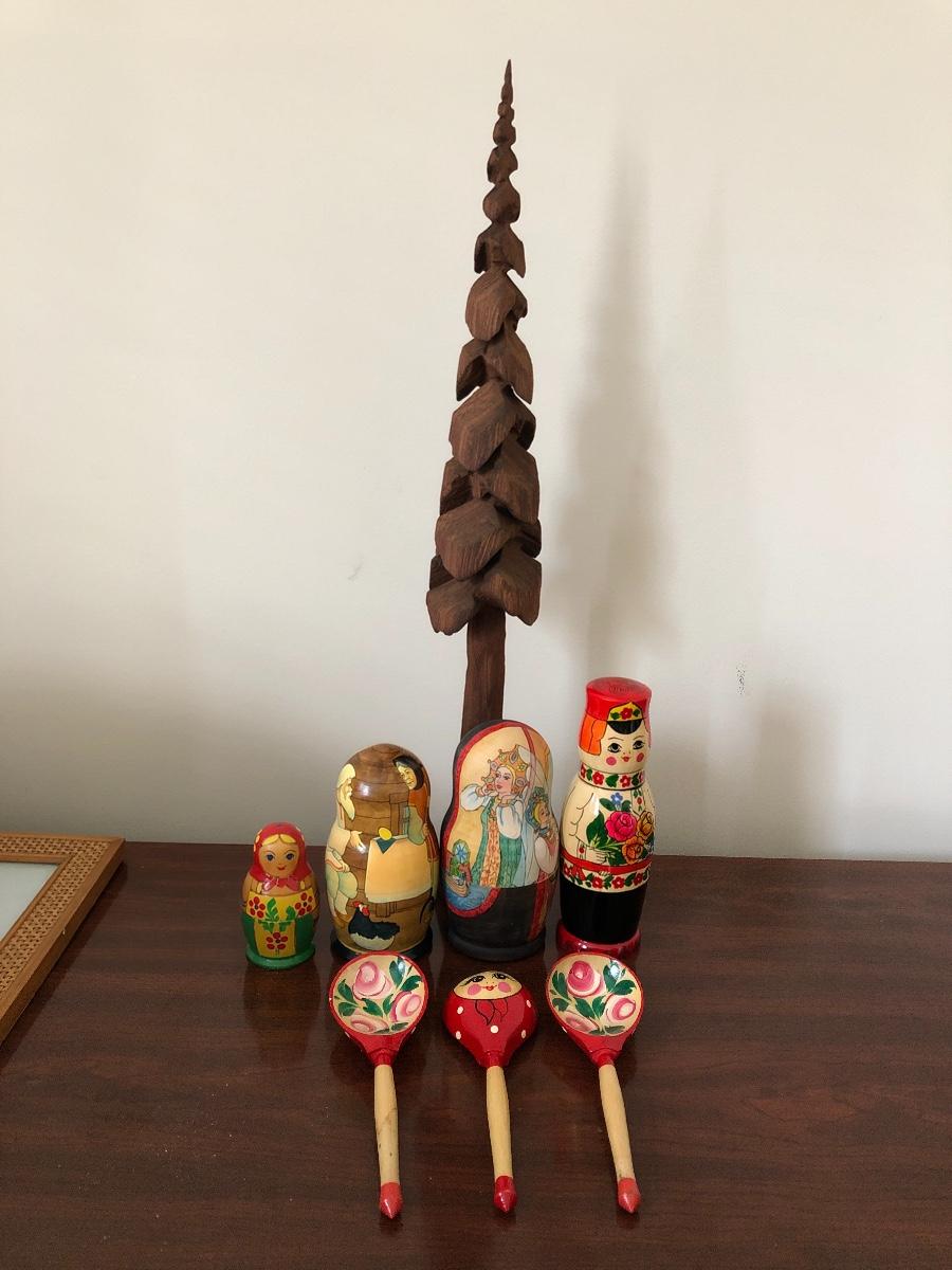 Lot includes four nesting dolls, three decorative wooden spoons and a carved tree from a California Redwood.