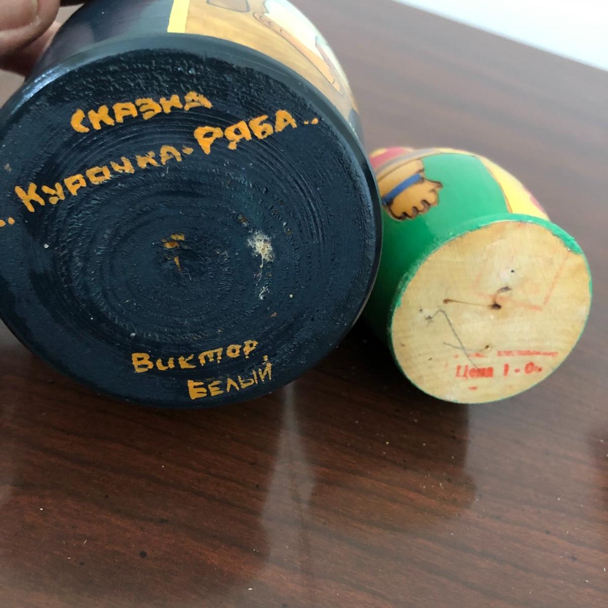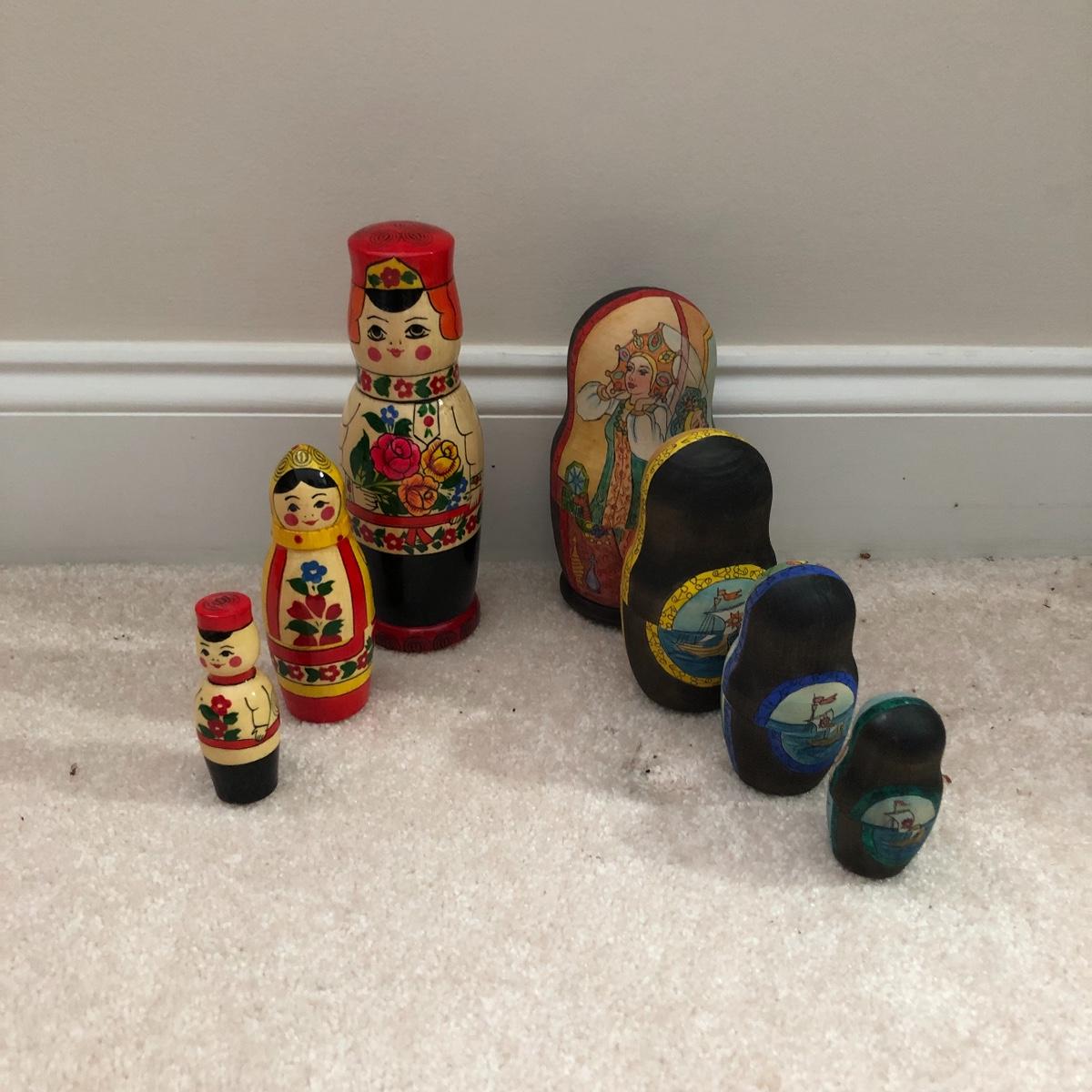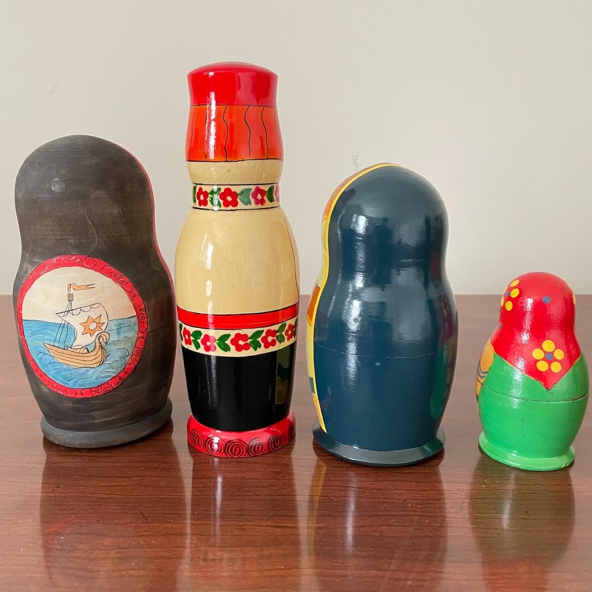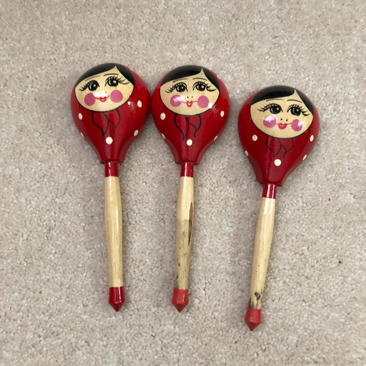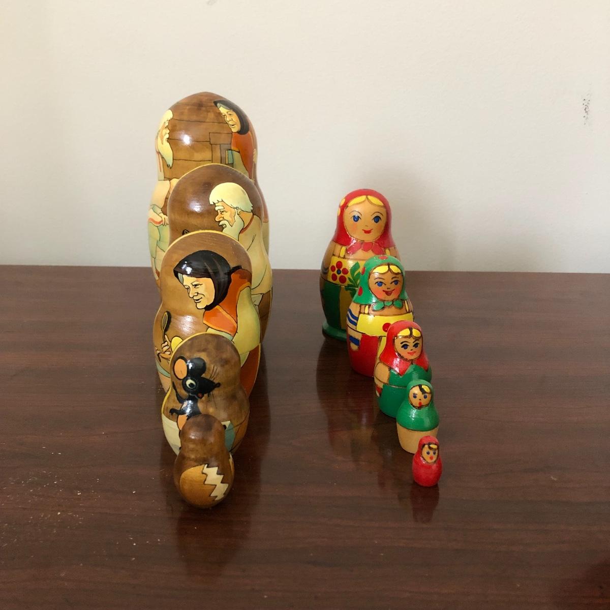 Lot includes four nesting dolls, three decorative wooden spoons and a carved tree from a California Redwood.