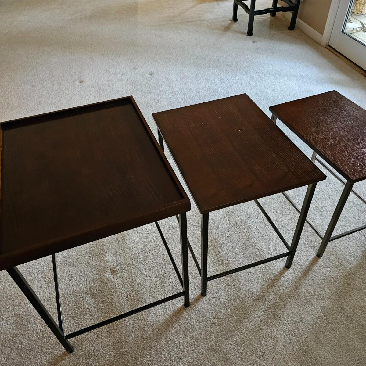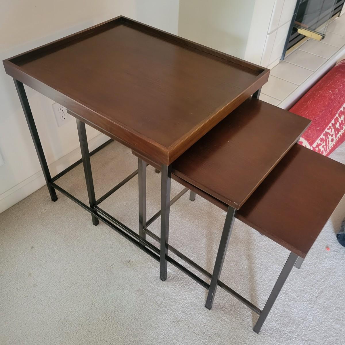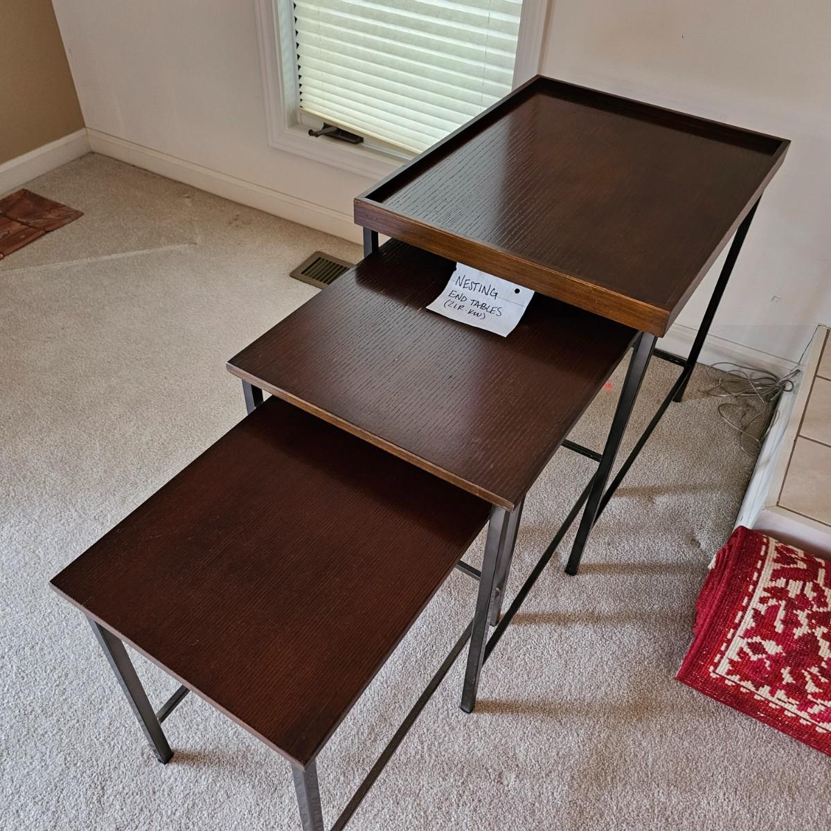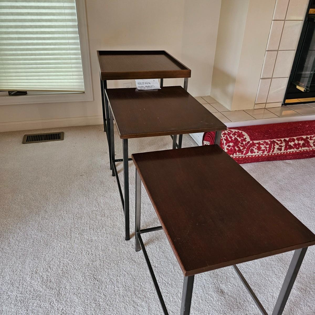 Set of three Hammary nesting end tables. Tables have wood tops with metal legs. Tables have some light blemishes, see photos for more details. Largest table measures, 25” x 20” x 25”H. Local pick-up only.