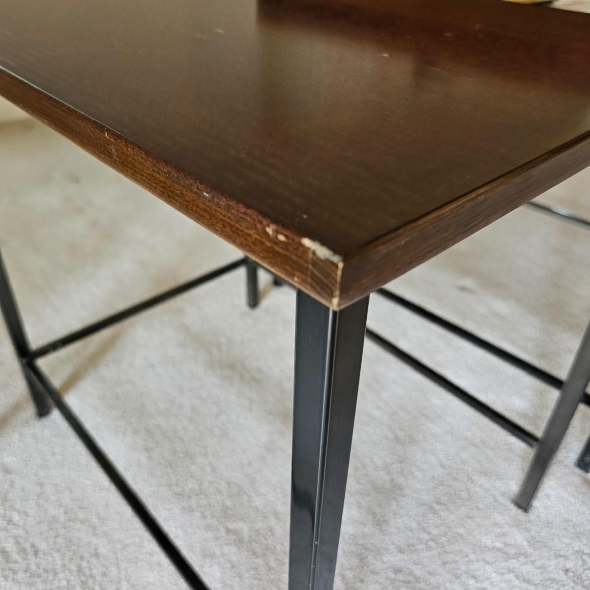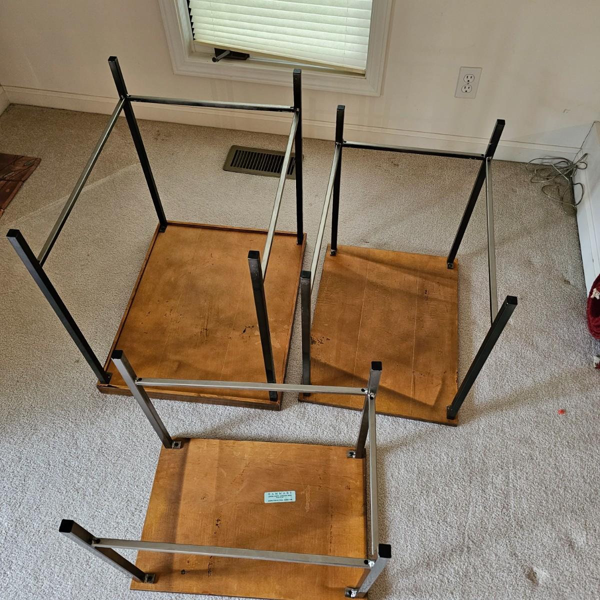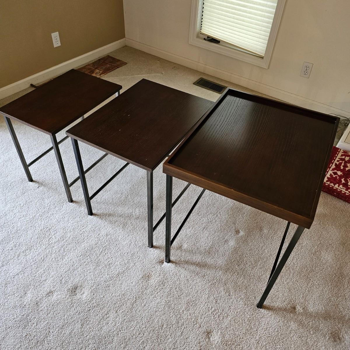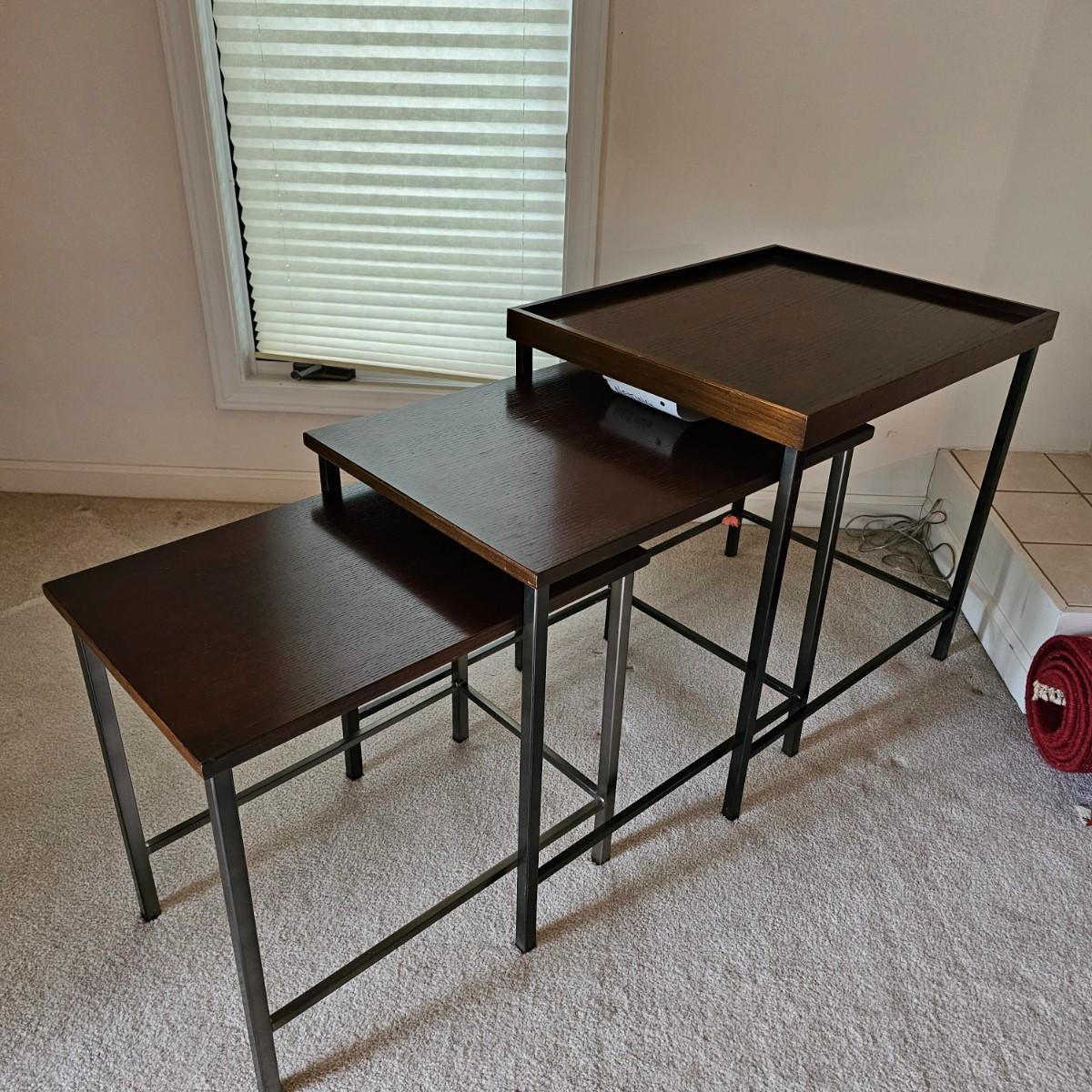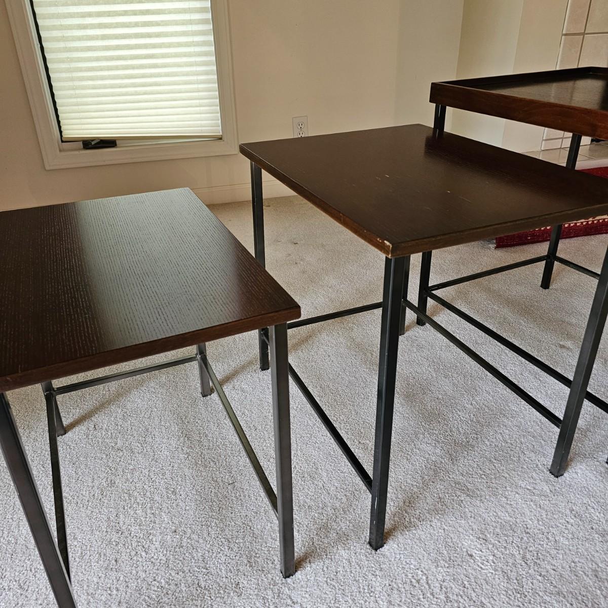 Set of three Hammary nesting end tables. Tables have wood tops with metal legs. Tables have some light blemishes, see photos for more details. Largest table measures, 25” x 20” x 25”H. Local pick-up only.