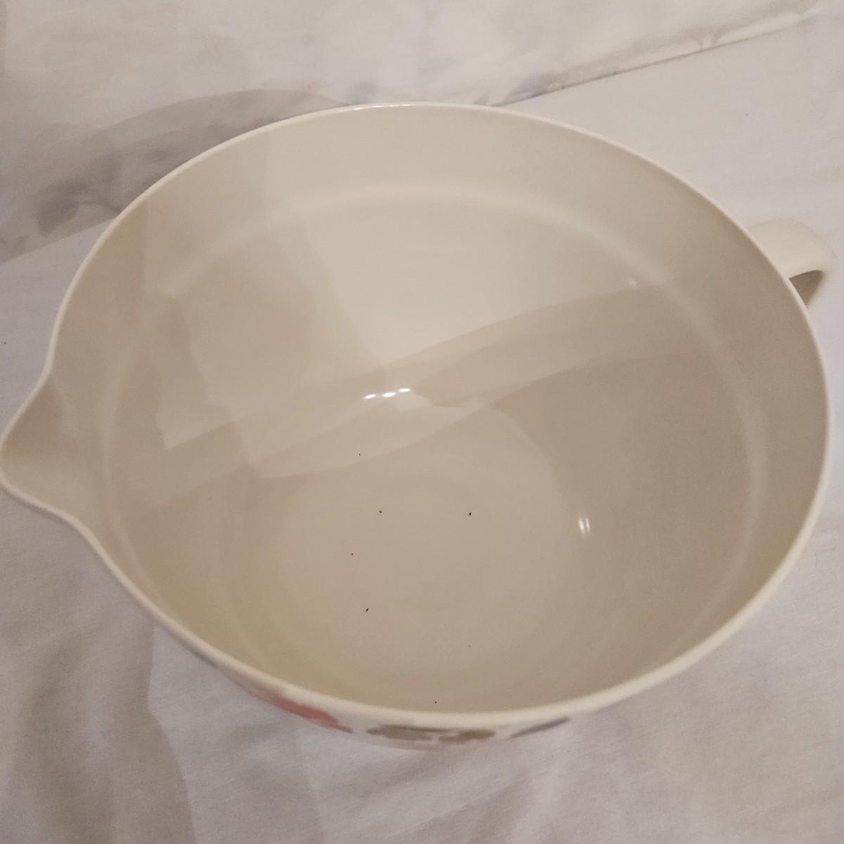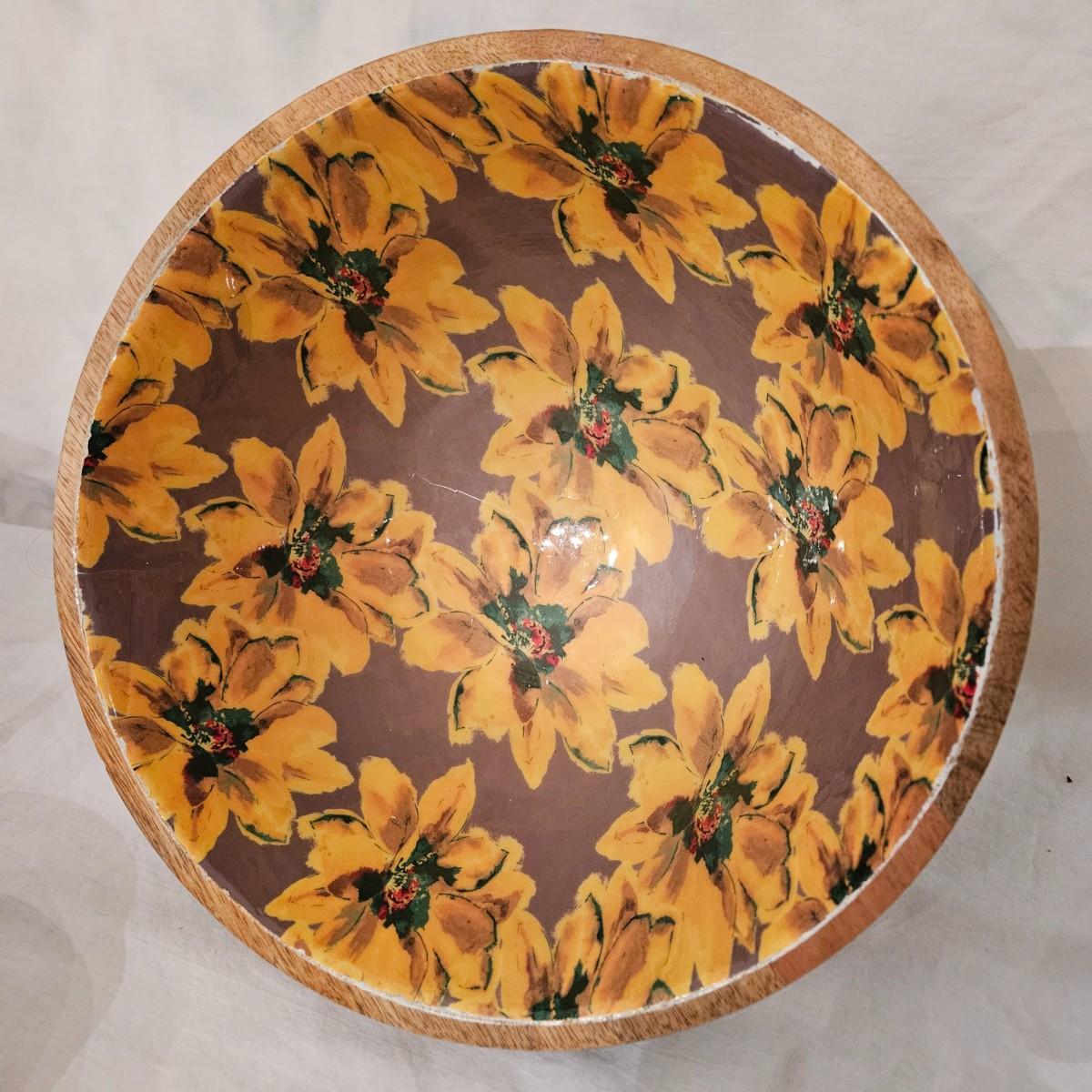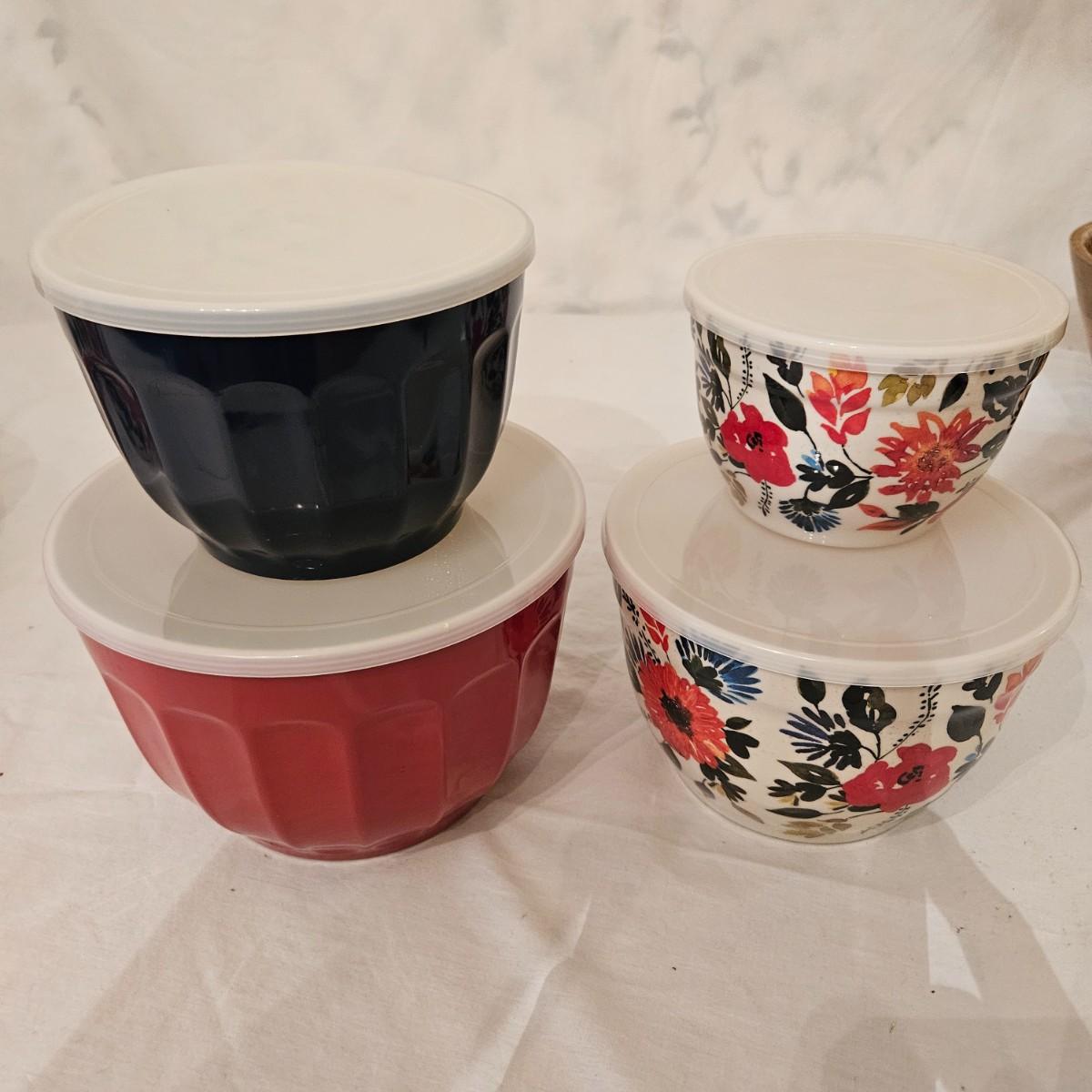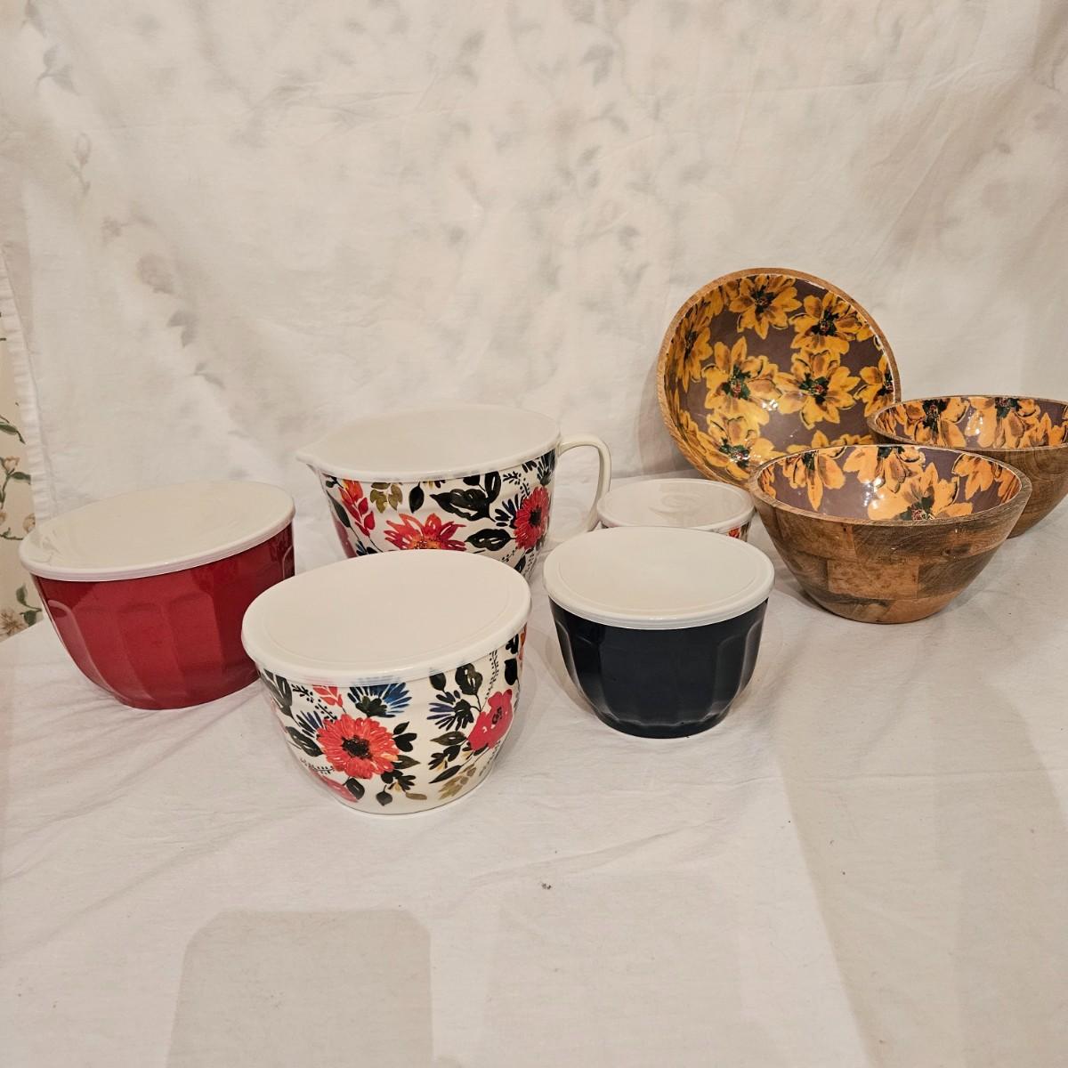 A set of pitchers with four nesting bowls that have lids. The pitcher measures approximately 9.5"D x 6"H. Also included are three wooden bowls with a laminate like interior floral design. Please see photos for details. Shipping available