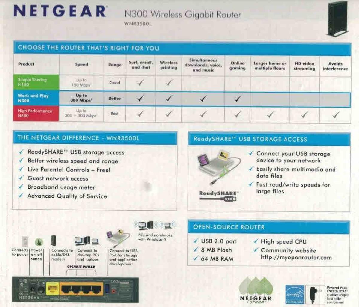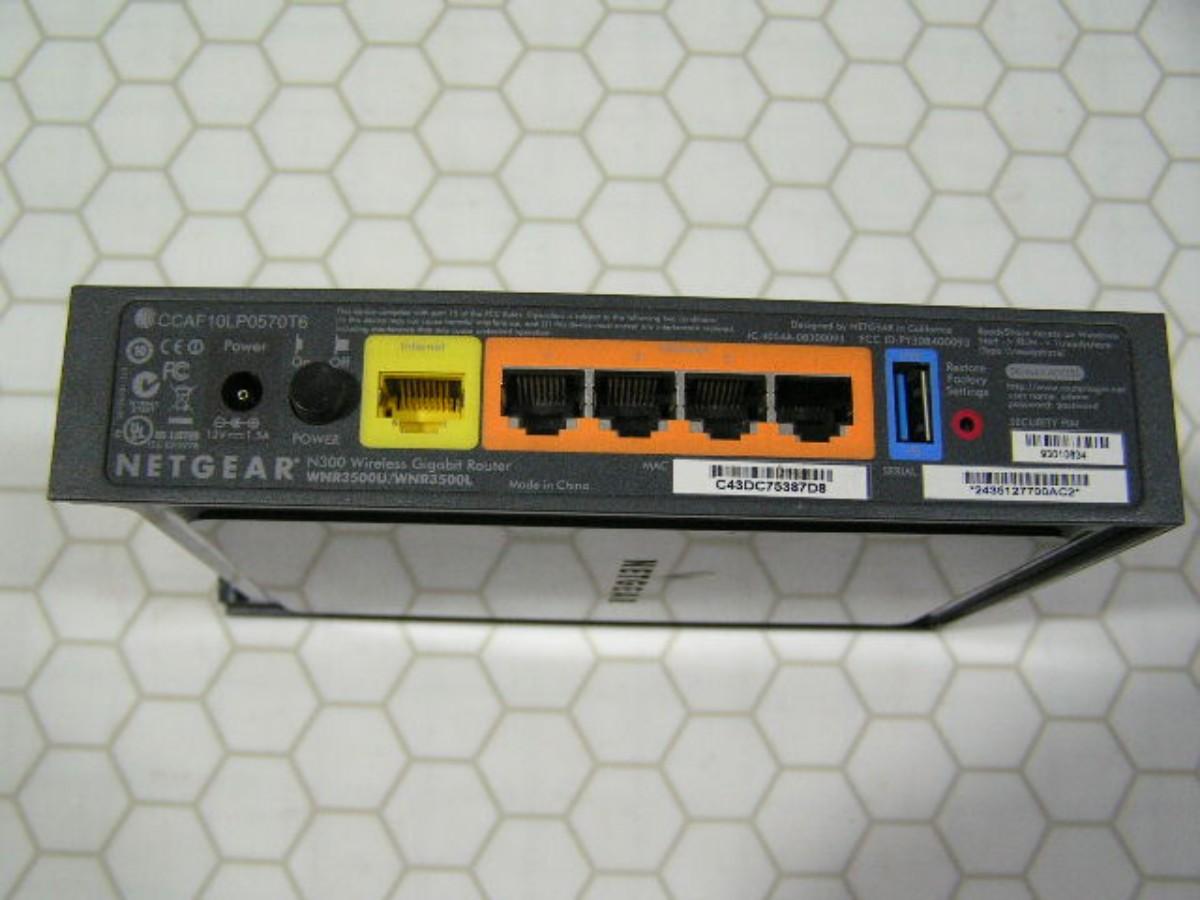 NETGEAR N300 Wireless Gigabit Router w/USB storage access. Open Source router. 4-Port Gigabit LAN. Up to 300Mbps data rate wireless. 1 WAN port. Connect your USB 2.0 hard drive for network storage or other USB device. 8MB Flash, 64MB RAM, Hi speed CPU. In OE box. Mod# WNR3500L