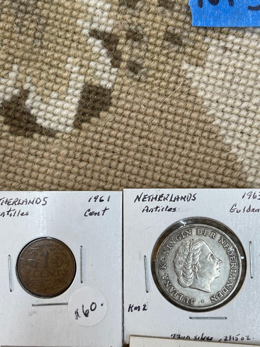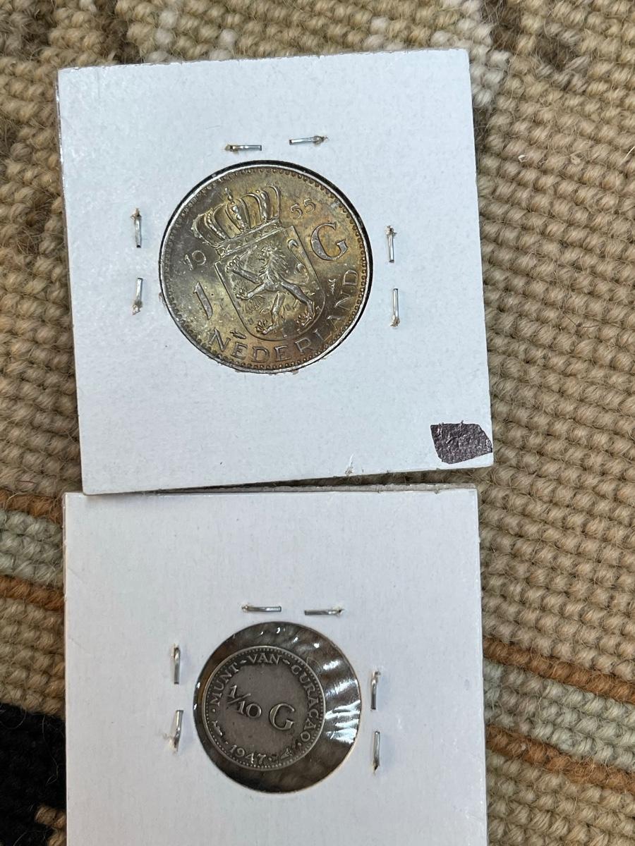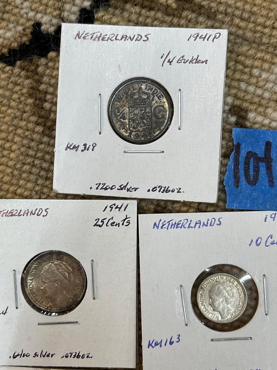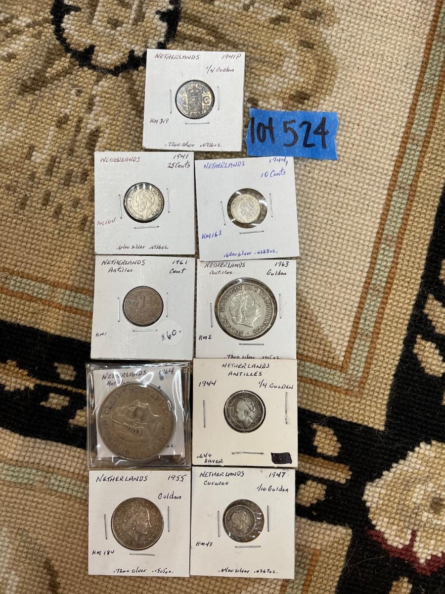 (9) vintage Netherlands coins - 1941P 1/4 glucklen, 1941 25 cents, 1944P 10 cents, 1961 1 cents, 1963 gulden, 1964 2-1/2 G, 1944 1/4 gulden, 1955 gulden, 1947 1/10 gulden