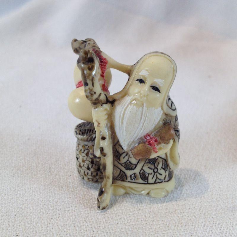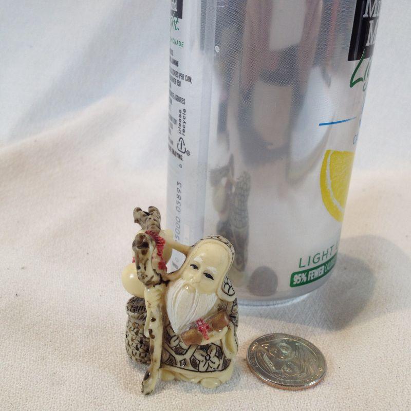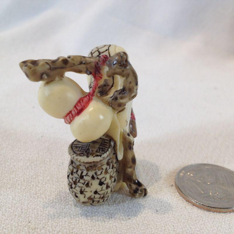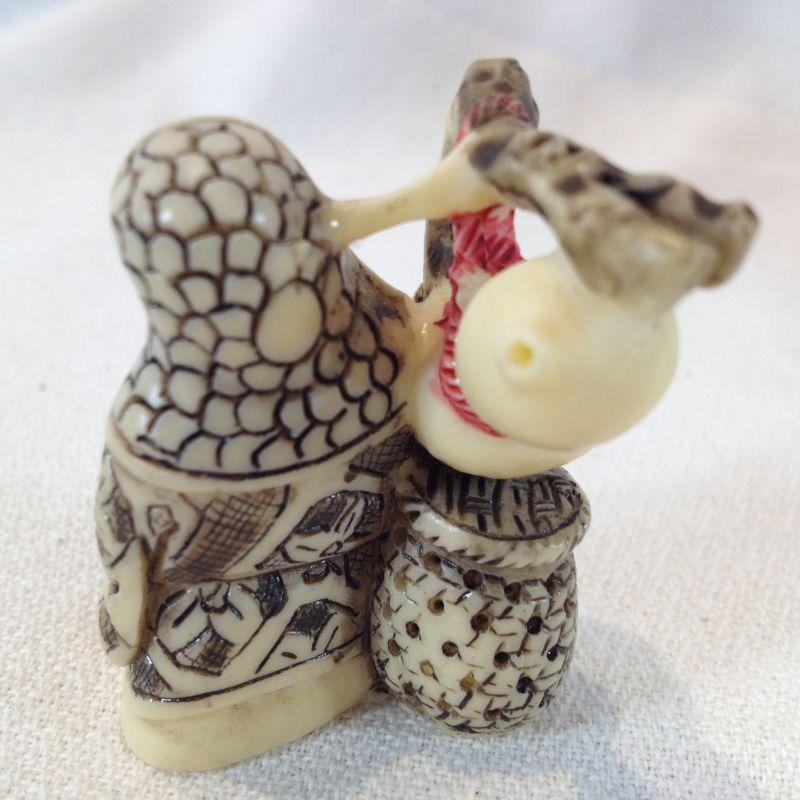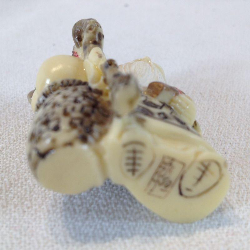 This lot is a nice example of the Japanese art of Netsuke. This miniature piece is hand-carved and hand-painted out of Ivoryite (faux ivory). It is very ornate and artist signed on the bottom.