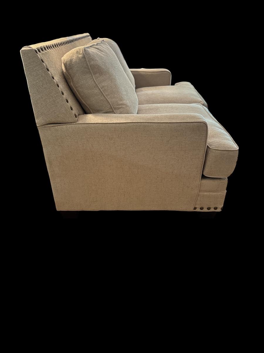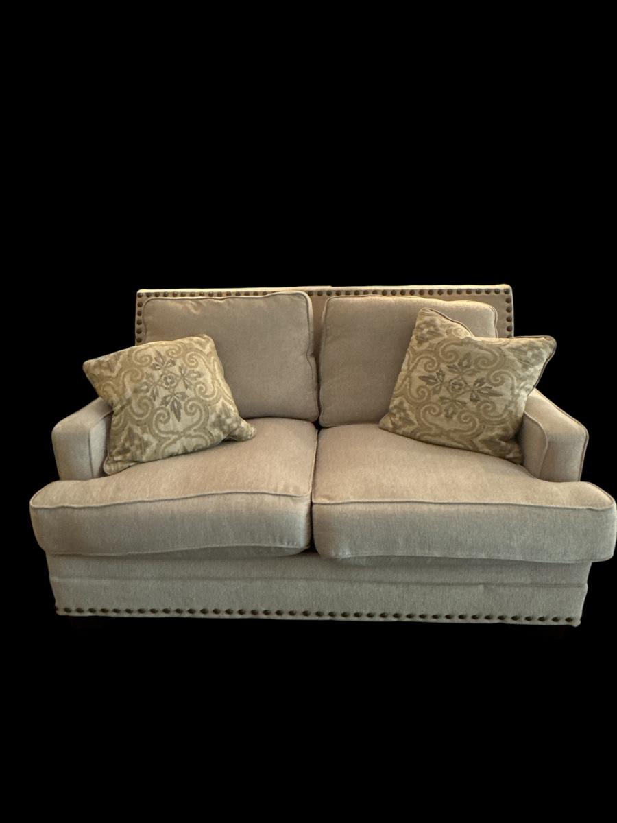 Elegant two-cushion loveseat in a soft neutral fabric, removable back cushions, and decorative nailhead trim along the back and base. Includes two coordinating patterned throw pillows. Clean and in excellent condition—comfortable and versatile for any living space.