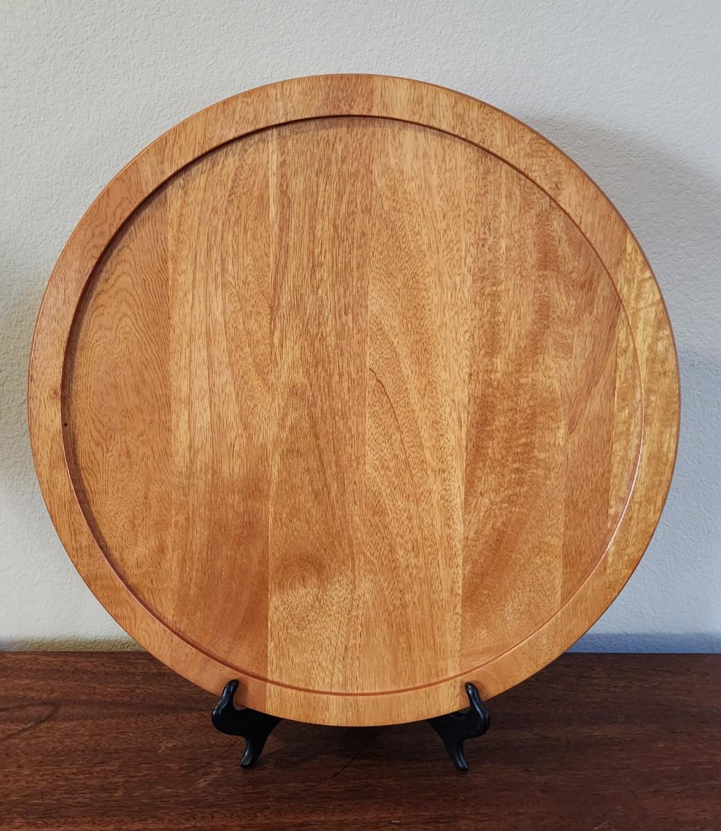 It has a light rim around the edge so nothing slips off when turning the board. 18" diameter, 1.75" tall.