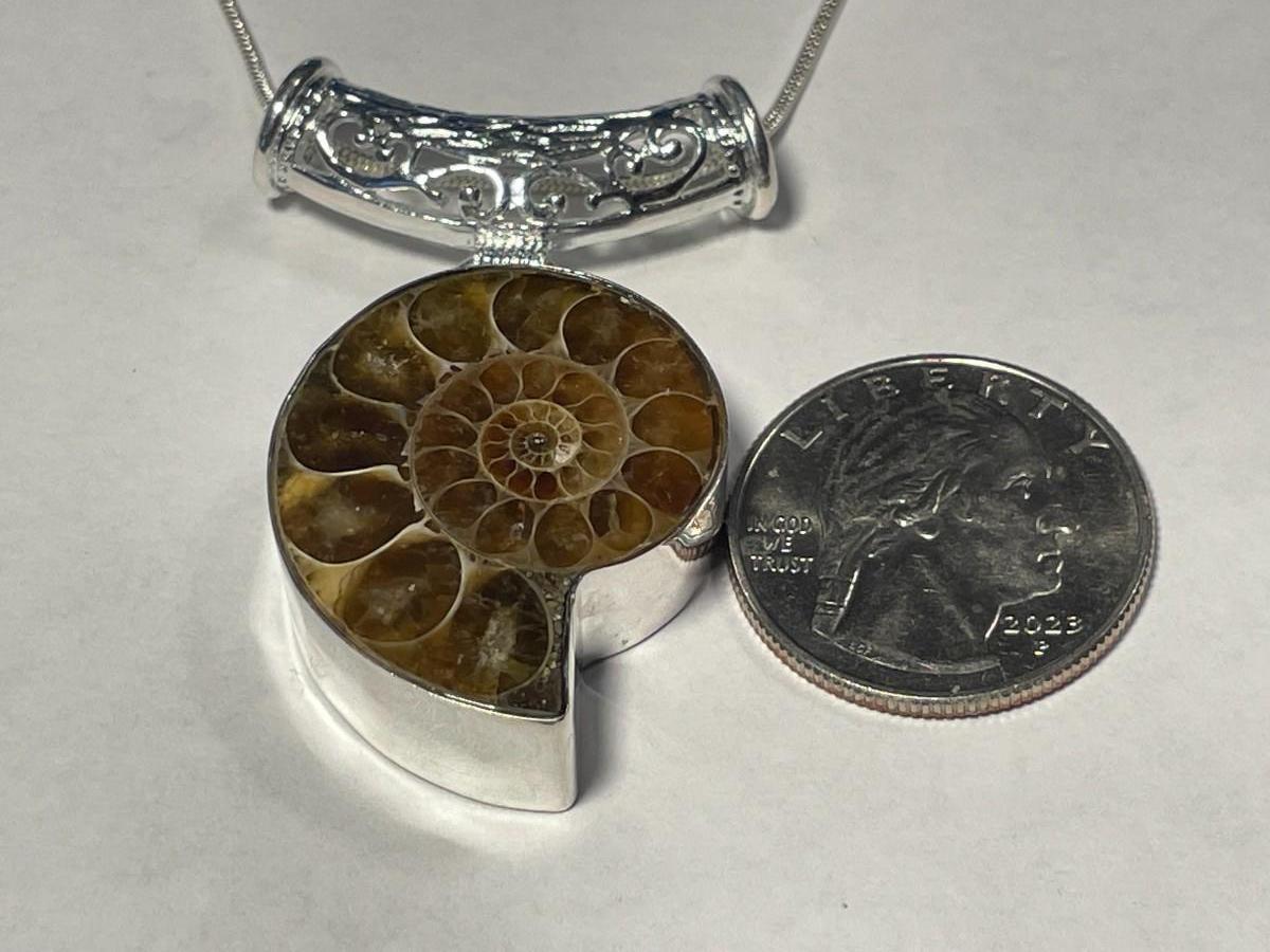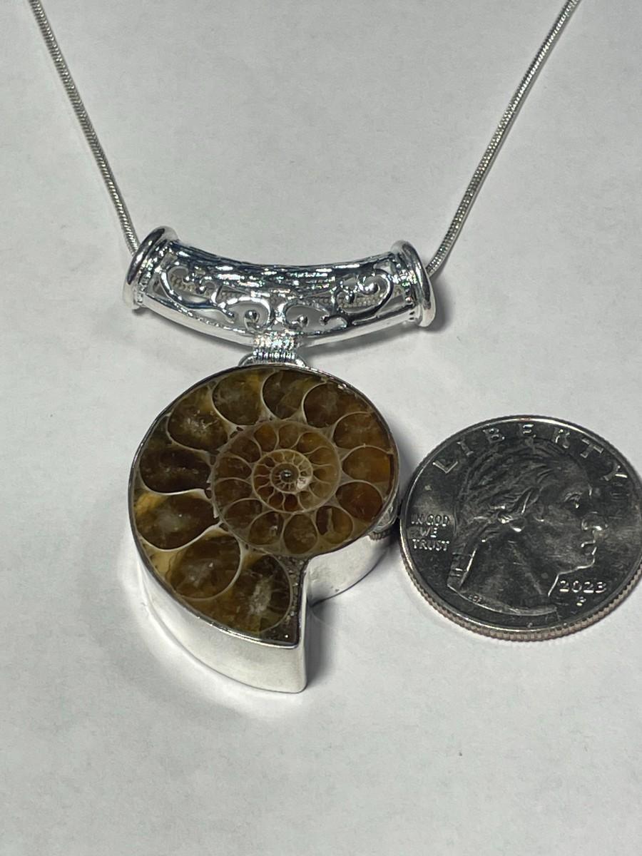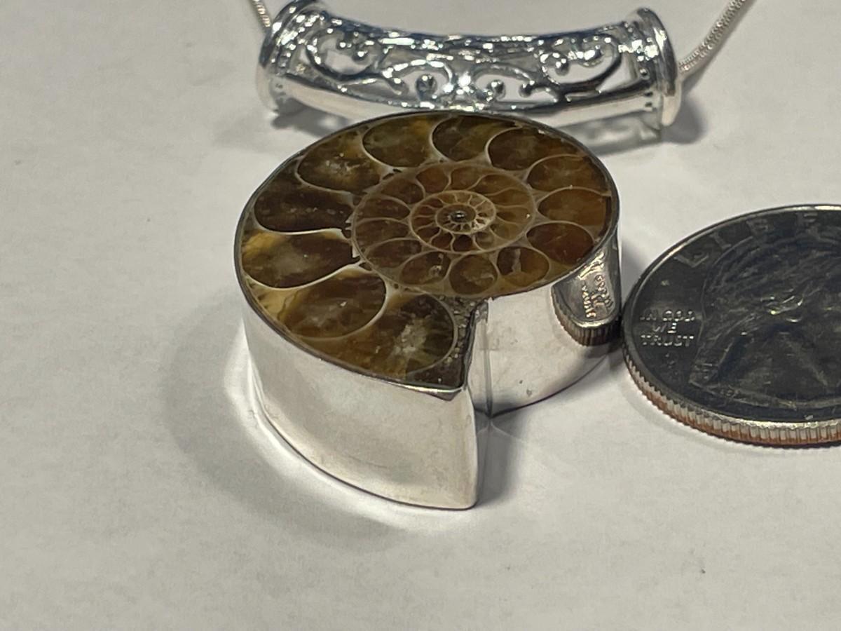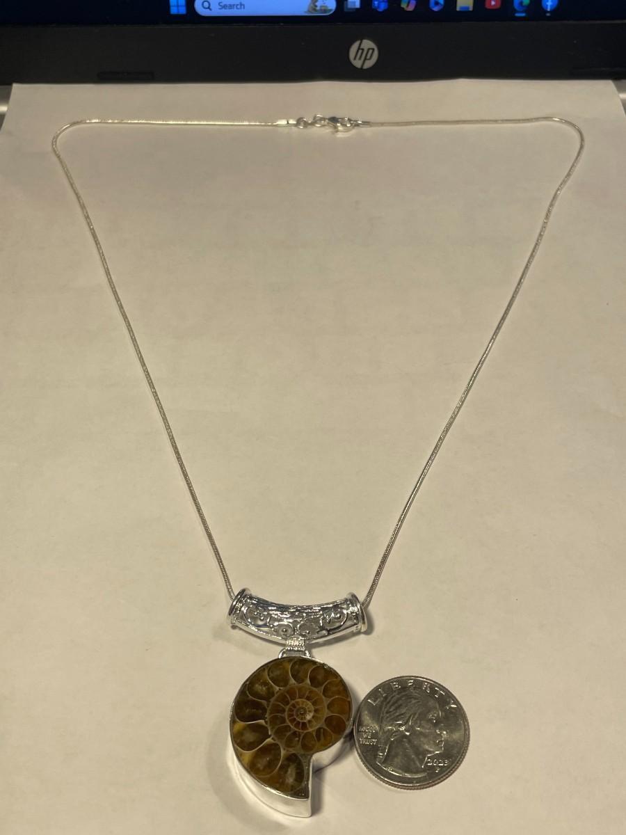 Never Worn Condition Sterling Silver Natural Ammonite Fossil Pendant Bezel Set on Sterling Silver 24" Chain as Pic'd. $5 DOMESTIC SHIPPING.