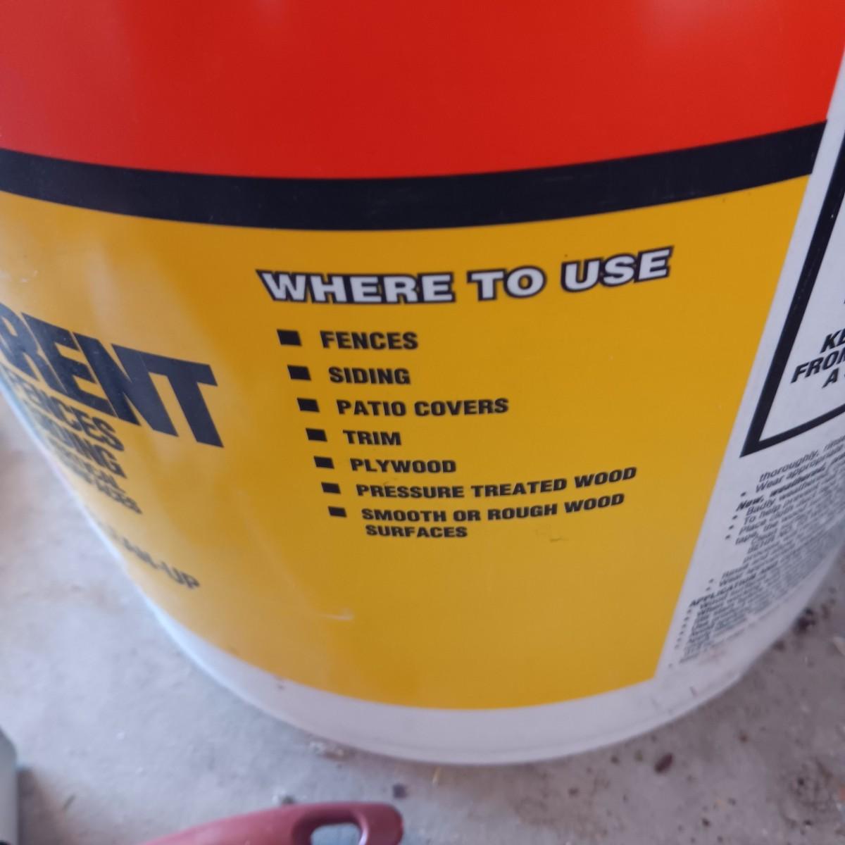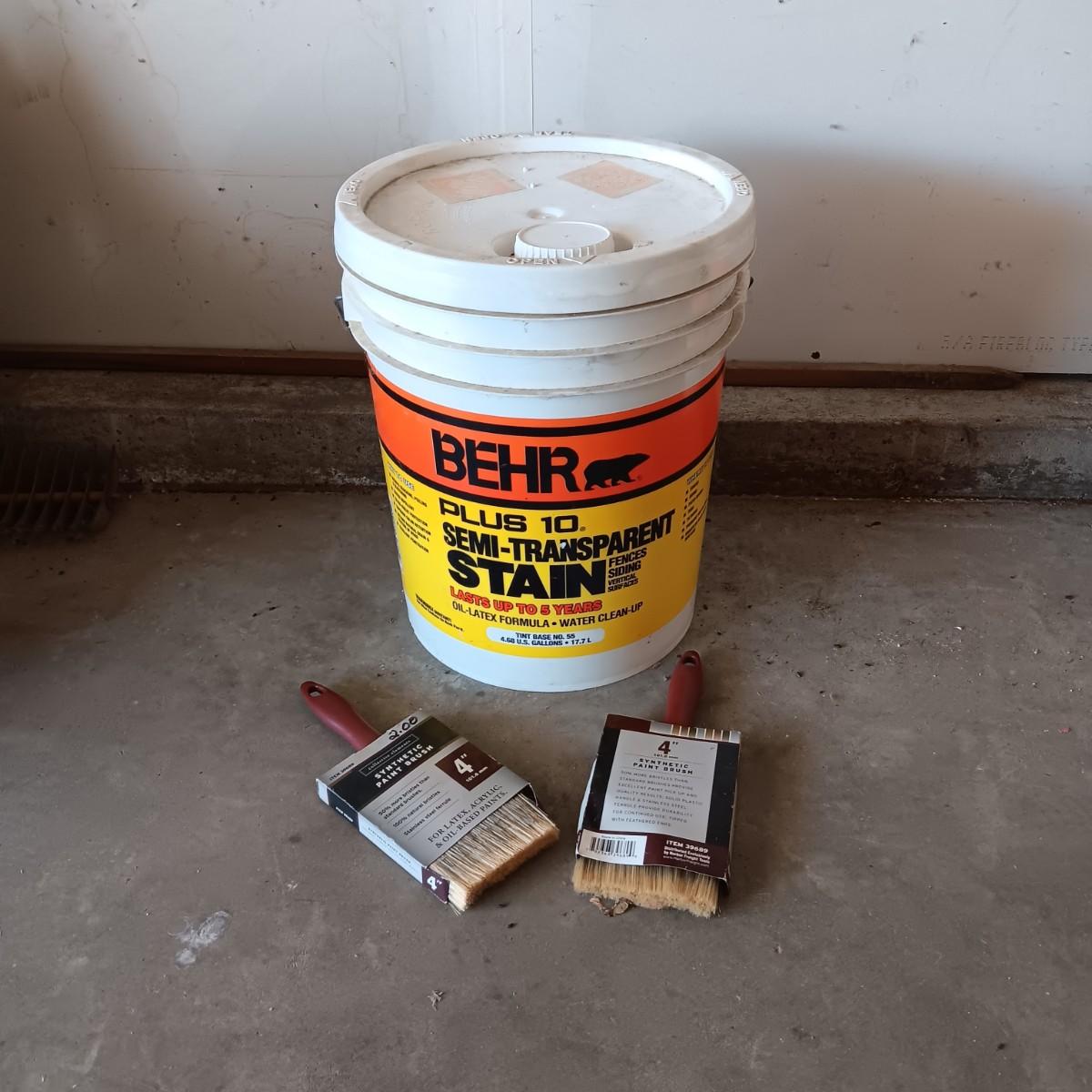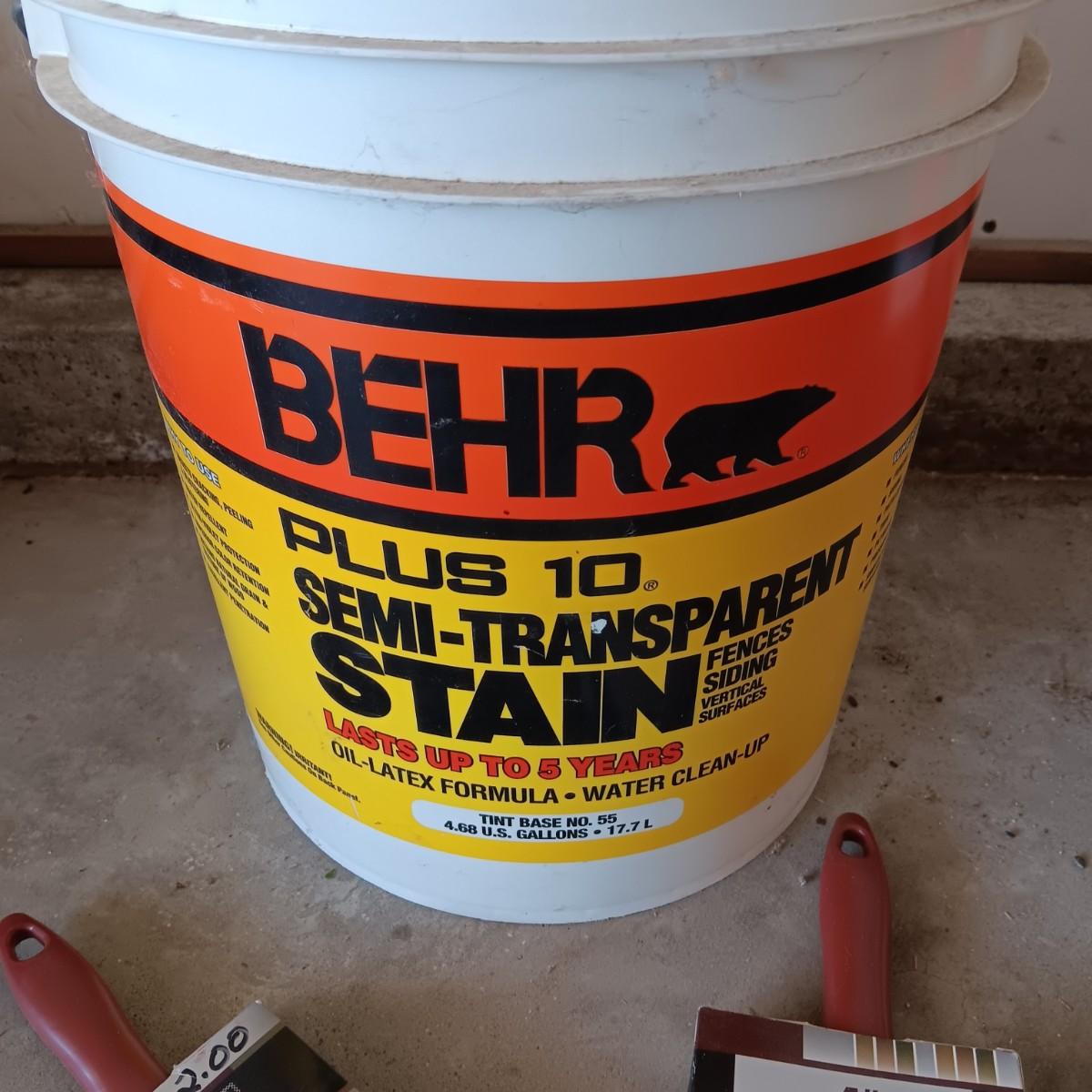 NEW 5 GALLON BUCKET OF BEHR SEMI-TRANSPARENT STAIN AND 2 BRUSHES