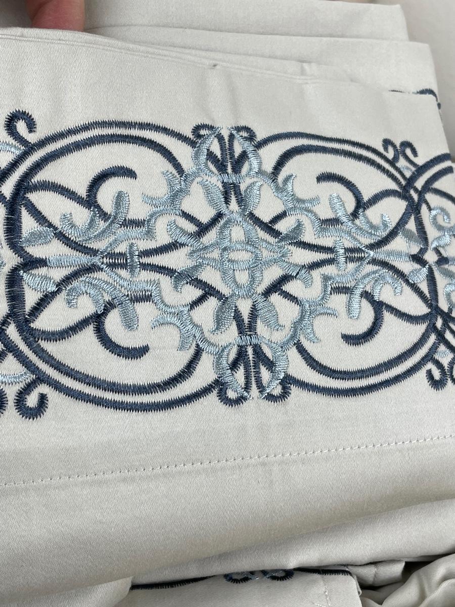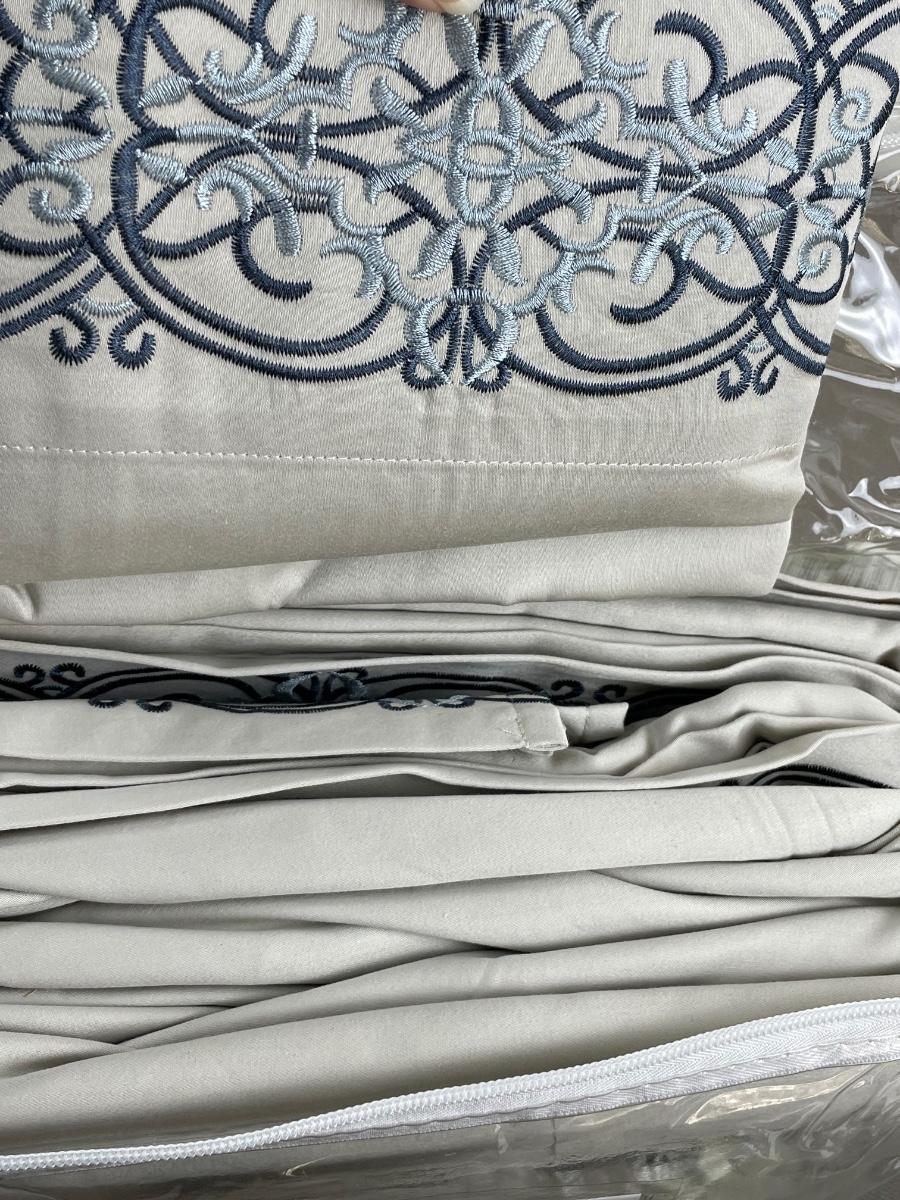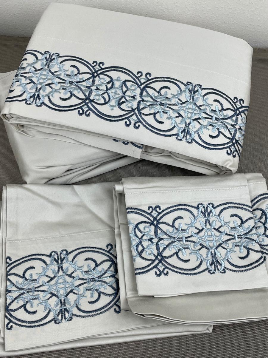 Taupe color with blue embroidery. 4 piece set, new in bag. This was a floor display so bag is labeled that way. New, never used.