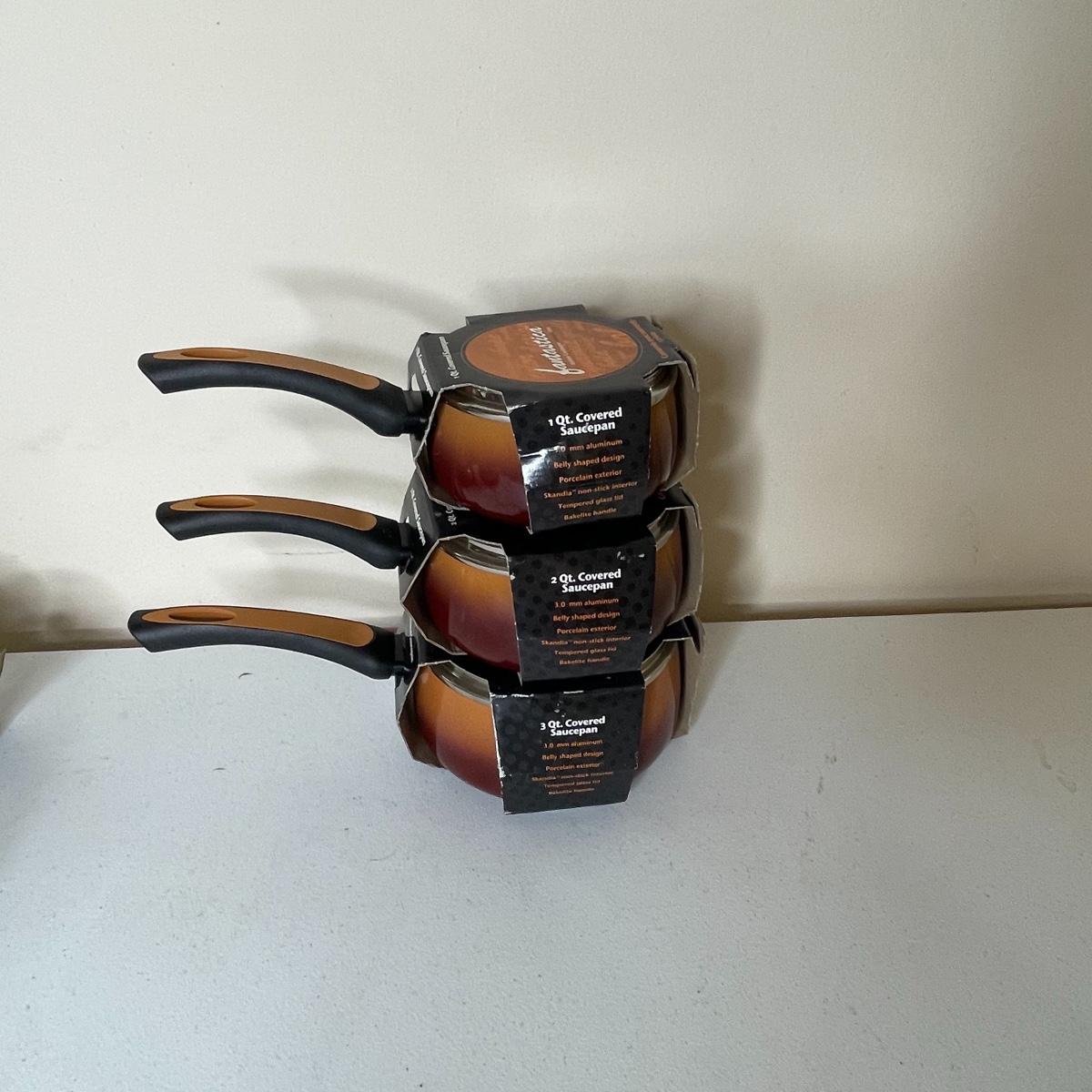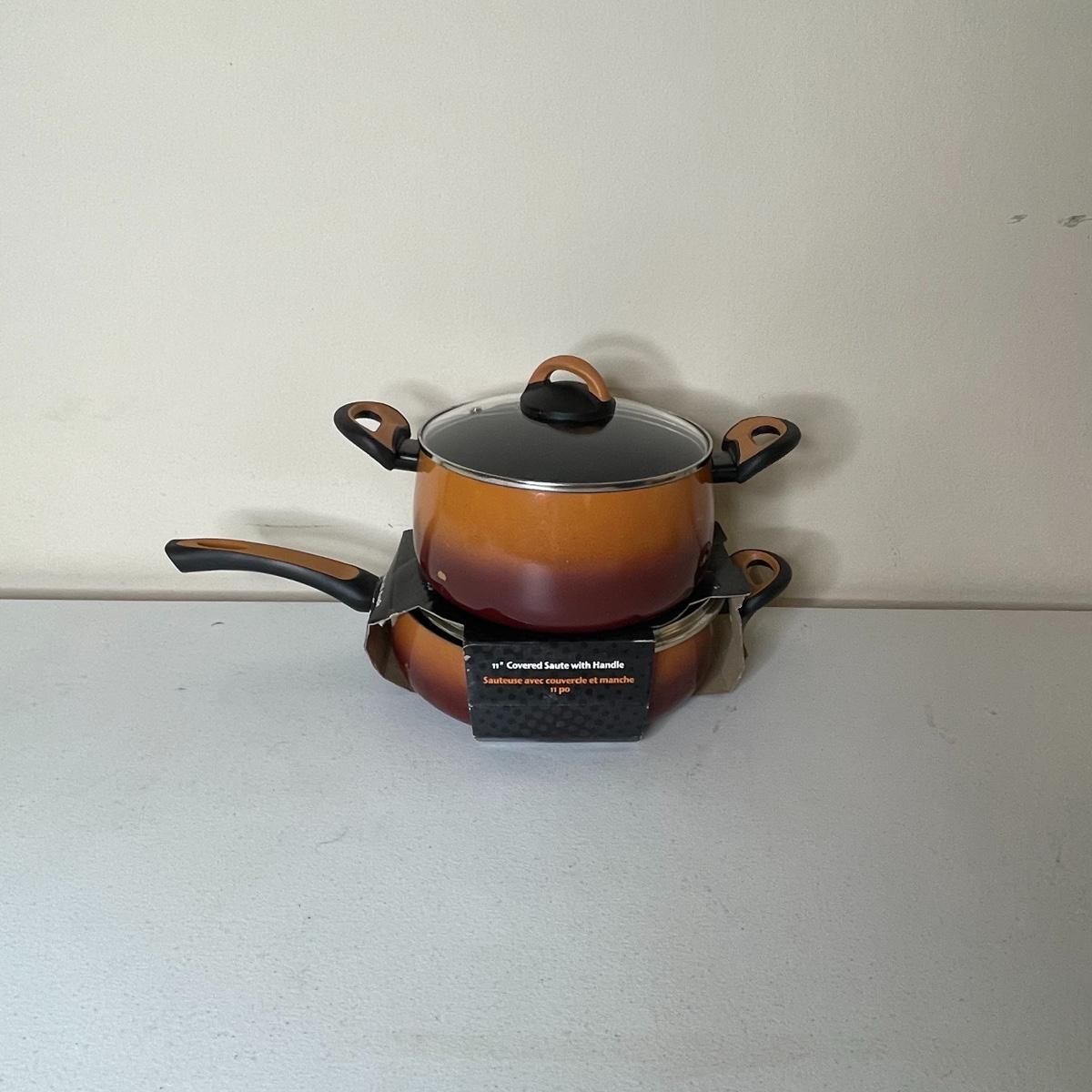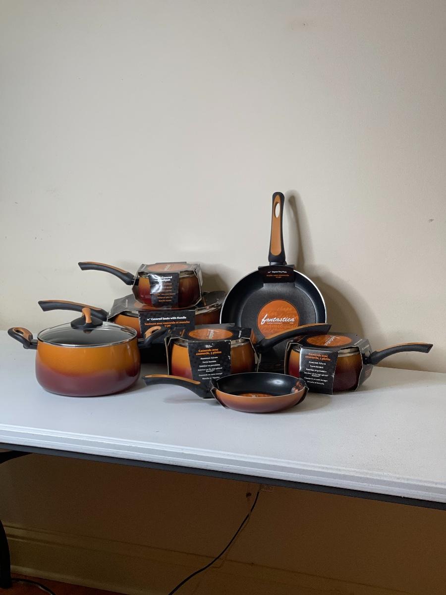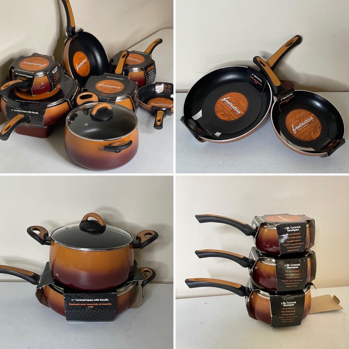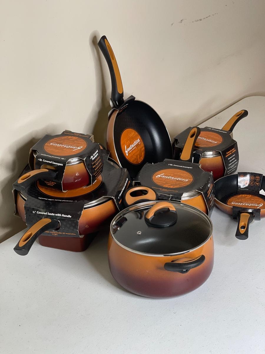 “Shadow Line” has an ombré look. Set includes: 1qt, 2qt, and 3qt covered saucepans. 11” covered Sauté with Handle. Covered stock pot with handles. 10” and 8” open fry pans. All have been stored and never used.