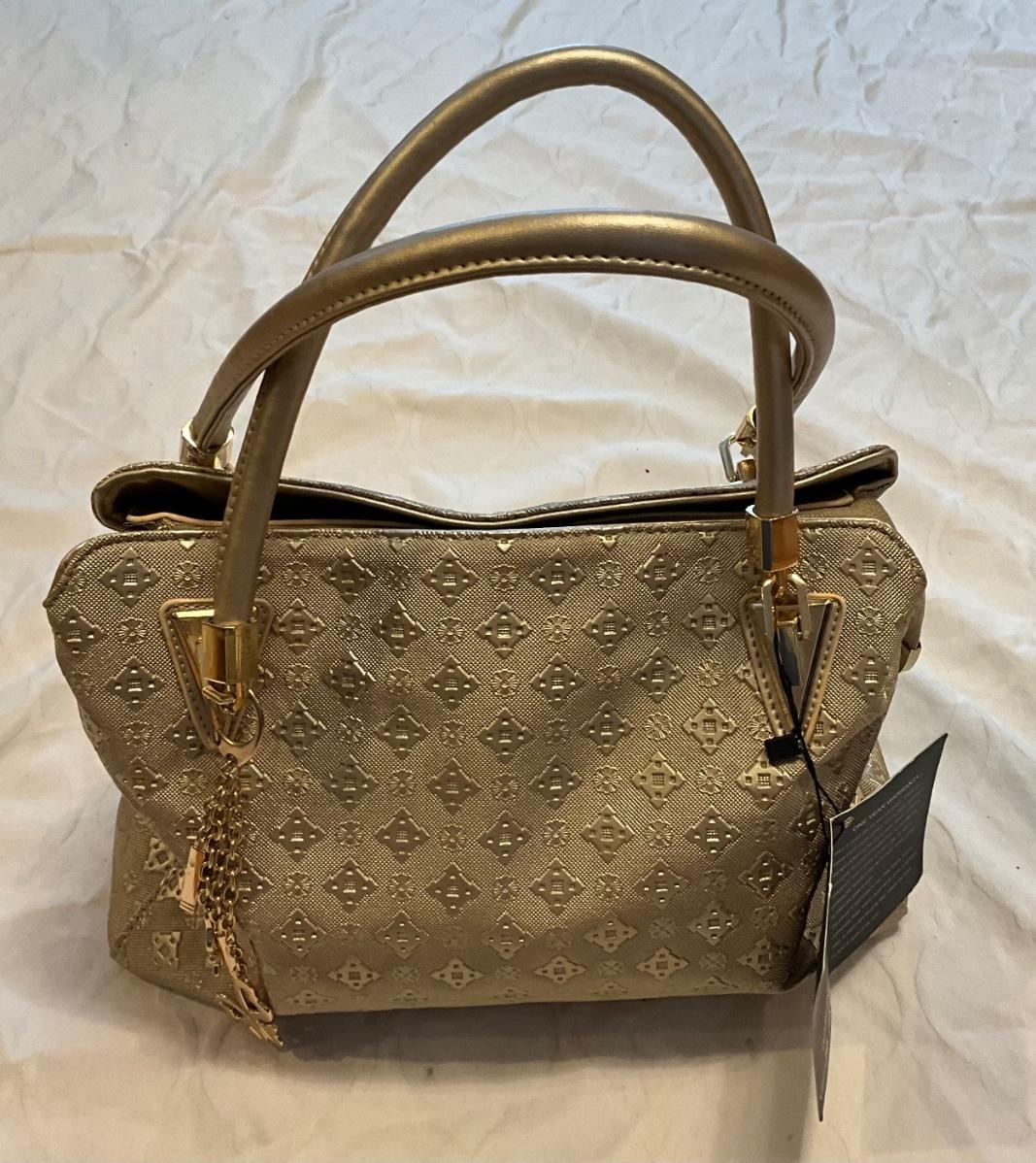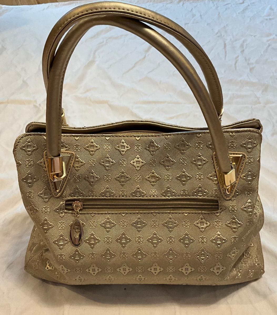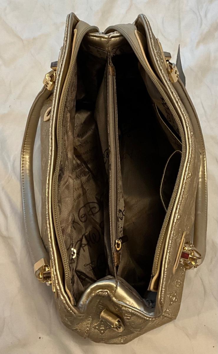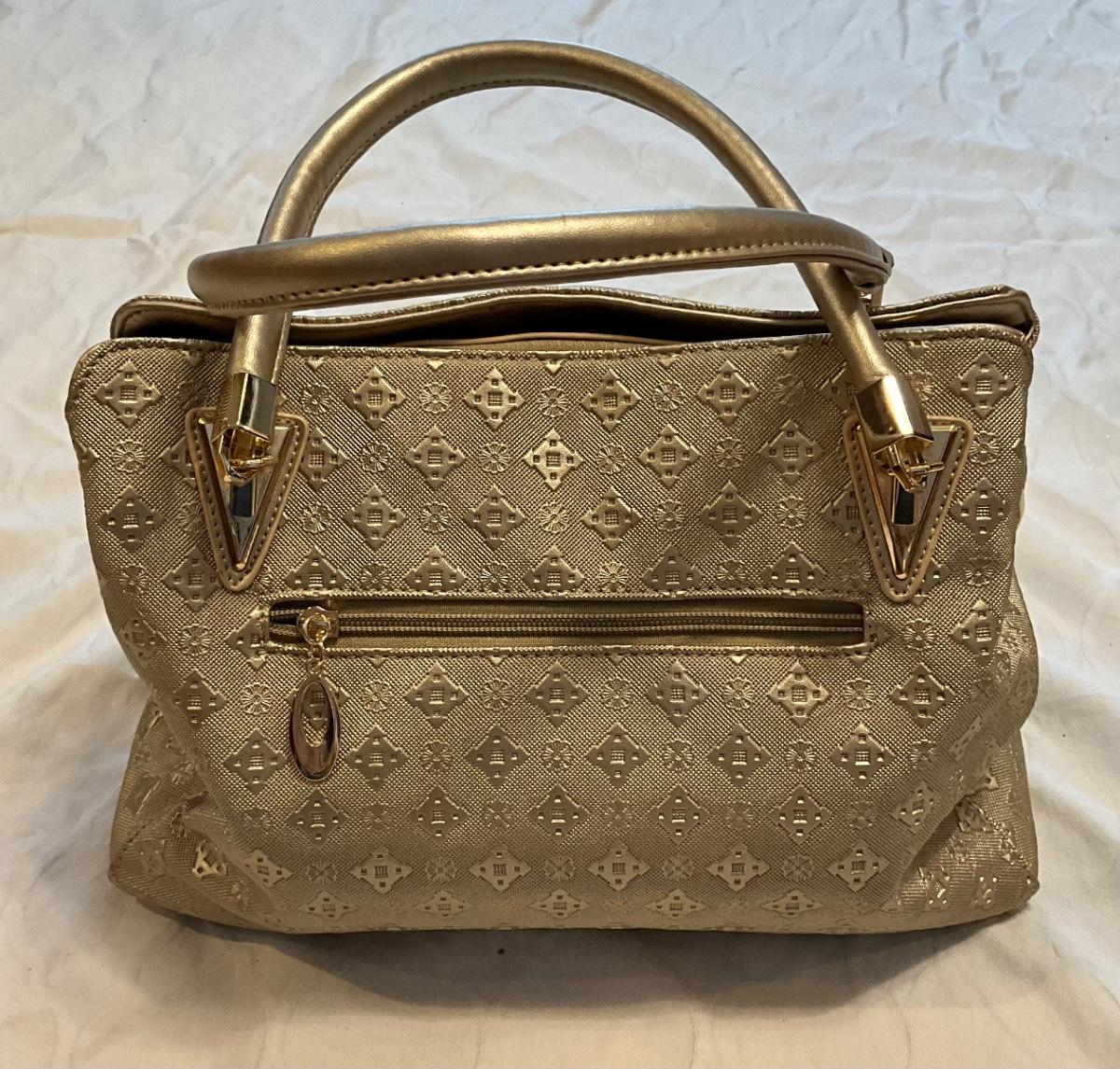 Gold purse with gold metal details 1 exterior pocket, 4 interior pockets