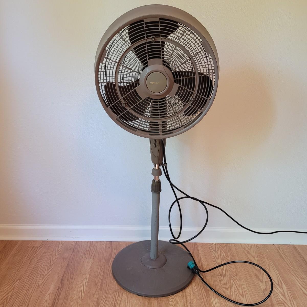 This lot includes a New Air brand 18" outdoor misting fan. This fan was designed for outdoor or patio use. It hooks up to a wall outlet and a hose for an oscillating misting combination. It has three speed settings. One cord for power and one hose for water input. The fan itself measures 18"D x 40"H.