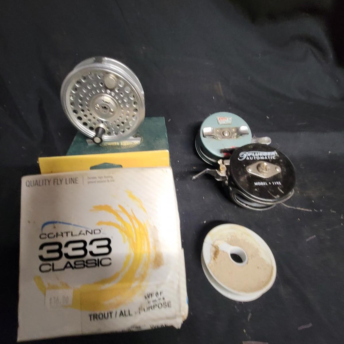 New Austin Forbes 3" silver fly reel. Has original box. Older Pflueger automatic fly reel, model #1195. Auto recall does still work. Heddon #5 automatic fly reel, auto recall does work. Also included is a Courtland 333 WF6 fly line in original packaging and a wire leader. Shipping available